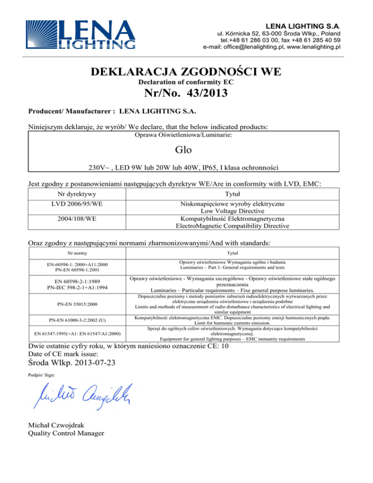 LENA LIGHTING S.A. ul. Kórnicka 52, 63-000 Środa Wlkp., Poland tel.+48 61 286 03 00, fax +48 61 285 40 59 e-mail: [email protected], www.lenalighting.pl DEKLARACJA ZGODNOŚCI WE Declaration of conformity EC Nr/No. 43/2013 Producent/ Manufacturer : LENA LIGHTING S.A. Niniejszym deklaruje, że wyrób/ We declare, that the below indicated products: Oprawa Oświetleniowa/Luminarie: Glo 230V~ , LED 9W lub 20W lub 40W, IP65, I klasa ochronności Jest zgodny z postanowieniami następujących dyrektyw WE/Are in conformity with LVD, EMC: Nr dyrektywy Tytuł LVD 2006/95/WE Niskonapięciowe wyroby elektryczne Low Voltage Directive Kompatybilność Elektromagnetyczna ElectroMagnetic Compatibility Directive 2004/108/WE Oraz zgodny z następującymi normami zharmonizowanymi/And with standards: Nr normy EN-60598-1: 2000+A11:2000 PN-EN 60598-1:2001 EN 60598-2-1:1989 PN-IEC 598-2-1+A1:1994 PN-EN 55015:2000 PN-EN 61000-3-2:2002 (U) EN 61547:1995(+A1: EN 61547/A1:2000) Tytuł Oprawy oświetleniowe Wymagania ogólne i badania Luminaries – Part 1: General requirements and tests Oprawy oświetleniowe - Wymagania szczegółowe - Oprawy oświetleniowe stałe ogólnego przeznaczenia Luminaries – Particular requirements – Fixe general purpose luminaries. Dopuszczalne poziomy i metody pomiarów zaburzeń radioelektrycznych wytwarzanych przez elektryczne urządzenia oświetleniowe i urządzenia podobne Limits and methods of measurement of radio disturbance characteristics of electrical lighting and similar equipment Kompatybilność elektromagnetyczna EMC. Dopuszczalne poziomy emisji harmonicznych prądu. Limit for harmonic currents emission. Sprzęt do ogólnych celów oświetleniowych. Wymagania dotyczące kompatybilności elektromagnetycznej. Equipment for general lighting purposes – EMC immunity requirements Dwie ostatnie cyfry roku, w którym naniesiono oznaczenie CE: 10 Date of CE mark issue: Środa Wlkp. 2013-07-23 Podpis/ Sign: Michał Czwojdrak Quality Control Manager