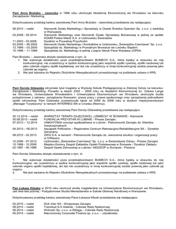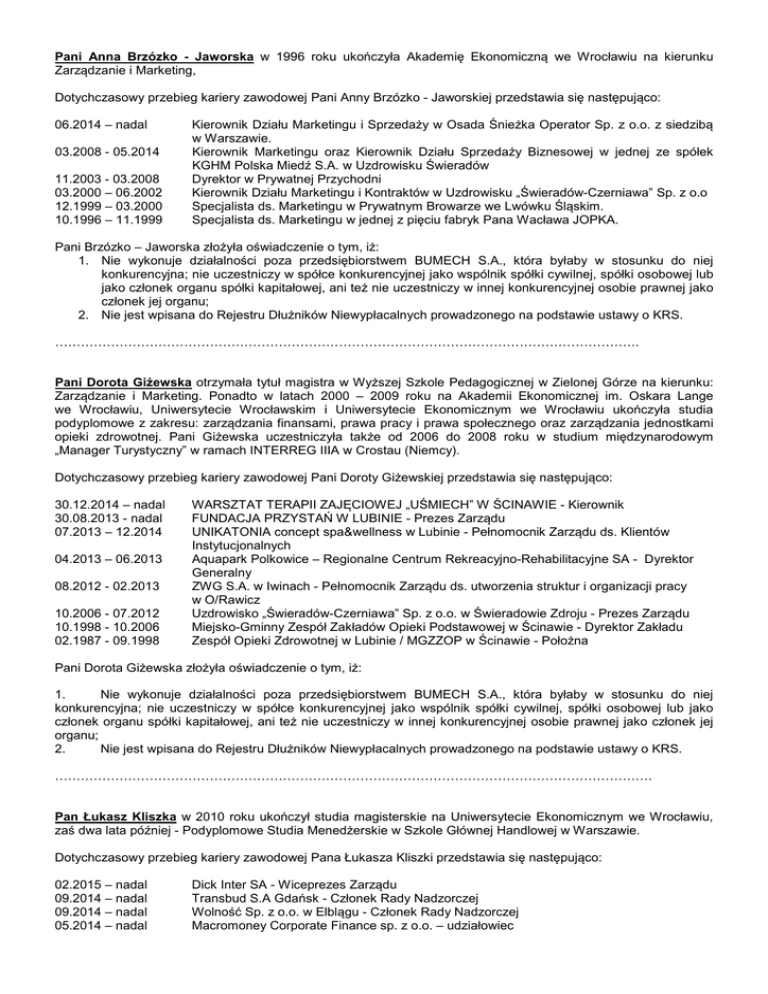 Pani Anna Brzózko - Jaworska w 1996 roku ukończyła Akademię Ekonomiczną we Wrocławiu na kierunku Zarządzanie i Marketing, Dotychczasowy przebieg kariery zawodowej Pani Anny Brzózko - Jaworskiej przedstawia się następująco: 06.2014 – nadal 03.2008 - 05.2014 11.2003 - 03.2008 03.2000 – 06.2002 12.1999 – 03.2000 10.1996 – 11.1999 Kierownik Działu Marketingu i Sprzedaży w Osada Śnieżka Operator Sp. z o.o. z siedzibą w Warszawie. Kierownik Marketingu oraz Kierownik Działu Sprzedaży Biznesowej w jednej ze spółek KGHM Polska Miedź S.A. w Uzdrowisku Świeradów Dyrektor w Prywatnej Przychodni Kierownik Działu Marketingu i Kontraktów w Uzdrowisku „Świeradów-Czerniawa” Sp. z o.o Specjalista ds. Marketingu w Prywatnym Browarze we Lwówku Śląskim. Specjalista ds. Marketingu w jednej z pięciu fabryk Pana Wacława JOPKA. Pani Brzózko – Jaworska złożyła oświadczenie o tym, iż: 1. Nie wykonuje działalności poza przedsiębiorstwem BUMECH S.A., która byłaby w stosunku do niej konkurencyjna; nie uczestniczy w spółce konkurencyjnej jako wspólnik spółki cywilnej, spółki osobowej lub jako członek organu spółki kapitałowej, ani też nie uczestniczy w innej konkurencyjnej osobie prawnej jako członek jej organu; 2. Nie jest wpisana do Rejestru Dłużników Niewypłacalnych prowadzonego na podstawie ustawy o KRS. ………………………………………………………………………………………………………………………. Pani Dorota Giżewska otrzymała tytuł magistra w Wyższej Szkole Pedagogicznej w Zielonej Górze na kierunku: Zarządzanie i Marketing. Ponadto w latach 2000 – 2009 roku na Akademii Ekonomicznej im. Oskara Lange we Wrocławiu, Uniwersytecie Wrocławskim i Uniwersytecie Ekonomicznym we Wrocławiu ukończyła studia podyplomowe z zakresu: zarządzania finansami, prawa pracy i prawa społecznego oraz zarządzania jednostkami opieki zdrowotnej. Pani Giżewska uczestniczyła także od 2006 do 2008 roku w studium międzynarodowym „Manager Turystyczny” w ramach INTERREG IIIA w Crostau (Niemcy). Dotychczasowy przebieg kariery zawodowej Pani Doroty Giżewskiej przedstawia się następująco: 30.12.2014 – nadal 30.08.2013 - nadal 07.2013 – 12.2014 04.2013 – 06.2013 08.2012 - 02.2013 10.2006 - 07.2012 10.1998 - 10.2006 02.1987 - 09.1998 WARSZTAT TERAPII ZAJĘCIOWEJ „UŚMIECH” W ŚCINAWIE - Kierownik FUNDACJA PRZYSTAŃ W LUBINIE - Prezes Zarządu UNIKATONIA concept spa&wellness w Lubinie - Pełnomocnik Zarządu ds. Klientów Instytucjonalnych Aquapark Polkowice – Regionalne Centrum Rekreacyjno-Rehabilitacyjne SA - Dyrektor Generalny ZWG S.A. w Iwinach - Pełnomocnik Zarządu ds. utworzenia struktur i organizacji pracy w O/Rawicz Uzdrowisko „Świeradów-Czerniawa” Sp. z o.o. w Świeradowie Zdroju - Prezes Zarządu Miejsko-Gminny Zespół Zakładów Opieki Podstawowej w Ścinawie - Dyrektor Zakładu Zespół Opieki Zdrowotnej w Lubinie / MGZZOP w Ścinawie - Położna Pani Dorota Giżewska złożyła oświadczenie o tym, iż: 1. Nie wykonuje działalności poza przedsiębiorstwem BUMECH S.A., która byłaby w stosunku do niej konkurencyjna; nie uczestniczy w spółce konkurencyjnej jako wspólnik spółki cywilnej, spółki osobowej lub jako członek organu spółki kapitałowej, ani też nie uczestniczy w innej konkurencyjnej osobie prawnej jako członek jej organu; 2. Nie jest wpisana do Rejestru Dłużników Niewypłacalnych prowadzonego na podstawie ustawy o KRS. …………………………………………………………………………………………………………………………. Pan Łukasz Kliszka w 2010 roku ukończył studia magisterskie na Uniwersytecie Ekonomicznym we Wrocławiu, zaś dwa lata później - Podyplomowe Studia Menedżerskie w Szkole Głównej Handlowej w Warszawie. Dotychczasowy przebieg kariery zawodowej Pana Łukasza Kliszki przedstawia się następująco: 02.2015 – nadal 09.2014 – nadal 09.2014 – nadal 05.2014 – nadal Dick Inter SA - Wiceprezes Zarządu Transbud S.A Gdańsk - Członek Rady Nadzorczej Wolność Sp. z o.o. w Elblągu - Członek Rady Nadzorczej Macromoney Corporate Finance sp. z o.o. – udziałowiec 01.2014 – nadal 09.2012 - 10.2013 09.2012 - 10.2013 12.2010 - 08.2012 11.2010 - 08.2012 07.2010 - 11.2010 07.2009 - 07.2010 06.2008 - 07.2009 12.2007 - 06.2008 06.2007 - 12.2007 DICK 2000 - Dyrektor Zarządzający Dom Maklerski Investments SA - Dyrektor Departamentu Sprzedaży Investments S.A. - Dyrektor Departamentu Sprzedaży Dom Inwestycyjny Investors S.A. - Dyrektor Sprzedaży Investors TFI S.A. - Dyrektor Sprzedaży Funduszy Zamkniętych Open Finance S.A. - Planer Finansowy Open Finance S.A. - Doradca Finansowy Expander Advisors Sp z o.o. - Doradca Finansowy Lukas Bank S.A. - Doradca ds. MSP Lukas Bank S.A. - Doradca Junior Pan Łukasz Kliszka złożył oświadczenie o tym, iż: 1. Nie wykonuje działalności poza przedsiębiorstwem BUMECH S.A., która byłaby w stosunku do niej konkurencyjna; nie uczestniczy w spółce konkurencyjnej jako wspólnik spółki cywilnej, spółki osobowej lub jako członek organu spółki kapitałowej, ani też nie uczestniczy w innej konkurencyjnej osobie prawnej jako członek jej organu; 2. Nie jest wpisany do Rejestru Dłużników Niewypłacalnych prowadzonego na podstawie ustawy o KRS. …………………………………………………………………………………………………………………………. Pan Piotr Wojnar jest adwokatem, członkiem Okręgowej Rady Adwokackiej w Warszawie. Ukończył studia prawnicze na Wydziale Prawa i Administracji Uniwersytetu Warszawskiego. Piotr Wojnar jest wspólnikiem i Partnerem Zarządzającym Kancelarii Adwokackiej „Wojnar, Smołuch i Wspólnicy Adwokaci i Radcowie Prawni Spółka Partnerska”. Od początku swojej kariery zawodowej związany jest z rynkiem kapitałowym. W latach 1991 – 1994 pracował w Komisji Papierów Warto