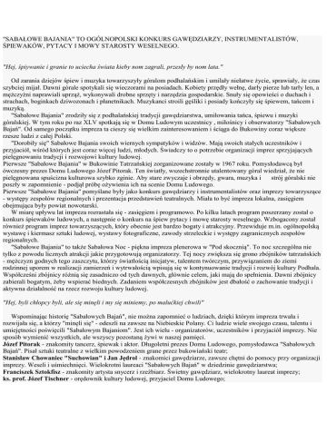 "SABAŁOWE BAJANIA" TO OGÓLNOPOLSKI KONKURS GAWĘDZIARZY, INSTRUMENTALISTÓW, ŚPIEWAKÓW, PYTACY I MOWY STAROSTY WESELNEGO. "Hej, śpiywanie i granie to uciecha świata kieby nom zagrali, przesły by nom lata." Od zarania dziejów śpiew i muzyka towarzyszyły góralom podhalańskim i umilały niełatwe życie, sprawiały, że czas szybciej mijał. Dawni górale spotykali się wieczorami na posiadach. Kobiety przędły wełnę, darły pierze lub tarły len, a mężczyźni naprawiali uprząż, wykonywali drobne sprzęty i narzędzia gospodarskie. Snuły się opowieści o duchach i strachach, boginkach dziwozonach i płanetnikach. Muzykanci stroili gęśliki i posiady kończyły się śpiewem, tańcem i muzyką. "Sabałowe Bajania" zrodziły się z podhalańskiej tradycji gawędziarstwa, umiłowania tańca, śpiewu i muzyki góralskiej. W tym roku po raz XLV spotkają się w Domu Ludowym uczestnicy , miłośnicy i obserwatorzy "Sabałowych Bajań". Od samego początku impreza ta cieszy się wielkim zainteresowaniem i ściąga do Bukowiny coraz większe rzesze ludzi z całej Polski. "Dorobiły się" Sabałowe Bajania swoich wiernych sympatyków i widzów. Mają swoich stałych uczestników i przyjaciół, wśród których jest coraz więcej ludzi, młodych. Świadczy to o potrzebie organizacji imprez sprzyjających pielęgnowaniu tradycji i rozwojowi kultury ludowej. Pierwsze "Sabałowe Bajania" w Bukowinie Tatrzańskiej zorganizowane zostały w 1967 roku. Pomysłodawcą był ówczesny prezes Domu Ludowego Józef Pitorak. Ten światły, wszechstronnie utalentowany góral wiedział, że nie pielęgnowana spuścizna kulturowa szybko zginie. Aby stare zwyczaje i obrzędy, gwara, muzyka i strój góralski nie poszły w zapomnienie - podjął próbę ożywienia ich na scenie Domu Ludowego. Pierwsze "Sabałowe Bajania" pomyślane były jako konkurs gawędziarzy i instrumentalistów oraz imprezy towarzyszące - występy zespołów regionalnych i prezentacja przedstawień teatralnych. Miała to być impreza lokalna, zasięgiem obejmująca były powiat nowotarski. W miarę upływu lat impreza rozrastała się - zasięgiem i programowo. Po kilku latach program poszerzany został o konkurs śpiewaków ludowych, a następnie o konkurs na śpiew pytacy i mowę starosty weselnego. Wzbogacony został również program imprez towarzyszących, który obecnie jest bardzo bogaty i atrakcyjny. Przewiduje m.in. ogólnopolską wystawę i kiermasz sztuki ludowej, wystawy fotograficzne, zawody strzeleckie i występy zagranicznych zespołów regionalnych. "Sabałowe Bajania" to także Sabałowa Noc - piękna impreza plenerowa w "Pod skocznią". To noc szczególna nie tylko z powodu licznych atrakcji jakie przygotowują organizatorzy. Tej nocy zwiększa się grono zbójników tatrzańskich - mężczyzn godnych tego zaszczytu, którzy światłością inicjatyw, talentem twórczym, przywiązaniem do ziemi rodzinnej uporem w realizacji zamierzeń i wytrwałością wpisują się w kontynuowanie tradycji i rozwój kultury Podhala. Współcześni zbójnicy różnią się zasadniczo od tych dawnych, głównie celem, jaki mają do spełnienia. Dawni zbójnicy zabierali bogatym, żeby wspierać biednych. Zadaniem współczesnych zbójników jest dbałość o zachowanie tradycji i aktywna działalność na rzecz rozwoju kultury ludowej. "Hej, byli chłopcy byli, ale się minęli i my się miniemy, po malućkiej chwili" Wspominając historię "Sabałowych Bajań", nie można zapomnieć o ludziach, dzięki którym impreza trwała i rozwijała się, a którzy "minęli się" - odeszli na zawsze na Niebieskie Polany. Ci ludzie wiele swojego czasu, talentu i umiejętności poświęcili "Sabałowym Bajaniom". Jest ich wielu - organizatorów, uczestników i przyjaciół imprezy. Nie sposób wymienić wszystkich, ale wszyscy pozostaną żywi w naszej pamięci. Józef Pitorak - znakomity tancerz, śpiewak i aktor. Długoletni prezes Domu Ludowego, pomysłodawca "Sabałowych Bajań". Pisał sztuki teatralne z wielkim powodzeniem grane przez bukowiański teatr; Stanisław Chowaniec "Suchowian" i Jan Jędrol - znakomici gawędziarze, zawsze chętni do pomocy przy organizacji imprezy. Weseli i uśmiechnięci. Wielokrotni laureaci "Sabałowych Bajań" w dziedzinie gawędziarstwa; Franciszek Sztokfisz - znakomity artysta snycerz i rzeźbiarz. Świetny gawędziarz, wielokrotny laureat imprezy; ks. prof. Józef Tischner - orędownik kultury ludowej, przyjaciel Domu Ludowego; Zbigniew Ćwiżewicz - godnie kontynuujący dzieło swojego Ojca Franciszka Ćwiżewicza. Aktywny działacz podhalańskiego ruchu regionalnego, prezes Domu Ludowego, wielokrotny uczestnik i laureat "Sabałowych Bajań"; Stanisław Król - długoletni prezes Domu Ludowego, organizator imprezy; Stanisław Buńda - organizator imprezy, długoletni dyrektor GOK-u świetny gawędziarz, laureat "Sabałowych Bajań"; prof. dr hab. Roman Reinfuss - etnograf - długoletni przewodniczący komisji oceniającej; prof. dr Józef Bubak - znawca podhalańskiej gwary, wiernie uczestniczący w pracach jury; Andrzej Florek Skupień ze Stołowego, Władysław Gądek, Stanisław Kurzeja ,Adam Doleżuchowicz, Tadeusz Staich, Adam Pach, Michał Wojciechowski. Wielu jeszcze muzykantów, gawędziarzy i śpiewaków odeszło na zawsze Wierzymy, że ciesząc swoimi talentami anioły na Niebieskich Polanach - jednocześnie uważnie obserwują nasze poczynania. "Coby nos nie zniewoliły miastowe zwycaje żeby my zachowali nase downe stare obycaje bo to by było smutne dlo całej Ojcyzny jakby w niej chybiało nasyj góralszczyzny". fragm. wiersza Anny Biedowej poetki bukowiańskiej. Na szczęście Bukowinie Tatrzańskiej nie grozi zniewolenie miastowymi zwyczajami. Żeby "nie chybiało nasyj góralszczyzny", troszczą się bukowiańscy ludzie kultury skupieni wokół Domu Ludowego. W ten sposób spełniają wolę dziadów i ojców - budowniczych Domu Ludowego. To oni - wraz z inicjatorem budowy Fran