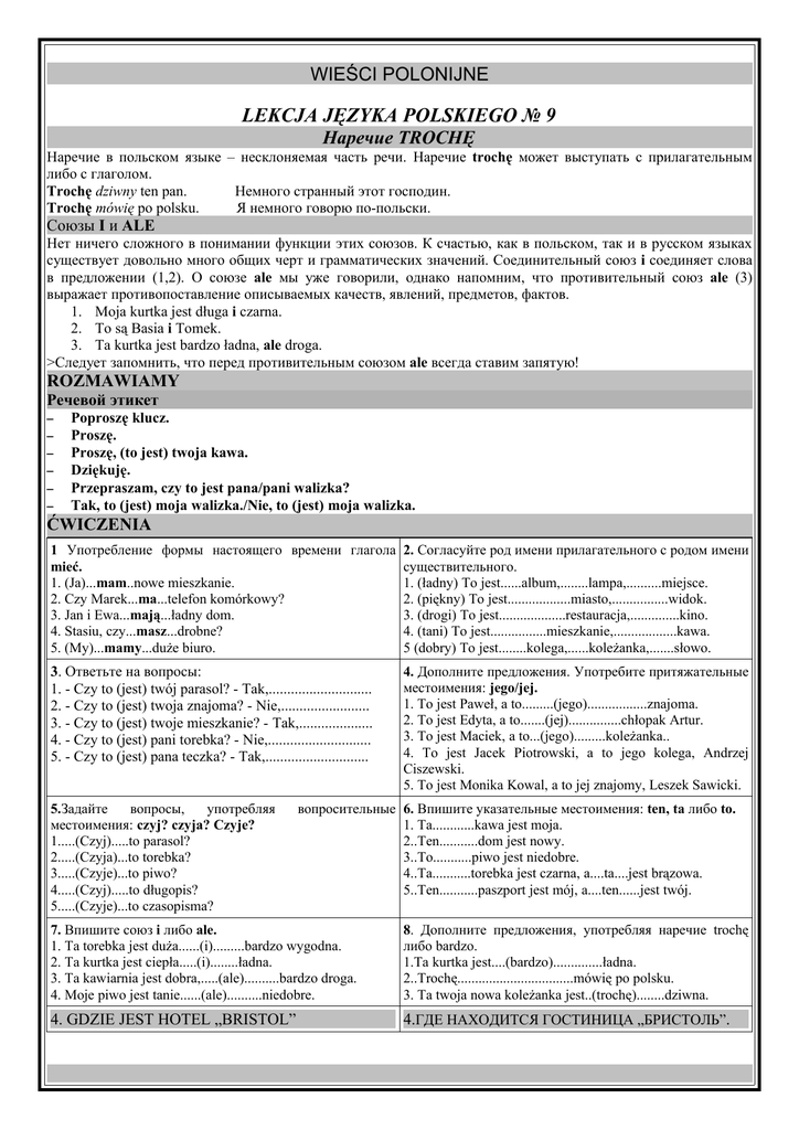 WIEŚCI POLONIJNE LEKCJA JĘZYKA POLSKIEGO № 9 Наречие TROCHĘ Наречие в польском языке – несклоняемая часть речи. Наречие trochę может выступать c прилагательным либо с глаголом. Trochę dziwny ten pan. Немного странный этот господин. Trochę mówię po polsku. Я немного говорю по-польски. Союзы I и ALE Нет ничего сложного в понимании функции этих союзов. К счастью, как в польском, так и в русском языках существует довольно много общих черт и грамматических значений. Соединительный союз i соединяет слова в предложении (1,2). О союзе ale мы уже говорили, однако напомним, что противительный союз ale (3) выражает противопоставление описываемых качеств, явлений, предметов, фактов. 1. Moja kurtka jest długa i czarna. 2. To są Basia i Tomek. 3. Ta kurtka jest bardzo ładna, аle droga. >Следует запомнить, что перед противительным союзом ale всегда ставим запятую! ROZMAWIAMY Речевой этикет – – – – – – Poproszę klucz. Proszę. Proszę, (to jest) twoja kawa. Dziękuję. Przepraszam, czy to jest pana/pani walizka? Tak, to (jest) moja walizka./Nie, to (jest) moja walizka. ĆWICZENIA 1 Употребление формы настоящего времени глагола 2. Согласуйте род имени прилагательного с родом имени mieć. существительного. 1. (Ja)...mam..nowe mieszkanie. 1. (ładny) To jest......album,........lampa,..........miejsce. 2. Czy Marek...ma...telefon komórkowy? 2. (piękny) To jest..................miasto,................widok. 3. Jan i Ewa...mają...ładny dom. 3. (drogi) To jest...................restauracja,..............kino. 4. Stasiu, czy...masz...drobne? 4. (tani) To jest................mieszkanie,..................kawa. 5. (My)...mamy...duże biuro. 5 (dobry) To jest........kolega,......koleżanka,.......słowo. 3. Ответьте на вопросы: 1. - Czy to (jest) twój parasol? - Tak,............................ 2. - Czy to (jest) twoja znajoma? - Nie,........................ 3. - Czy to (jest) twoje mieszkanie? - Tak,.................... 4. - Czy to (jest) pani torebka? - Nie,............................ 5. - Czy to (jest) pana teczka? - Tak,............................ 5.Задайте вопросы, употребляя местоимения: czyj? czyja? Czyje? 1.....(Czyj).....to parasol? 2.....(Czyja)...to torebka? 3.....(Czyje)...to piwo? 4.....(Czyj).....to długopis? 5.....(Czyje)...to czasopisma? 4. Дополните предложения. Употребите притяжательные местоимения: jego/jej. 1. To jest Paweł, a to.........(jego).................znajoma. 2. To jest Edyta, a to.......(jej)...............chłopak Artur. 3. To jest Maciek, a to...(jego).........koleżanka.. 4. To jest Jacek Piotrowski, a to jego kolega, Andrzej Ciszewski. 5. To jest Monika Kowal, a to jej znajomy, Leszek Sawicki. вопросительные 6. Впишите указательные местоимения: ten, ta либо to. 1. Ta............kawa jest moja. 2..Ten...........dom jest nowy. 3..To...........piwo jest niedobre. 4..Ta...........torebka jest czarna, a....ta....jest brązowa. 5..Ten...........paszport jest mój, a....ten......jest twój. 7. Впишите союз i либо ale. 1. Тa torebka jest duża......(i).........bardzo wygodna. 2. Ta kurtka jest ciepła.....(i)........ładna. 3. Ta kawiarnia jest dobra,.....(ale)..........bardzo droga. 4. Moje piwo jest tanie......(ale)..........niedobre. 8. Дополните предложения, употребляя наречие trochę либо bardzo. 1.Ta kurtka jest....(bardzo)..............ładna. 2..Trochę.................................mówię po polsku. 3. Ta twoja nowa koleżanka jest..(trochę)........dziwna. 4. GDZIE JEST HOTEL „BRISTOL” 4.ГДЕ НАХОДИТСЯ ГОСТИНИЦА „БРИСТОЛЬ”. WIEŚCI POLONIJNE Nowik: - Przepraszam, gdzie jest hotel „Bristol”? Pani X: - O tam, prosto i w lewo. Nowik: - Czy to jest daleko? Pani X: - Nie? Bardzo blisko, Nowik: - Przepraszam, czy pan wie, gdzie jest ulica Widok? Pani Y: - Niestety nie wiem. Nowik: - Przepraszam bardzo, czy państwo wiedzą, gdzie jest ulica Widok? Państwo Z: - Proszę iść prosto, a potem w prawo i cały czas prosto. Nowik: - Dziękuję. Państwo Z: - Nie ma za co. Новик: - Извините, где находится гостиница „Бристоль”? Прохожая – Вот там, прямо и налево. Новик: - Это далеко? Прохожая: - Нет, совсем близко. Новик: - Извините, вы не знаете, где улица Видок? Прохожий: - К сожалению, не знаю. Новик – Прошу прощения, вы не знаете, где улица Видок? Прохожие: - Идите прямо, а потом вправо и все время прямо. Новик: - Спасибо. Прохожие: - Не за что. Paweł: - Cześć Taniu! Co ty tu robisz? Tania: - Ja tu mieszkam. Paweł: - Ładne miejsce. Tania: - To prawda. A co ty tu robisz? Paweł: - Mam spotkanie. Ale to nic pilnego. (Czy ) masz ochotę na kawę? Tutaj na rogu jest bardzo miła kawiarnia. Tania: - Czemu nie... Paweł: - Zapraszam cię. Павел: - Привет, Таня! Что ты здесь делаешь? Таня: - Я здесь живу. Павел: - Красиво здесь. Таня: - 