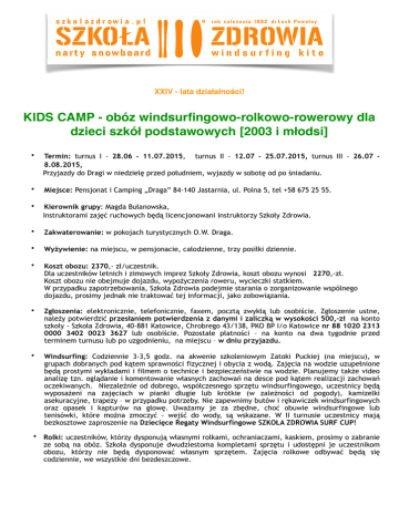 XXIV - lata działalności! KIDS CAMP - obóz windsurfingowo-rolkowo-rowerowy dla dzieci szkół podstawowych [2003 i młodsi] • Termin: turnus I - 28.06 - 11.07.2015, turnus II - 12.07 - 25.07.2015, turnus III - 26.07 8.08.2015, Przyjazdy do Dragi w niedzielę przed południem, wyjazdy w sobotę od po śniadaniu. • Miejsce: Pensjonat i Camping „Draga” 84-140 Jastarnia, ul. Polna 5, tel +58 675 25 55. • Kierownik grupy: Magda Bułanowska, Instruktorami zajęć ruchowych będą licencjonowani instruktorzy Szkoły Zdrowia. • Zakwaterowanie: w pokojach turystycznych O.W. Draga. • Wyżywienie: na miejscu, w pensjonacie, całodzienne, trzy posiłki dziennie. • Koszt obozu: 2370,- zł/uczestnik. Dla uczestników letnich i zimowych imprez Szkoły Zdrowia, koszt obozu wynosi 2270,-zł. Koszt obozu nie obejmuje dojazdu, wypożyczenia roweru, wycieczki statkiem. W przypadku zapotrzebowania, Szkoła Zdrowia podejmie starania o zorganizowanie wspólnego dojazdu, prosimy jednak nie traktować tej informacji, jako zobowiązania. • Zgłoszenia: elektronicznie, telefonicznie, faxem, pocztą zwykłą lub osobiście. Zgłoszenie ustne, należy potwierdzić przesłaniem potwierdzenia z danymi i zaliczką w wysokości 500,-zł na konto szkoły - Szkoła Zdrowia, 40-881 Katowice, Chrobrego 43/138, PKO BP I/o Katowice nr 88 1020 2313 0000 3402 0023 3627 lub osobiście. Pozostałe płatności – na konto na dwa tygodnie przed terminem turnusu lub po uzgodnieniu, na miejscu – w dniu przyjazdu. • Windsurfing: Codziennie 3-3,5 godz. na akwenie szkoleniowym Zatoki Puckiej (na miejscu), w grupach dobranych pod kątem sprawności fizycznej i obycia z wodą. Zajęcia na wodzie uzupełnione będą prostymi wykładami i filmem o technice i bezpieczeństwie na wodzie. Planujemy także video analizę tzn. oglądanie i komentowanie własnych zachowań na desce pod kątem realizacji zachowań oczekiwanych. Niezależnie od dobrego, współczesnego sprzętu windsurfingowego, uczestnicy będą wyposażeni na zajęciach w pianki długie lub krótkie (w zależności od pogody), kamizelki asekuracyjne, trapezy – w przypadku potrzeby. Nie zapewnimy butów i rękawiczek windsurfingowych oraz opasek i kapturów na głowę. Uważamy je za zbędne, choć obuwie windsurfingowe lub tenisówki, które można zmoczyć - wejść do wody, są wskazane. W II turnusie uczestnicy mają bezkosztowe zaproszenie na Dziecięce Regaty Windsurfingowe SZKOŁA ZDROWIA SURF CUP! • Rolki: uczestników, którzy dysponują własnymi rolkami, ochraniaczami, kaskiem, prosimy o zabranie ze sobą na obóz. Szkoła dysponuje dwudziestoma kompletami sprzętu i udostępni je uczestnikom obozu, którzy nie będą dysponować własnym sprzętem. Zajęcia rolkowe odbywać będą się codziennie, we wszystkie dni bezdeszczowe. • Rowery: uczestnicy obozu powinni dysponować rowerami własnymi lub wypożyczonymi na miejscu w Jastarni. W zależności od stanu pogody, planuje się codzienne wykorzystywanie rowerów. OW DRAGA dysponuje miejscem na grupowe przechowywanie rowerów. Kaski na rower mogą być te same, co na rolki. W programie pobytu, planuje się wycieczki rowerowe do Helu i Fokarium oraz wycieczki ścieżką rowerową i leśną po Półwyspie Helskim, połączone z poznawaniem lokalnych atrakcji i ciekawostek. • Paddleboarding: nowa, atrakcyjna i łatwa forma wykorzystania na wodzie deski i wiosła. Pozwala na dodatkowy kontakt z wodą, wysiłek i emocje wynikające z kontaktu z morzem. Zajęcia te planowane są co drugi/trzeci dzień. • Kajaki: atrakcyjna i łatwa forma wykorzystania zajęć na wodzie. Jeśli uda się sprowadzić bardzo bezpieczne kajaki z USA, będą na pewno dużą atrakcją i pozwolą na dodatkowy kontakt z wodą, wysiłek i emocje wynikające z kontaktu z morzem. Zajęcia te planowane są co drugi/trzeci dzień. • Skimboarding: slizgi na specjalnych deskach, na płytkiej wodzie. Chętnie uprawiana forma ruchu, bez specjalnych ograniczeń, za to z możliwością nieograniczonej inwencji. • Inne: Do dyspozycji grupy mamy salę wykładową, rzutnik multimedialny, filmy fabularne i windsurfingowe, piłki. Mamy rezerwację wielofunkcyjnych boisk typu Orlik. Dla zainteresowanych, bez dodatkowych kosztów, będziemy proponować początki kitesurfingu, w postaci operowania latawcem do 3 m kw. Po zakończeniu kursu dla każdego uczestnika przewidujemy możliwość zdawania na poszczególne klasy sprawności windsurfingowej PSW(opłata 20,-). W programie turnusu przewidujemy między innymi zwiedzanie ciekawostek Półwyspu Helskiego, Chaty Rybackiej i Muzeum Jastarni, wycieczkę tramwajem wodnym do Trójmiasta lub kutrem "Magdalena" itp. W ramach wybranej kolacji lub dodatkowo, wieczorny grill nad zatoką. • W uzgodnionych przypadkach, przy wolnych miejscach w grupie ćwiczeniowej, istnieje możliwość uczestnictwa w obozie na zasadzie uczestnika dochodzącego, to jest zakwaterowania własnego z rodzicami poza bazą Szkoły z dochodzeniem na zajęcia i realizacji określonego, wspólnego programu obozu. Zapraszamy Ciebie i Twoich Przyjaciół!!! Lech Powolny i Współpracownicy RAMOWY PLAN DNIA– KIDS CAMP JASTARNIA 2015 DLA UCZESTNIKÓW OBOZU WINDSURFINGOWO-ROLKOWO-ROWEROWEGO - - - - 7.00 - Budzenie uczestników kursu. 7.15 – Poranny rozruch: powitanie słońca, rozruch, streching, kąpiel w morzu. 8.00 – Śniadanie 9.00 – 12.30 lub 14.30-18.00 Zajęcia windsurfingowe w grupach zaawansowania według programu PSW, w tym: - nauka i doskonalenie, videofilmowanie, sesje zdjęciowe FUJIFILM itp. - wycieczka windsurfingowa, long distance, - regaty w grupach. 13.15 – Obiad 14.00 – 18.00 lub 9.00-13.00 Zajęcia sportowe, w tym: - wycieczki rowerowe lub zajęcia rolkowe, kajaki, padleboarding, skimboarding, - zwiedzanie ciekawostek Półwyspu Helskiego i muzeum Jastarni, - zajęcia sportowo rekreacyjne na plaży morskiej, - zajęcia na wielofunkcyjnym boisku sportowym typu Orlik, - spacery plażą bał