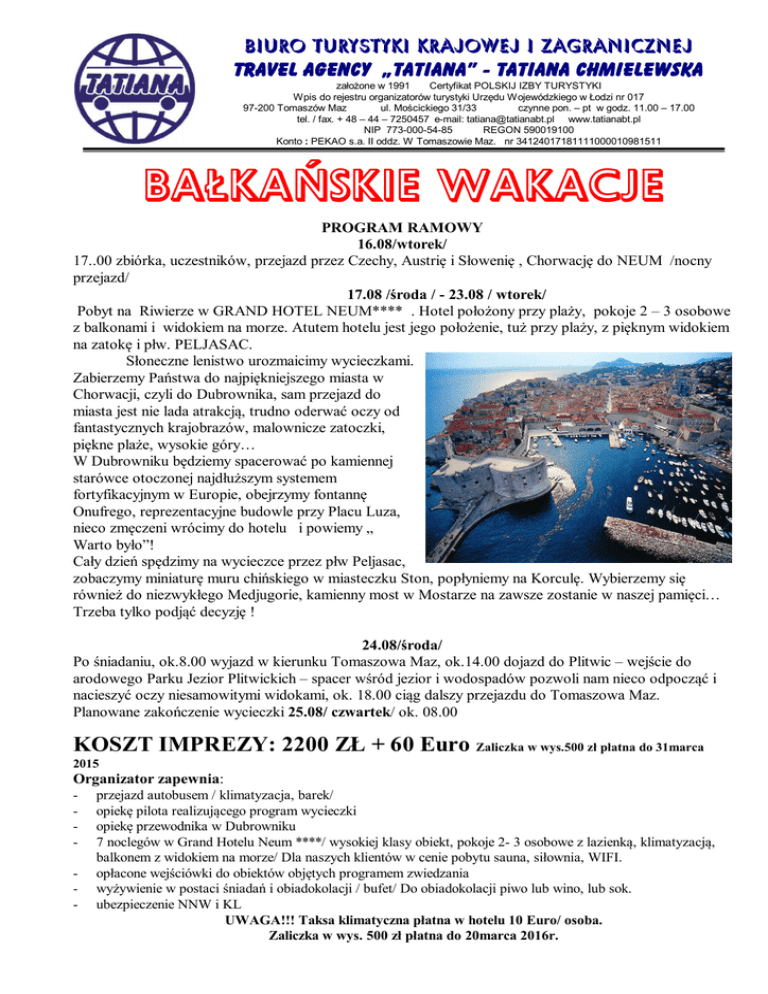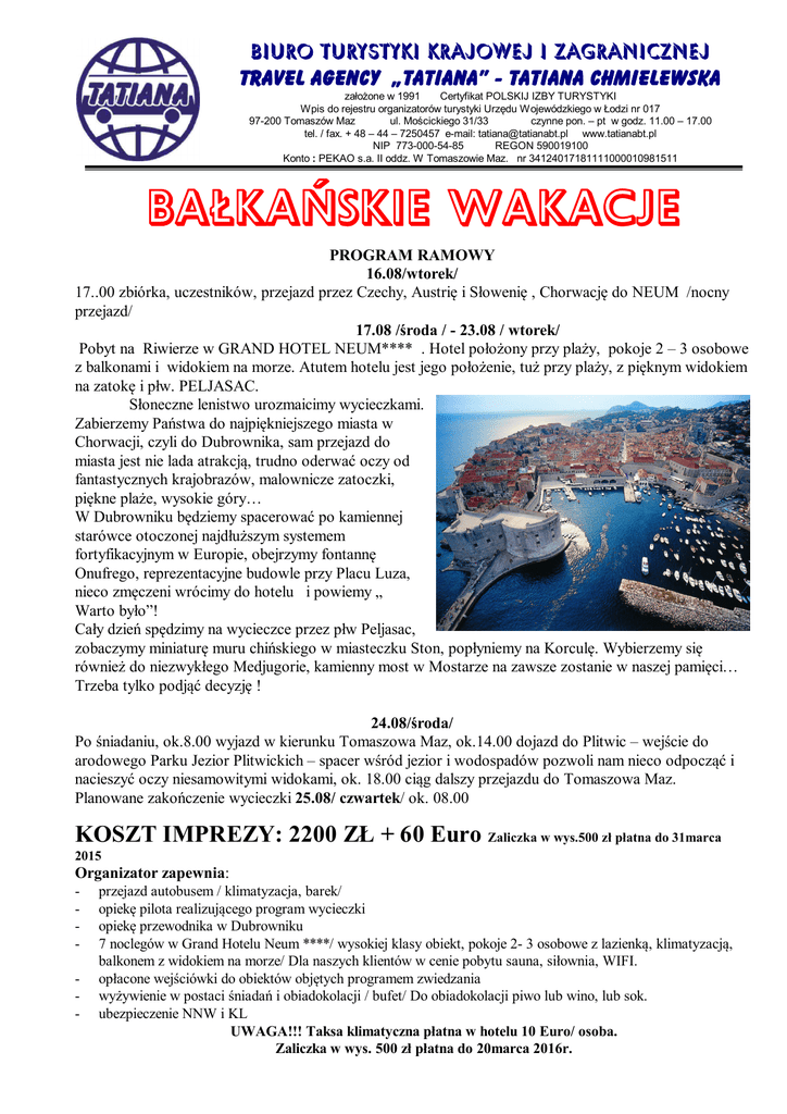 Biuro Turystyki Krajowej i Zagranicznej Travel agency „Tatiana” - tatiana Chmielewska założone w 1991 Certyfikat POLSKIJ IZBY TURYSTYKI Wpis do rejestru organizatorów turystyki Urzędu Wojewódzkiego w Łodzi nr 017 97-200 Tomaszów Maz ul. Mościckiego 31/33 czynne pon. – pt w godz. 11.00 – 17.00 tel. / fax. + 48 – 44 – 7250457 e-mail: [email protected] www.tatianabt.pl NIP 773-000-54-85 REGON 590019100 Konto : PEKAO s.a. II oddz. W Tomaszowie Maz. nr 34124017181111000010981511 BAŁKAŃSKIE WAKACJE PROGRAM RAMOWY 16.08/wtorek/ 17..00 zbiórka, uczestników, przejazd przez Czechy, Austrię i Słowenię , Chorwację do NEUM /nocny przejazd/ 17.08 /środa / - 23.08 / wtorek/ Pobyt na Riwierze w GRAND HOTEL NEUM**** . Hotel położony przy plaży, pokoje 2 – 3 osobowe z balkonami i widokiem na morze. Atutem hotelu jest jego położenie, tuż przy plaży, z pięknym widokiem na zatokę i płw. PELJASAC. Słoneczne lenistwo urozmaicimy wycieczkami. Zabierzemy Państwa do najpiękniejszego miasta w Chorwacji, czyli do Dubrownika, sam przejazd do miasta jest nie lada atrakcją, trudno oderwać oczy od fantastycznych krajobrazów, malownicze zatoczki, piękne plaże, wysokie góry… W Dubrowniku będziemy spacerować po kamiennej starówce otoczonej najdłuższym systemem fortyfikacyjnym w Europie, obejrzymy fontannę Onufrego, reprezentacyjne budowle przy Placu Luza, nieco zmęczeni wrócimy do hotelu i powiemy „ Warto było”! Cały dzień spędzimy na wycieczce przez płw Peljasac, zobaczymy miniaturę muru chińskiego w miasteczku Ston, popłyniemy na Korculę. Wybierzemy się również do niezwykłego Medjugorie, kamienny most w Mostarze na zawsze zostanie w naszej pamięci… Trzeba tylko podjąć decyzję ! 24.08/środa/ Po śniadaniu, ok.8.00 wyjazd w kierunku Tomaszowa Maz, ok.14.00 dojazd do Plitwic – wejście do arodowego Parku Jezior Plitwickich – spacer wśród jezior i wodospadów pozwoli nam nieco odpocząć i nacieszyć oczy niesamowitymi widokami, ok. 18.00 ciąg dalszy przejazdu do Tomaszowa Maz. Planowane zakończenie wycieczki 25.08/ czwartek/ ok. 08.00 KOSZT IMPREZY: 2200 ZŁ + 60 Euro Zaliczka w wys.500 zł płatna do 31marca 2015 Organizator zapewnia: - przejazd autobusem / klimatyzacja, barek/ opiekę pilota realizującego program wycieczki opiekę przewodnika w Dubrowniku 7 noclegów w Grand Hotelu Neum ****/ wysokiej klasy obiekt, pokoje 2- 3 osobowe z lazienką, klimatyzacją, balkonem z widokiem na morze/ Dla naszych klientów w cenie pobytu sauna, siłownia, WIFI. opłacone wejściówki do obiektów objętych programem zwiedzania wyżywienie w postaci śniadań i obiadokolacji / bufet/ Do obiadokolacji piwo lub wino, lub sok. ubezpieczenie NNW i KL UWAGA!!! Taksa klimatyczna płatna w hotelu 10 Euro/ osoba. Zaliczka w wys. 500 zł płatna do 20marca 2016r.