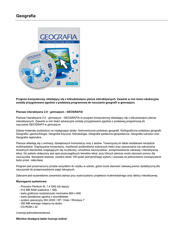 Geografia Program komputerowy składający się z kilkudziesięciu plansz interaktywnych. Zawarte w nim treści edukacyjne zostały przygotowane zgodnie z podstawą programową do nauczania geografii w gimnazjum. Plansze interaktywne 2.0 - gimnazjum - GEOGRAFIA Plansze interaktywne 2.0 - gimnazjum - GEOGRAFIA to program komputerowy składający się z kilkudziesięciu plansz interaktywnych. Zawarte w nim treści edukacyjne zostały przygotowane zgodnie z podstawą programową do nauczania GEOGRAFII w gimnazjum. Zakres materiału podzielono na następujące działy: Astronomiczne podstawy geografii, Kartograficzne podstawy geografii, Geografia i geomorfologia, Geografia fizyczna, Klimatologia, Geografia społeczno-gospodarcza, Geografia ludności oraz Geografia regionalna. Plansze składają się z animacji, dźwiękowych komentarzy oraz z testów. Towarzyszą im także dodatkowe narzędzia multimedialne. Dopisywanie komentarzy, możliwość podkreślania wybranych treści oraz zaznaczania lub zakrywania dowolnych elementów znajdujących się na planszy, umożliwia nauczycielowi przeprowadzenie ciekawej i interaktywnej lekcji. Do pakietu dołączony jest opis poszczególnych tematów lekcji, przy których plansza może stanowić pomoc dla nauczyciela. Narzędzie testowe, zawiera około 150 pytań jednokrotnego wyboru i pozwala na jednoczesne rozwiązywanie testu przez całą klasę. Program jest przeznaczony przede wszystkim do użytku w szkole, gdzie może stanowić ciekawą pomoc dydaktyczną dla nauczycieli do przeprowadzenia zajęć lekcyjnych. Zalecane jest wyświetlanie zawartości plansz przy wykorzystaniu projektora multimedialnego oraz tablicy interaktywnej. Wymagania systemowe: - Procesor Pentium III, 1,4 GHz lub lepszy - 512 MB RAM (zalecane 1 GB) - karta graficzna rozdzielczość minimalna 800 x 600 - karta dźwiękowa zgodna z soundblaster - system operacyjny Win 2000 / XP / Vista / Windows 7 - 300 MB wolnego miejsca na dysku - CD-ROM x 32 Licencja jednostanowiskowa Wkrótce dostępna także licencja online!