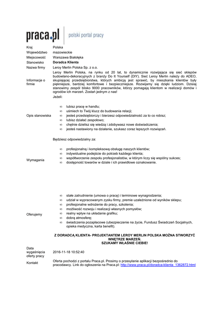 Kraj Województwo Miejscowość Stanowisko Nazwa firmy Informacje o firmie Opis stanowiska Polska mazowieckie Warszawa Białołęka Doradca Klienta Leroy Merlin Polska Sp. z o.o. Leroy Merlin Polska, na rynku od 20 lat, to dynamicznie rozwijająca się sieć sklepów budowlano-dekoracyjnych z branży Do It Yourself (DIY). Sieć Leroy Merlin należy do ADEO, skupiającej przedsiębiorstwa, których ambicją jest sprawić, by mieszkania klientów były piękniejsze, bardziej komfortowe i bezpieczniejsze. Rozwijamy się dzięki ludziom. Dzisiaj stanowimy zespól blisko 9000 pracowników, którzy pomagają klientom w realizacji domów i ogrodów ich marzeń. Zostań jednym z nas! Jeżeli: • • • • • • lubisz pracę w handlu; uśmiech to Twój klucz do budowania relacji; jesteś przedsiębiorczy i bierzesz odpowiedzialność za to co robisz; lubisz działać zespołowo; chętnie dzielisz się wiedzą i zdobywasz nowe doświadczenia; jesteś nastawiony na działanie, szukasz coraz lepszych rozwiązań. Będziesz odpowiedzialny za: Wymagania • • • • profesjonalną i kompleksową obsługę naszych klientów; indywidualne podejście do potrzeb każdego klienta; współtworzenie zespołu profesjonalistów, w którym liczy się wspólny sukces; dostępność towarów w dziale i ich prawidłowe oznakowanie. Oferujemy Ci : Oferujemy • • • • • • • stałe zatrudnienie (umowa o pracę) i terminowe wynagrodzenia; udział w wypracowanym zysku firmy, premie uzależnione od wyników sklepu; profesjonalne wdrożenie do pracy, szkolenia; możliwość rozwoju i realizacji własnych pomysłów; realny wpływ na układanie grafiku; dobrą atmosferę; świadczenia pozapłacowe (ubezpieczenie na życie, Fundusz Świadczeń Socjalnych, opieka medyczna, karta benefit). Z DORADCĄ KLIENTA- PROJEKTANTEM LEROY MERLIN POLSKA MOŻNA STWORZYĆ WNĘTRZE MARZEŃ. SZUKAMY WŁAŚNIE CIEBIE! Data wygaśnięcia oferty pracy 2016-11-18 10:52:40 Kontakt Oferta pochodzi z portalu Praca.pl. Prosimy o przesyłanie aplikacji bezpośrednio do pracodawcy. Link do ogłoszenia na Praca.pl: http://www.praca.pl/doradca-klienta_1362872.html
