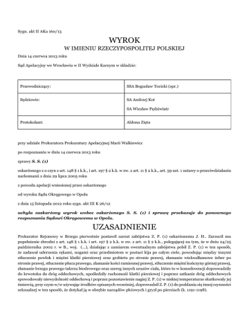 Sygn. akt II AKa 160/13 WYROK W IMIENIU RZECZYPOSPOLITEJ POLSKIEJ Dnia 14 czerwca 2013 roku Sąd Apelacyjny we Wrocławiu w II Wydziale Karnym w składzie: Przewodniczący: SSA Bogusław Tocicki (spr.) Sędziowie: SA Andrzej Kot SA Wiesław Pędziwiatr Protokolant: Aldona Zięta przy udziale Prokuratora Prokuratury Apelacyjnej Marii Walkiewicz po rozpoznaniu w dniu 14 czerwca 2013 roku sprawy S. S. (1) oskarżonego z o czyn z art. 148 § 1 k.k., i art. 197 § 2 k.k. w zw. z art. 11 § 2 k.k., art. 59 ust. 1 ustawy o przeciwdziałaniu narkomanii z dnia 29 lipca 2005 roku z powodu apelacji wniesionej przez oskarżonego od wyroku Sądu Okręgowego w Opolu z dnia 15 listopada 2012 roku sygn. akt III K 26/12 uchyla zaskarżony wyrok wobec oskarżonego S. S. (1) i sprawę przekazuje do ponownego rozpoznania Sądowi Okręgowemu w Opolu. UZASADNIENIE Prokurator Rejonowy w Brzegu pierwotnie postawił zarzut zabójstwa Z. P. (1) oskarżonemu J. H.. Zarzucił mu popełnienie zbrodni z art. 148 § 1 k.k. i art. 197 § 2 k.k. w zw. z art. 11 § 2 k.k., polegającej na tym, że w dniu 24/25 października 2002 r. w B., woj. (...), działając z zamiarem ewentualnym zabójstwa pobił Z. P. (1) w ten sposób, że zadawał uderzenia rękami, nogami oraz przedmiotem w postaci kija po całym ciele, powodując między innymi stłuczenie powłok i mięśni klatki piersiowej oraz grzbietu po stronie prawej, złamanie wieloodłamowe żeber po stronie prawej, stłuczenie płuca prawego, złamanie kości ramiennej prawej, stłuczenie mięśni kończyny górnej prawej, złamanie brzegu prawego talerza biodrowego oraz szereg innych urazów ciała, które to w konsekwencji doprowadziły do krwotoku do dróg oddechowych, upośledziły ruchomość klatki piersiowej i poprzez zatkanie dróg oddechowych spowodowały niewydolność oddechową i poprzez pozostawienie nagiej Z. P. (1) w niskiej temperaturze skutkowały jej śmiercią, przy czym w/w używając środków opisanych wcześniej, doprowadził Z. P. (1) do poddania się innej czynności seksualnej w ten sposób, że dotykał ją w obrębie narządów płciowych i gryzł po piersiach (k. 1191-1198). Wyrokiem z dnia 10 stycznia 2005r. sygn. III K – 120/03 Sąd Okręgowy w Opolu uniewinnił oskarżonego J. H. od zarzucanego mu czynu i kosztami postępowania obciążył Skarb Państwa (k. 1647-1670). W wyniku apelacji prokuratora, wyrokiem z dnia 10 maja 2005r. sygn. akt II Ka – 113/05 Sąd Apelacyjny we Wrocławiu uchylił orzeczenie Sądu I instancji i przekazał sprawę do ponownego rozpoznania (k. 1685-1691). W ponownym procesie, Sąd Okręgowy w Opolu wyrokiem z dnia 10 maja 2005r. sygn. akt II Ka – 113/05 jeszcze raz uniewinnił oskarżonego J. H. od postawionego mu zarzutu (k. 1950-1951, 1959-1991). Wspomniane orzeczenie nie było już kwestionowane przez strony procesowe, gdyż w toku postępowania ujawniono okoliczności, z których wynikało, że sprawcami przestępstwa mogą być inne osoby. Prokurator Rejonowy w Brzegu wszczął wobec nich śledztwo (k. 18-19), po czym oskarżył R. P. (1) i S. S. (1) (k. 2095-2107) o to, że : I. w nocy z 24/25 października 2002r. w B., woj. (...), działając z zamiarem bezpośrednim zabójstwa oraz wspólnie i w porozumieniu pobili Z. P. (1) w ten sposób, że zadawali uderzenia rękami, nogami oraz przedmiotem w postaci zerwanego z drzewa konaru po całym ciele, powodując między innymi stłuczenia powłok i mięśni klatki piersiowej oraz grzbietu po stronie prawej, złamanie wieloodłamowe żeber po stronie prawej, stłuczenie płuca prawego, złamanie kości ramiennej prawej, stłuczenie mięśni kończyny górnej prawej, złamanie brzegu prawego talerza biodrowego oraz szeregu innych urazów ciała, które w konsekwencji doprowadziły do krwotoku do dróg oddechowych, upośledziły ruchomość klatki piersiowej, a poprzez zatkanie dróg oddechowych spowodowały niewydolność oddechową i poprzez pozostawienie nagiej Z. P. (1) w niskiej temperaturze skutkowały jej śmiercią, przy czym w/w , używając środków opisanych wcześniej doprowadzili Z. P. (1) do poddania się innej czynności seksualnej w ten sposób, że po rozebraniu do naga dotykali ją w obrębie narządów płciowych, zaś S. S. (1) przypalał jej sutki, tj. o przestępstwo z art. 148 § 1 k.k. i art. 197 § 2 k.k. w zw. z art. 11 § 2 k.k.; a nadto R. P. (1) o to, że: II. w dniu 14 kwietnia 2007r. w B., woj. (...), działając w celu zmuszenia funkcjonariuszy Policji C. K. oraz P. O. do zaniechania podjęcia czynności służbowej, związanej z interwencją oraz zatrzymaniem, kopnął w drzwi radiowozu, szarpał C. K. oraz P. O. za mundur, zaś prawą ręką usiłował uderzyć P. O. w twarz, lecz zamierzonego celu nie osiągnął z uwagi na zastosowanie wobec niego chwytów obezwładniających, przy czym jednocześnie znieważył w/w funkcjonariuszy Policji słowami wulgarnymi, tj. o przestępstwo z art. 224 § 2 k.k. i art. 226 § 1 k.k. w zw. z art. 11 § 2 k.k.; III. w dniu 16 marca 2007r. w B., woj. (...) na ul. (...) groził M. M. oraz J. K. pozbawieniem życia w celu wywarcia wpływu na w/w, którzy zostali przesłuchani w charakterze świadków w toczącym się postępowaniu przed Sądem Okręgowym w Opolu w sprawie III K 85/05 oraz w śledztwie Ds. 240/07, tj. o przestępstwo z art. 245 k.k.; IV. w dniu 17 marca 2007r. w B., woj. (...) na ul. (...) groził M. M. oraz J. K. pozbawieniem życia w celu wywarcia wpływu na w/w, którzy zostali przesłuchani w charakterze świadków w toczącym się postępowaniu przed Sądem Okręgowym w Opolu w sprawie III K 85/05 oraz w śledztwie Ds. 240/07, tj. o przestępstwo z art. 245 k.k.; V. w dniu 27 marca 2007r. w B., woj. (...) na ul. (...) groził M. M. oraz J. K. pozbawieniem życia w celu wywarcia wpływu na w/w, którzy zostali przesłuchani w charakterze świadków w toczącym się postępowaniu przed Sądem Okręgowym w Opolu w sprawie III K 85/05 oraz w śledztwie Ds. 240/07, tj