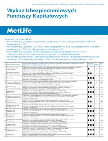 Plan Inwestycyjny Cassiopeia/Plan Inwestycyjny Cassiopeia Plus/Plan Inwestycyjny Andromeda Wykaz Ubezpieczeniowych Funduszy Kapitałowych oferowanych w ramach Umów: – Plan Inwestycyjny Cassiopeia: Indywidualne ubezpieczenie na życie z ubezpieczeniowym funduszem kapitałowym typ „GN” – Plan Inwestycyjny Cassiopeia Plus: Indywidualne ubezpieczenie na życie z ubezpieczeniowym funduszem kapitałowym typ „GN” oraz ubezpieczeniem od następstw NW – Plan Inwestycyjny Cassiopeia / Plan Inwestycyjny Cassiopeia Plus: Ubezpieczenie na życie z ubezpieczeniowym funduszem kapitałowym typ „GN” ze składką jednorazową – Plan Inwestycyjny Andromeda: Indywidualne ubezpieczenie na życie z ubezpieczeniowymi funduszami kapitałowymi ze składką jednorazową typ „GN” oraz ubezpieczeniem na wypadek śmierci NW LP. NAZWA METLIFE UFK NAZWA SUBFUNDUSZU/FUNDUSZU INWESTYCYJNEGO, W KTÓREGO JEDNOSTKI UCZESTNICTWA/TYTUŁY UCZESTNICTWA LOKOWANE SĄ AKTYWA UFK POZIOM RYZYKA1 ZASIĘG2 KOD UFK 1. Altus Absolutnej Stopy Zwrotu Dłużny Subfundusz Altus Absolutnej Stopy Zwrotu Dłużny (grupa: fundusze absolutnej stopy zwrotu) oferowany w ramach Altus Funduszu Inwestycyjnego Otwartego Parasolowego, utworzony i zarządzany przez Altus Towarzystwo Funduszy Inwestycyjnych S.A. K 101 2. Altus Absolutnej Stopy Zwrotu Rynku Polskiego Subfundusz Altus Absolutnej Stopy Zwrotu Rynku Polskiego (grupa: fundusze absolutnej stopy zwrotu) oferowany w ramach Altus Funduszu Inwestycyjnego Otwartego Parasolowego, utworzony i zarządzany przez Altus Towarzystwo Funduszy Inwestycyjnych S.A. K 100 Subfundusz Altus Akcji (grupa: fundusze akcyjne) oferowany w ramach Altus Funduszu Inwestycyjnego Otwartego Parasolowego, utworzony i zarządzany przez Altus Towarzystwo Funduszy Inwestycyjnych S.A. K 102 3. Altus Akcji 4. Aviva Investors Dłużnych Papierów Korporacyjnych Subfundusz Aviva Investors Dłużnych Papierów Korporacyjnych (grupa: fundusze dłużne) oferowany w ramach Aviva Investors Funduszu Inwestycyjnego Otwartego, utworzony i zarządzany przez Aviva Investors Poland Towarzystwo Funduszy Inwestycyjnych S.A. K 069 5. Aviva Investors Nowoczesnych Technologii Subfundusz Aviva Investors Nowoczesnych Technologii (grupa: fundusze akcyjne) oferowany w ramach Aviva Investors Funduszu Inwestycyjnego Otwartego, utworzony i zarządzany przez Aviva Investors Poland Towarzystwo Funduszy Inwestycyjnych S.A. K 071 6. Aviva Investors Polskich Akcji Subfundusz Aviva Investors Polskich Akcji (grupa: fundusze akcyjne) oferowany w ramach Aviva Investors Funduszu Inwestycyjnego Otwartego, utworzony i zarządzany przez Aviva Investors Poland Towarzystwo Funduszy Inwestycyjnych S.A. K 070 7. BlackRock Fixed Income Global Opportunities Fund Subfundusz BlackRock Fixed Income Global Opportunities Fund (grupa: fundusze dłużne) oferowany w ramach BlackRock Global Funds, utworzony i zarządzany przez BlackRock (Luxembourg) S.A. z siedzibą w Luksemburgu Ś 116 8. BlackRock Global Allocation Fund Subfundusz BlackRock Global Allocation Fund (grupa: fundusze mieszane) oferowany w ramach BlackRock Global Funds, utworzony i zarządzany przez BlackRock (Luxembourg) S.A. z siedzibą w Luksemburgu Ś 085 9. BlackRock Global High Yield Bond Fund Subfundusz BlackRock Global High Yield Bond Fund (grupa: fundusze dłużne) oferowany w ramach BlackRock Global Funds, utworzony i zarządzany przez BlackRock (Luxembourg) S.A. z siedzibą w Luksemburgu Ś 117 10. BlackRock Latin American Fund Subfundusz BlackRock Latin American Fund (grupa: fundusze akcyjne) oferowany w ramach BlackRock Global Funds, utworzony i zarządzany przez BlackRock (Luxembourg) S.A. z siedzibą w Luksemburgu Ś 110 11. BlackRock World Mining Fund Subfundusz BlackRock World Mining Fund (grupa: fundusze akcyjne) oferowany w ramach BlackRock Global Funds, utworzony i zarządzany przez BlackRock (Luxembourg) S.A. z siedzibą w Luksemburgu Ś 109 12. Franklin Global Fundamental Strategies Fund Subfundusz Franklin Global Fundamental Strategies Fund (grupa: fundusze akcyjne) oferowany w ramach Franklin Templeton Investment Funds, utworzony i zarządzany przez Franklin Templeton International Services S.à r.l. z siedzibą w Luksemburgu Ś 074 13. Franklin Natural Resources Fund Subfundusz Franklin Natural Resources Fund (grupa: fundusze akcyjne) oferowany w ramach Franklin Templeton Investment Funds, utworzony i zarządzany przez Franklin Templeton International Services S.à r.l. z siedzibą w Luksemburgu Ś 111 14. Franklin U.S. Opportunities Fund Subfundusz Franklin U.S. Opportunities Fund (grupa: fundusze akcyjne) oferowany w ramach Franklin Templeton Investment Funds, utworzony i zarządzany przez Franklin Templeton International Services S.à r.l. z siedzibą w Luksemburgu Ś 073 Subfundusz Investor Akcji (grupa: fundusze akcyjne) oferowany w ramach Investor Parasol Funduszu Inwestycyjnego Otwartego, utworzony i zarządzany przez Investors Towarzystwo Funduszy Inwestycyjnych S.A. K 106 15. Investor Akcji Plan Inwestycyjny Cassiopeia/Plan Inwestycyjny Cassiopeia Plus/Plan Inwestycyjny Andromeda LP. NAZWA METLIFE UFK NAZWA SUBFUNDUSZU/FUNDUSZU INWESTYCYJNEGO, W KTÓREGO JEDNOSTKI UCZESTNICTWA/TYTUŁY UCZESTNICTWA LOKOWANE SĄ AKTYWA UFK POZIOM RYZYKA1 ZASIĘG2 KOD UFK 16. Investor Top 25 Małych Spółek Subfundusz Investor Top 25 Małych Spółek (grupa: fundusze akcyjne) oferowany w ramach Investor Parasol Funduszu Inwestycyjnego Otwartego, utworzony i zarządzany przez Investors Towarzystwo Funduszy Inwestycyjnych S.A. K 107 17. Investor Zabezpieczenia Emerytalnego Subfundusz Investor Zabezpieczenia Emerytalnego (grupa: fundusze mieszane) oferowany w ramach Investor Parasol Funduszu Inwestycyjnego Otwartego, utworzony i zarządzany przez Investors Towarzystwo Funduszy Inwestycyjnych S.A. K 108 18. Ipopema Akcji Subfundusz Ipopema Akcji (grupa: fundusze akcyjne) oferowany w ramach Ipopema Specjalistycznego Funduszu Inwestycyjnego Otwartego, utworzony i zarządzany przez 