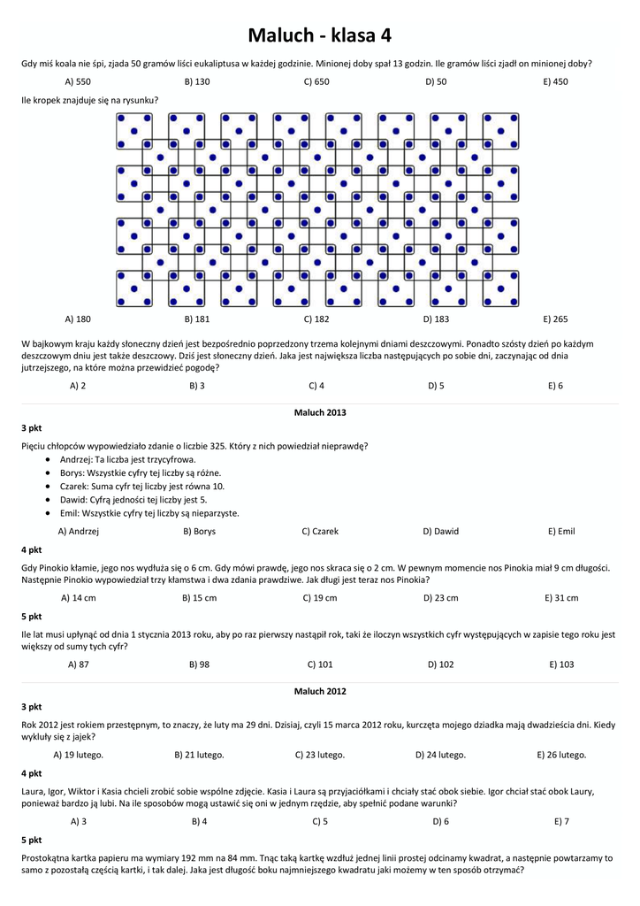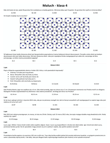 Maluch - klasa 4 Gdy miś koala nie śpi, zjada 50 gramów liści eukaliptusa w każdej godzinie. Minionej doby spał 13 godzin. Ile gramów liści zjadł on minionej doby? A) 550 B) 130 C) 650 D) 50 E) 450 B) 181 C) 182 D) 183 E) 265 Ile kropek znajduje się na rysunku? A) 180 W bajkowym kraju każdy słoneczny dzień jest bezpośrednio poprzedzony trzema kolejnymi dniami deszczowymi. Ponadto szósty dzień po każdym deszczowym dniu jest także deszczowy. Dziś jest słoneczny dzień. Jaka jest największa liczba następujących po sobie dni, zaczynając od dnia jutrzejszego, na które można przewidzieć pogodę? A) 2 B) 3 C) 4 D) 5 E) 6 Maluch 2013 3 pkt Pięciu chłopców wypowiedziało zdanie o liczbie 325. Który z nich powiedział nieprawdę? Andrzej: Ta liczba jest trzycyfrowa. Borys: Wszystkie cyfry tej liczby są różne. Czarek: Suma cyfr tej liczby jest równa 10. Dawid: Cyfrą jedności tej liczby jest 5. Emil: Wszystkie cyfry tej liczby są nieparzyste. A) Andrzej B) Borys C) Czarek D) Dawid E) Emil 4 pkt Gdy Pinokio kłamie, jego nos wydłuża się o 6 cm. Gdy mówi prawdę, jego nos skraca się o 2 cm. W pewnym momencie nos Pinokia miał 9 cm długości. Następnie Pinokio wypowiedział trzy kłamstwa i dwa zdania prawdziwe. Jak długi jest teraz nos Pinokia? A) 14 cm B) 15 cm C) 19 cm D) 23 cm E) 31 cm 5 pkt Ile lat musi upłynąć od dnia 1 stycznia 2013 roku, aby po raz pierwszy nastąpił rok, taki że iloczyn wszystkich cyfr występujących w zapisie tego roku jest większy od sumy tych cyfr? A) 87 B) 98 C) 101 D) 102 E) 103 Maluch 2012 3 pkt Rok 2012 jest rokiem przestępnym, to znaczy, że luty ma 29 dni. Dzisiaj, czyli 15 marca 2012 roku, kurczęta mojego dziadka mają dwadzieścia dni. Kiedy wykluły się z jajek? A) 19 lutego. B) 21 lutego. C) 23 lutego. D) 24 lutego. E) 26 lutego. 4 pkt Laura, Igor, Wiktor i Kasia chcieli zrobić sobie wspólne zdjęcie. Kasia i Laura są przyjaciółkami i chciały stać obok siebie. Igor chciał stać obok Laury, ponieważ bardzo ją lubi. Na ile sposobów mogą ustawić się oni w jednym rzędzie, aby spełnić podane warunki? A) 3 B) 4 C) 5 D) 6 E) 7 5 pkt Prostokątna kartka papieru ma wymiary 192 mm na 84 mm. Tnąc taką kartkę wzdłuż jednej linii prostej odcinamy kwadrat, a następnie powtarzamy to samo z pozostałą częścią kartki, i tak dalej. Jaka jest długość boku najmniejszego kwadratu jaki możemy w ten sposób otrzymać? A) 1 mm B) 4 mm C) 6 mm D) 10 mm E) 12 mm Maluch 2011 3 pkt Zegar na wieży wybija pełne godziny (np. o 8:0} bije 8 razy, o 9:00 bije 9 razy). Oprócz tego, zegar ten bije po jednym razie w połowie każdej godziny (np. o 8:30). Ile uderzeń wybije zegar między 7:45 a 10:45? A) 6 B) 16 C) 27 D) 30 E) 33 4 pkt Arek, Czarek, Darek, Jarek, Marek i Wojtek rzucali kostką do gry. Każdy z chłopców rzucał jeden raz i wyrzucił inną liczbę oczek. Arek wyrzucił cztery razy większą liczbę niż Czarek. Darek wyrzucił dwa razy większą liczbę niż Jarek i trzy razy większą liczbę niż Marek. Jaką liczbę oczek wyrzucił Wojtek? A) 2 B) 3 C) 4 D) 5 E) 6 5 pkt Każdy uczestnik pewnego teleturnieju dostaje 10 punktów na starcie i musi odpowiedzieć na 10 pytań. Za dobrą odpowiedź dostaje 1 punkt, a za złą odpowiedź lub jej brak traci 1 punkt. Pani Kowalska ukończyła teleturniej z 14 punktami. Ilu dobrych odpowiedzi udzieliła? A) 7 B) 8 C) 9 D) 6 E) 4 Maluch 2010 3 pkt Lekcja tańca, trwająca 40 minut, rozpoczęła się o 11:50. Dokładnie w połowie tej lekcji do sali wszedł spóźniony Staś. O której godzinie Staś wszedł do sali? A) 11:30 B) 12:00 C) 12:10 D) 12:20 E) 12:30 4 pkt Mateusz i Klara mieszkają w wieżowcu. Klara mieszka 12 pięter nad Mateuszem. Pewnego dnia Mateusz poszedł schodami odwiedzić Klarę. W połowie drogi był na 8 piętrze. Na którym piętrze mieszka Klara? A) 12 B) 14 C) 16 D) 20 E) 24 5 pkt Dziesięcioletnia Ola jest sześć razy młodsza od swojej babci. Babcia Oli ma o 14 lat więcej niż mają Ola i mama Oli razem. Prababcia Oli ma tyle lat co babcia i mama Oli razem. Ile lat ma prababcia Oli? A) 106 B) 69 C) 70 D) 89 E) 96 D) 9 E) 10 Maluch 2009 W pewnej rodzinie jest pięciu braci. Każdy z nich ma jedną siostrę. Ile rodzeństwa jest w tej rodzinie? A) 6 B) 7 C) 8 4 pkt Trzy wiewiórki: Hela, Mela i Tola znalazły łącznie 7 orzechów. Każda z nich znalazła inną liczbę orzechów, przy czym każda z nich znalazła co najmniej jeden. Hela znalazła najmniej, a Mela najwięcej. Ile orzechów znalazła Tola? A) 1 B) 2 C) 3 D) 4 E) 5 5 pkt Pani Florentyna codziennie sprzedaje na targu jajka. W środę sprzedała 60 jajek, a w czwartek 96 i zauważyła, że w tym tygodniu każdego dnia liczba sprzedanych jajek była równa sumie liczb sprzedanych jajek w dwóch dniach poprzednich. Ile jajek sprzedała pani Florentyna w poniedziałek? A) 20 B) 24 C) 36 D) 40 E) 48 Maluch 2008 3 pkt Bilet wstępu do ZOO dla osoby dorosłej kosztuje 4 zł, a bilet dla dziecka jest o 1 zł tańszy. Pewnej niedzieli tata wybrał się do ZOO wraz z dwójką dzieci. Ile złotych musiał zapłacić za bilety wstępu? A) 5 B) 6 C) 7 D) 10 E) 12 4 pkt Hotelik może przyjąć 21 gości. Jest w nim 5 pokoi trzyosobowych i pewna liczba pokoi dwuosobowych. Ile jest pokoi dwuosobowych? A) 1 B) 2 C) 3 D) 4 E) 6 5 pkt W dwóch naczyniach znajduje się łącznie 40 litrów wody. Z pierwszego naczynia przelano do drugiego 5 litrów wody, a następnie z drugiego do pierwszego przelano tyle wody, że ilość wody w pierwszym naczyniu podwoiła się. Okazało się wtedy, że w obu naczyniach było tyle samo wody. Ile wody było w drugim naczyniu na początku? A) 20 B) 35 C) 15 D) 25 E) 10 Maluch 2007 3 pkt Po jednej stronie alejki w parku znajduje się 9 latarni. Odległość pomiędzy sąsiednimi latarniami wynosi 8 metrów. Jurek przeszedł całą drogę tą alejką od pierwszej do ostatniej latarni. Ile metrów przeszedł? A) 48 B) 56 C) 64 D) 72 E) 80 D) 6000 mm E)