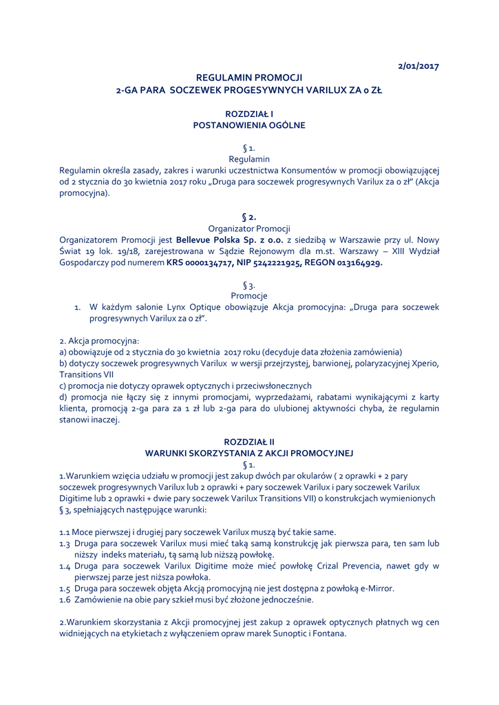 2/01/2017 REGULAMIN PROMOCJI 2-GA PARA SOCZEWEK PROGESYWNYCH VARILUX ZA 0 ZŁ ROZDZIAŁ I POSTANOWIENIA OGÓLNE § 1. Regulamin Regulamin określa zasady, zakres i warunki uczestnictwa Konsumentów w promocji obowiązującej od 2 stycznia do 30 kwietnia 2017 roku „Druga para soczewek progresywnych Varilux za 0 zł” (Akcja promocyjna). § 2. Organizator Promocji Organizatorem Promocji jest Bellevue Polska Sp. z o.o. z siedzibą w Warszawie przy ul. Nowy Świat 19 lok. 19/18, zarejestrowana w Sądzie Rejonowym dla m.st. Warszawy – XIII Wydział Gospodarczy pod numerem KRS 0000134717, NIP 5242221925, REGON 013164929. § 3. Promocje 1. W każdym salonie Lynx Optique obowiązuje Akcja promocyjna: „Druga para soczewek progresywnych Varilux za 0 zł”. 2. Akcja promocyjna: a) obowiązuje od 2 stycznia do 30 kwietnia 2017 roku (decyduje data złożenia zamówienia) b) dotyczy soczewek progresywnych Varilux w wersji przejrzystej, barwionej, polaryzacyjnej Xperio, Transitions VII c) promocja nie dotyczy oprawek optycznych i przeciwsłonecznych d) promocja nie łączy się z innymi promocjami, wyprzedażami, rabatami wynikającymi z karty klienta, promocją 2-ga para za 1 zł lub 2-ga para do ulubionej aktywności chyba, że regulamin stanowi inaczej. ROZDZIAŁ II WARUNKI SKORZYSTANIA Z AKCJI PROMOCYJNEJ § 1. 1.Warunkiem wzięcia udziału w promocji jest zakup dwóch par okularów ( 2 oprawki + 2 pary soczewek progresywnych Varilux lub 2 oprawki + pary soczewek Varilux i pary soczewek Varilux Digitime lub 2 oprawki + dwie pary soczewek Varilux Transitions VII) o konstrukcjach wymienionych § 3, spełniających następujące warunki: 1.1 Moce pierwszej i drugiej pary soczewek Varilux muszą być takie same. 1.3 Druga para soczewek Varilux musi mieć taką samą konstrukcję jak pierwsza para, ten sam lub niższy indeks materiału, tą samą lub niższą powłokę. 1.4 Druga para soczewek Varilux Digitime może mieć powłokę Crizal Prevencia, nawet gdy w pierwszej parze jest niższa powłoka. 1.5 Druga para soczewek objęta Akcją promocyjną nie jest dostępna z powłoką e-Mirror. 1.6 Zamówienie na obie pary szkieł musi być złożone jednocześnie. 2.Warunkiem skorzystania z Akcji promocyjnej jest zakup 2 oprawek optycznych płatnych wg cen widniejących na etykietach z wyłączeniem opraw marek Sunoptic i Fontana. § 2. 1.Jeśli pierwsza para okularów zawiera soczewki Varilux przejrzytse, Transitions VII, polaryzacyjne Xperio lub barwione w cenie regularnej, to drugą parą mogą być: a. soczewki Varilux przejrzyste lub Varilux Digitime przejrzyste w cenie dla konsumenta o zł za parę b. soczewki Varilux lub Varilux Digitime z barwieniem (jednokolorowym lub gradalnym) w cenie dla konsumenta 200 zł za parę 2.Jeżeli pierwsza para okularów zawiera soczewki Varilux w wersji Transitions VII lub Varilux Xperio w cenie regularnej, to drugą parą mogą być: c. soczewki Varilux Transitions VII w cenie dla konsumenta 400 zł za parę §3. 1. 2. 3. 4. 5. Akcją promocyjną objęte są konstrukcje: Varilux S4D, Varilux S f-360, Varilux S Design, Varilux S Design Short Varilux F f-360, Varilux E Design, Varilux E Design Short Varilux Physio 2.0 f-360, Varilux Physio 2.0, Varilux Physio 2.0 Short Varilux Liberty NE, Varilux Liberty NE Short Varilux Starter § 4. 1.1 W Akcji promocyjnej nie biorą udziału soczewki: 1. Varilux Activites 2. Varilux Mineralne 3. Varilux Comfort (wszystkie konstrukcje) 4. Varilux SUN Max 5. Soczewki poza zakresowe. ROZDZIAŁ IV POSTANOWIENIE DOTYCZĄCE NINIEJSZEGO REGULAMINU 1. 2. 3. 4. 5. 6. 7. § 1. Wszelkie informacje o Promocji zawarte w jakichkolwiek materiałach promocyjnych i reklamowych mają jedynie charakter pomocniczy. Informacjami wiążącymi są postanowienia niniejszego Regulaminu. Niniejszy regulamin jest dostępny przez cały czas trwania Promocji w wszystkich salonach Lynx Optique w Polsce oraz na stronie www.lynx-optique.pl. Regulamin Promocji jest ponadto dostępny do wglądu w siedzibie Organizatora : Bellevue Polska Sp. z o.o. przy ul. Nowy Świat 19 lok.18/19 w Warszawie. Organizator zastrzega sobie prawo do dokonania zmian Regulaminu Promocji z ważnych powodów, w każdym czasie, w szczególności do przedłużenia, skrócenia lub zawieszenia promocji. Organizator zobowiązuje się, że w przypadku zmian w Regulaminie, zmiany te nie będą naruszać praw już nabytych przez Uczestników oraz nie będą pogarszać warunków Promocji. W przypadki zmian w Regulaminie, informacja o zmianie będzie umieszczona na stronie www.lynx-optique.pl a nowy Regulamin będzie dostępny we wszystkich salonach Lynx Optique, w siedzibie organizatora oraz na stronie www.lynx-optique.pl Regulamin wchodzi w życie w dniu rozpoczęcia promocji.