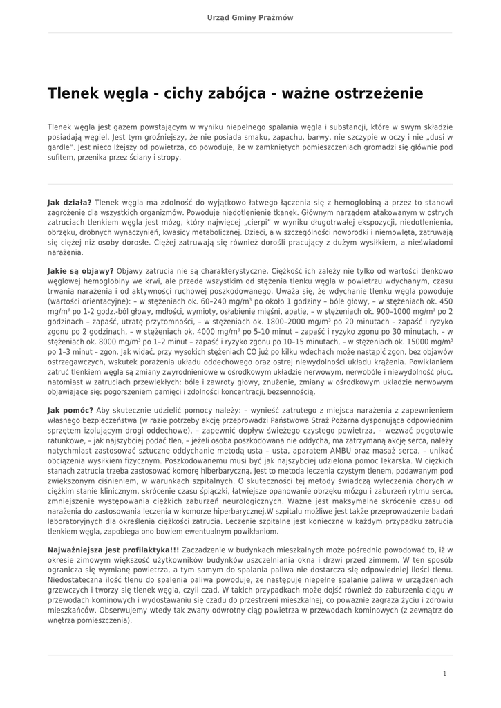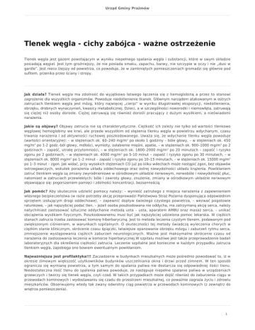 Urząd Gminy Prażmów Tlenek węgla - cichy zabójca - ważne ostrzeżenie Tlenek węgla jest gazem powstającym w wyniku niepełnego spalania węgla i substancji, które w swym składzie posiadają węgiel. Jest tym groźniejszy, że nie posiada smaku, zapachu, barwy, nie szczypie w oczy i nie „dusi w gardle”. Jest nieco lżejszy od powietrza, co powoduje, że w zamkniętych pomieszczeniach gromadzi się głównie pod sufitem, przenika przez ściany i stropy. Jak działa? Tlenek węgla ma zdolność do wyjątkowo łatwego łączenia się z hemoglobiną a przez to stanowi zagrożenie dla wszystkich organizmów. Powoduje niedotlenienie tkanek. Głównym narządem atakowanym w ostrych zatruciach tlenkiem węgla jest mózg, który najwięcej „cierpi” w wyniku długotrwałej ekspozycji, niedotlenienia, obrzęku, drobnych wynaczynień, kwasicy metabolicznej. Dzieci, a w szczególności noworodki i niemowlęta, zatruwają się ciężej niż osoby dorosłe. Ciężej zatruwają się również dorośli pracujący z dużym wysiłkiem, a nieświadomi narażenia. Jakie są objawy? Objawy zatrucia nie są charakterystyczne. Ciężkość ich zależy nie tylko od wartości tlenkowo węglowej hemoglobiny we krwi, ale przede wszystkim od stężenia tlenku węgla w powietrzu wdychanym, czasu trwania narażenia i od aktywności ruchowej poszkodowanego. Uważa się, że wdychanie tlenku węgla powoduje (wartości orientacyjne): – w stężeniach ok. 60–240 mg/m3 po około 1 godziny – bóle głowy, – w stężeniach ok. 450 mg/m3 po 1-2 godz.-ból głowy, mdłości, wymioty, osłabienie mięśni, apatie, – w stężeniach ok. 900–1000 mg/m3 po 2 godzinach – zapaść, utratę przytomności, – w stężeniach ok. 1800–2000 mg/m3 po 20 minutach – zapaść i ryzyko zgonu po 2 godzinach, – w stężeniach ok. 4000 mg/m3 po 5-10 minut – zapaść i ryzyko zgonu po 30 minutach, – w stężeniach ok. 8000 mg/m3 po 1–2 minut – zapaść i ryzyko zgonu po 10–15 minutach, – w stężeniach ok. 15000 mg/m3 po 1–3 minut – zgon. Jak widać, przy wysokich stężeniach CO już po kilku wdechach może nastąpić zgon, bez objawów ostrzegawczych, wskutek porażenia układu oddechowego oraz ostrej niewydolności układu krążenia. Powikłaniem zatruć tlenkiem węgla są zmiany zwyrodnieniowe w ośrodkowym układzie nerwowym, nerwobóle i niewydolność płuc, natomiast w zatruciach przewlekłych: bóle i zawroty głowy, znużenie, zmiany w ośrodkowym układzie nerwowym objawiające się: pogorszeniem pamięci i zdolności koncentracji, bezsennością. Jak pomóc? Aby skutecznie udzielić pomocy należy: – wynieść zatrutego z miejsca narażenia z zapewnieniem własnego bezpieczeństwa (w razie potrzeby akcję przeprowadzi Państwowa Straż Pożarna dysponująca odpowiednim sprzętem izolującym drogi oddechowe), – zapewnić dopływ świeżego czystego powietrza, – wezwać pogotowie ratunkowe, – jak najszybciej podać tlen, – jeżeli osoba poszkodowana nie oddycha, ma zatrzymaną akcję serca, należy natychmiast zastosować sztuczne oddychanie metodą usta – usta, aparatem AMBU oraz masaż serca, – unikać obciążenia wysiłkiem fizycznym. Poszkodowanemu musi być jak najszybciej udzielona pomoc lekarska. W ciężkich stanach zatrucia trzeba zastosować komorę hiberbaryczną. Jest to metoda leczenia czystym tlenem, podawanym pod zwiększonym ciśnieniem, w warunkach szpitalnych. O skuteczności tej metody świadczą wyleczenia chorych w ciężkim stanie klinicznym, skrócenie czasu śpiączki, łatwiejsze opanowanie obrzęku mózgu i zaburzeń rytmu serca, zmniejszenie występowania ciężkich zaburzeń neurologicznych. Ważne jest maksymalne skrócenie czasu od narażenia do zastosowania leczenia w komorze hiperbarycznej.W szpitalu możliwe jest także przeprowadzenie badań laboratoryjnych dla określenia ciężkości zatrucia. Leczenie szpitalne jest konieczne w każdym przypadku zatrucia tlenkiem węgla, zapobiega ono bowiem ewentualnym powikłaniom. Najważniejsza jest profilaktyka!!! Zaczadzenie w budynkach mieszkalnych może pośrednio powodować to, iż w okresie zimowym większość użytkowników budynków uszczelniania okna i drzwi przed zimnem. W ten sposób ogranicza się wymianę powietrza, a tym samym do spalania paliwa nie dostarcza się odpowiedniej ilości tlenu. Niedostateczna ilość tlenu do spalenia paliwa powoduje, ze następuje niepełne spalanie paliwa w urządzeniach grzewczych i tworzy się tlenek węgla, czyli czad. W takich przypadkach może dojść również do zaburzenia ciągu w przewodach kominowych i wydostawaniu się czadu do przestrzeni mieszkalnej, co poważnie zagraża życiu i zdrowiu mieszkańców. Obserwujemy wtedy tak zwany odwrotny ciąg powietrza w przewodach kominowych (z zewnątrz do wnętrza pomieszczenia). 1 Urząd Gminy Prażmów Drogi Domowniku – przeczytaj i powtórz Rodzinie! - nie stosuj do ogrzewania pomieszczeń, w których stale przebywają ludzie gazowych przenośnych urządzeń promiennikowych; - nie ogrzewaj pomieszczeń z kuchni gazowych, gdyż może to spowodować poważne zatrucie; - zapewnij skuteczną wentylację w pomieszczeniach, w których występuje spalanie paliwa; - nie zatykaj kratek wentylacyjnych w drzwiach do łazienki oraz do przewodów wentylacyjnych; - pamiętaj, że w pomieszczeniu, w którym zachodzi spalanie paliwa z grawitacyjnym odprowadzaniem spalin z wykorzystaniem do spalania powietrza z pomieszczenia, stosowanie mechanicznej wentylacji wyciągowej jest zabronione; - wszelkie prace naprawcze, przeróbki, modernizacje i prace konserwacyjne przy urządzeniach na paliwo stałe, ciekłe i gazowe zlecaj tylko specjalistom posiadającym odpowiednie kwalifikacje; nie pozostawiaj bez nadzoru potraw na włączonej kuchence czy ciasta w piekarniku; - do wyposażenia mieszkania kupuj nowoczesne i bezpieczne urządzenia (kuchenki gazowe, przepływowe gazowe ogrzewacze wody), posiadające stosown