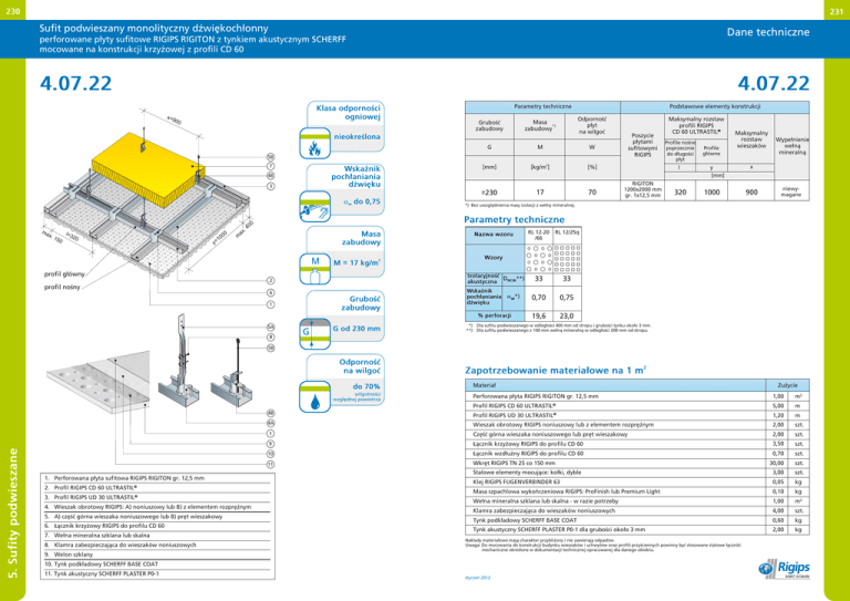 230 231 Sufit podwieszany monolityczny dźwiękochłonny Dane techniczne perforowane płyty sufitowe RIGIPS RIGITON z tynkiem akustycznym SCHERFF mocowane na konstrukcji krzyżowej z profili CD 60 4.07.22 4.07.22 x=9 Parametry techniczne Klasa odporności ogniowej 00 Odporność płyt na wilgoć Masa *) zabudowy Grubość zabudowy Podstawowe elementy konstrukcji nieokreślona G M W [mm] [kg/m2] [%] Poszycie płytami sufitowymi RIGIPS 5B 7 Wskaźnik pochłaniania dźwięku 4B 3 17 ł230 a w do 0,75 ma x. 1 50 l=3 20 10 y= 00 m .4 ax 70 Maksymalny rozstaw profili RIGIPS CD 60 ULTRASTIL® Profile nośne poprzecznie do długości płyt l RIGITON 1200x2000 mm gr. 1x12,5 mm 320 Profile główne Maksymalny rozstaw wieszaków y [mm] 1000 Wypełnienie wełną mineralną x 900 niewymagane *) Bez uwzględnienia masy izolacji z wełny mineralnej. Parametry techniczne 00 Masa zabudowy M Nazwa wzoru profil nośny 6 Grubość zabudowy 1 Wskaźnik pochłaniania dźwięku 33 0,70 0,75 19,6 23,0 a w*) % perforacji 8 33 Izolacyjność DNCW**) akustyczna 2 5A RL 12/25q Wzory M~ ~ 17 kg/m2 profil główny RL 12-20 /66 G G od 230 mm *) **) Dla sufitu podwieszanego w odległości 400 mm od stropu i grubości tynku około 3 mm. Dla sufitu podwieszanego z 100 mm wełną mineralną w odległości 200 mm od stropu. 5B Odporność na wilgoć do 70% 5. Sufity podwieszane wilgotności względnej powietrza 1. Perforowana płyta sufitowa RIGIPS RIGITON gr. 12,5 mm 2. Profil RIGIPS CD 60 ULTRASTIL® 3. Profil RIGIPS UD 30 ULTRASTIL® 4. Wieszak obrotowy RIGIPS: A) noniuszowy lub B) z elementem rozprężnym 5. A) część górna wieszaka noniuszowego lub B) pręt wieszakowy 6. Łącznik krzyżowy RIGIPS do profilu CD 60 7. Wełna mineralna szklana lub skalna 8. Klamra zabezpieczająca do wieszaków noniuszowych 9. Welon szklany Zapotrzebowanie materiałowe na 1 m Zużycie Materiał Perforowana płyta RIGIPS RIGITON gr. 12,5 mm 1,00 m2 Profil RIGIPS CD 60 ULTRASTIL® 5,00 m ® 4B Profil RIGIPS UD 30 ULTRASTIL 1,20 m 4A Wieszak obrotowy RIGIPS noniuszowy lub z elementem rozprężnym 2,00 szt. 1 Część górna wieszaka noniuszowego lub pręt wieszakowy 2,00 szt. szt. 9 Łącznik krzyżowy RIGIPS do profilu CD 60 3,50 10 Łącznik wzdłużny RIGIPS do profilu CD 60 0,70 szt. 11 Wkręt RIGIPS TN 25 co 150 mm 30,00 szt. Stalowe elementy mocujące: kołki, dyble 3,00 szt. Klej RIGIPS FUGENVERBINDER 63 0,05 kg Masa szpachlowa wykończeniowa RIGIPS: ProFinish lub Premium Light 0,10 kg Wełna mineralna szklana lub skalna - w razie potrzeby 1,00 m2 Klamra zabezpieczająca do wieszaków noniuszowych 4,00 szt. Tynk podkładowy SCHERFF BASE COAT 0,60 kg Tynk akustyczny SCHERFF PLASTER P0-1 dla grubości około 3 mm 2,00 kg Nakłady materiałowe mają charakter przybliżony i nie zawierają odpadów. Uwaga: Do mocowania do konstrukcji budynku wieszaków i uchwytów oraz profili przyściennych powinny być stosowane stalowe łączniki mechaniczne określone w dokumentacji technicznej opracowanej dla danego obiektu. 10. Tynk podkładowy SCHERFF BASE COAT 11. Tynk akustyczny SCHERFF PLASTER P0-1 2 styczeń 2012