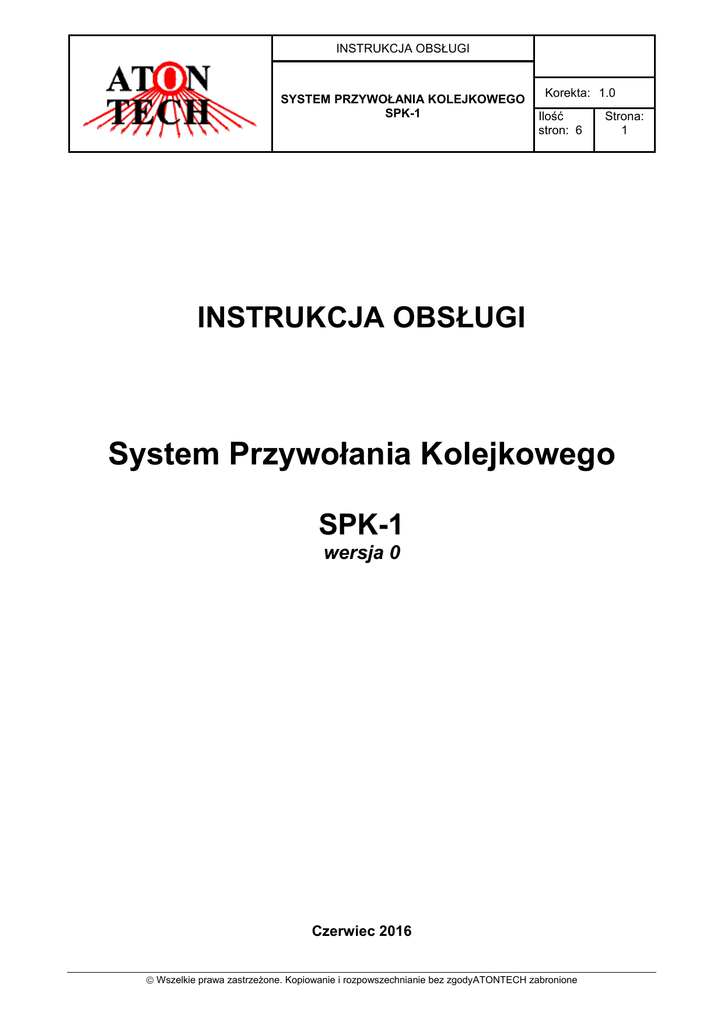 INSTRUKCJA OBSŁUGI SYSTEM PRZYWOŁANIA KOLEJKOWEGO SPK-1 Korekta: 1.0 Ilość stron: 6 Strona: 1 INSTRUKCJA OBSŁUGI System Przywołania Kolejkowego SPK-1 wersja 0 Czerwiec 2016 Wszelkie prawa zastrzeżone. Kopiowanie i rozpowszechnianie bez zgodyATONTECH zabronione ATONTECH INSTRUKCJA OBSŁUGI SPK-1 Korekta: 1.0 Strona 2 SPIS TREŚCI 1. 2. 3. 3.1 3.2 3.3 4. WSTĘP .................................................................................................................................... 3 KONFIGURACJA SYSTEMU ................................................................................................... 3 PRACA Z SYSTEMEM ............................................................................................................. 4 Koncentrator .......................................................................................................................... 4 Wieżyczka sygnalizacyjna...................................................................................................... 4 Terminal przywoławczy .......................................................................................................... 5 HISTORIA DOKUMENTU......................................................................................................... 6 Wszelkie prawa zastrzeżone. Kopiowanie i rozpowszechnianie bez zgody ATONTECH zabronione ATONTECH 1. INSTRUKCJA OBSŁUGI SPK-1 Korekta: 1.0 Strona 3 WSTĘP Celem stosowania SystemuPrzywołania KolejkowegoSPK-1 jestuporządkowanie oraz usprawnienie przepływu kolejki pasażerów do grupy kas biletowych poprzez zorganizowanie jednej kolejki oraz akustyczne i wizualne sygnalizowanie dostępności okienka kasowego dla kolejnego pasażera. 2. KONFIGURACJA SYSTEMU System w bieżącej wersji może obsłużyć do 4 okienek kasowych. System składa się z następujących elementów: Świetlnej wieżyczki sygnalizacyjnej dla każdej kasy, Terminalu przywoławczego dla każdej kasy, Jednego koncentratora, Jednego sygnalizatora akustycznego, Jednego zasilacza. Wieżyczka sygnalizacyjna i Terminal przywoławczy Koncentrator Sygnalizator akustyczny Każde okienko kasowe wyposażone jest w wieżyczkę sygnalizacyjną oraz terminal przywoławczy za pomocą którego kasjer realizuje sekwencje przywołania. Wieżyczka sygnalizacyjna może emitować światło w kolorze czerwonym lub zielonym. Koncentrator jest elementem, do którego podłączone są wszystkie terminale przywoławcze oraz sygnalizator akustyczny. Wszelkie prawa zastrzeżone. Kopiowanie i rozpowszechnianie bez zgody ATONTECH zabronione ATONTECH 3. PRACA Z SYSTEMEM 3.1 Koncentrator INSTRUKCJA OBSŁUGI SPK-1 Korekta: 1.0 Strona 4 Koncentrator jest elementem systemu spinającym całość, dlatego należy do niego podłączyć (zgodnie z opisem na urządzeniu) terminale przywoławcze każdej z kas (Kasa A – Kasa D) oraz sygnalizator akustyczny (Gong). Na koncentratorze znajduje się główny wyłącznik zasilania systemu. Fakt załączenia zasilania sygnalizowany jest na kontrolce LED (świeci – jest zasilanie, nie świeci – brak zasilania). W trakcie normalnej eksploatacji systemu załączanie i wyłączanie zasilania dla całego systemu jest jedyną funkcją koncentratora dostępną dla użytkownika. 3.2 Wieżyczka sygnalizacyjna Wieżyczka sygnalizacyjna jest elementem odpowiedzialnym za wizualne informowanie o statusie kasy. Wieżyczka jest sterowana automatycznie z terminalaprzywoławczego. Wieżyczka realizuje następujące sekwencje sygnałowe: Sygnał ciągły czerwony (kasa zamknięta), Sygnał pulsujący zielony (przywołanie do okienka). Wszelkie prawa zastrzeżone. Kopiowanie i rozpowszechnianie bez zgody ATONTECH zabronione ATONTECH 3.3 INSTRUKCJA OBSŁUGI SPK-1 Korekta: 1.0 Strona 5 Terminal przywoławczy Terminal przywoławczy jest głównym elementem systemu współpracującym z kasjerem. Przy jego pomocy kasjer steruje wieżyczką sygnalizacyjną oraz sygnalizatorem akustycznym realizując sekwencje przywołania. Terminal przywoławczy wyposażony jest w: Kontrolną diodę LED koloru zielonego, Mały dwupozycyjny przełącznik czerwony, Duży jednopozycyjny przycisk grzybkowy w kolorze zielonym. Zielona kontrolka LED oznacza: Świeci – terminal zasilony i może być używany, Nie świeci – brak zasilania, terminal nie będzie działał. Przełącznik czerwony może znajdować się w pozycji „0” lub „1”: Pozycja „0” – terminal w trybie pracy normalnej, można realizować przywołania, Pozycja „1” – terminal zablokowany, na wieżyczce sygnalizacyjnej wyświetlony jest ciągły sygnał czerwony oznaczający, iż dane okienko kasowe jest nieczynne. W tym trybie nie jest realizowane przywołanie nawet gdy zostanie przyciśnięty przycisk przywołania. Zielony przycisk grzybkowy (przycisk przywołania) – służy do aktywacji sekwencji przywołania. Sekwencja przywołania składa się z dwóch równoległych procesów: Sygnału akustycznego, Sygnału świetlnego na wieżyczce sygnalizacyjnej w postaci zielonego światła migowego przez okres około 5 sekund. Wszelkie prawa zastrzeżone. Kopiowanie i rozpowszechnianie bez zgody ATONTECH zabronione ATONTECH 4. INSTRUKCJA OBSŁUGI SPK-1 Korekta: 1.0 HISTORIA DOKUMENTU POWÓD I ZAKRES KOREKTY KOREKTA DATA AUTOR 1.0 2016-06-20 W.Konieczny Utworzenie dokumentu Dane adresowe: ATONTECH Władysław Konieczny ul. Zawiszy Czarnego 4/81 40-872 Katowice e-mail: [email protected] telefon: 660667179 – KONIEC – Wszelkie prawa zastrzeżone. Kopiowanie i rozpowszechnianie bez zgody ATONTECH zabronione Strona 6
