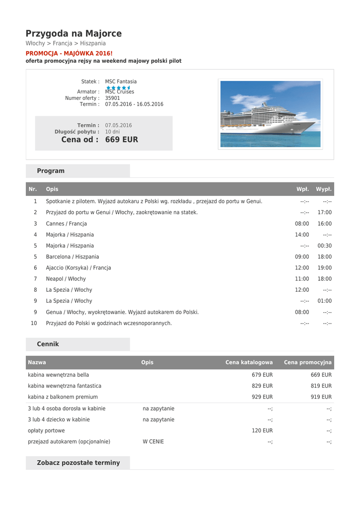 Przygoda na Majorce Włochy > Francja > Hiszpania PROMOCJA - MAJÓWKA 2016! oferta promocyjna rejsy na weekend majowy polski pilot Statek : Armator : Numer oferty : Termin : Termin : Długość pobytu : MSC Fantasia MSC Cruises 35901 07.05.2016 - 16.05.2016 07.05.2016 10 dni Cena od : 669 EUR Program Nr. Opis Wpł. Wypł. 1 Spotkanie z pilotem. Wyjazd autokaru z Polski wg. rozkładu , przejazd do portu w Genui. --:-- --:-- 2 Przyjazd do portu w Genui / Włochy, zaokrętowanie na statek. --:-- 17:00 3 Cannes / Francja 08:00 16:00 4 Majorka / Hiszpania 14:00 --:-- 5 Majorka / Hiszpania --:-- 00:30 5 Barcelona / Hiszpania 09:00 18:00 6 Ajaccio (Korsyka) / Francja 12:00 19:00 7 Neapol / Włochy 11:00 18:00 8 La Spezia / Włochy 12:00 --:-- 9 La Spezia / Włochy --:-- 01:00 9 Genua / Włochy, wyokrętowanie. Wyjazd autokarem do Polski. 08:00 --:-- --:-- --:-- 10 Przyjazd do Polski w godzinach wczesnoporannych. Cennik Nazwa Opis Cena katalogowa Cena promocyjna kabina wewnętrzna bella 679 EUR 669 EUR kabina wewnętrzna fantastica 829 EUR 819 EUR kabina z balkonem premium 929 EUR 919 EUR 3 lub 4 osoba dorosła w kabinie na zapytanie --; --; 3 lub 4 dziecko w kabinie na zapytanie --; --; 120 EUR --; --; --; opłaty portowe przejazd autokarem (opcjonalnie) Zobacz pozostałe terminy W CENIE 07.05.2016 16.07.2016 Informacje dodatkowe cena obejmuje: ● ● ● ● ● ● ● ● ● ● rejs statkiem MSC Fantasia (zakwaterowanie w kabinie wybranej kategorii); przejazd autokarem do portu wg rozkładu; pełne wyżywienie - do dyspozycji restauracja bufetowa, działająca ok. 20 h dziennie (śniadanie, lunch, przekąski, podwieczorek, obiadokolacja, nocny bufet) oraz restauracja a la carte (śniadanie, lunch, obiadokolacja); serwis bagażowy i kabinowy; napoje z dystrybutorów w restauracji bufetowej 24h - kawa, herbata, woda oraz soki do śniadań; korzystanie z urządzeń sportowo - rekreacyjnych znajdujących się na pokładzie statku (basen, jacuzzi, centrum fitness, boiska wielofunkcyjne); korzystanie z ręczników basenowych i leżaków; udział w imprezach organizowanych na statku (przedstawienia w teatrze, koncerty, nauka tańca, animacje); ubezpieczenie KL, NW, BAGAŻU; opiekę polskiego pilota. cena nie obejmuje: ● ● ● ● ● opłat portowych; opłat serwisowych dla załogi statku - 9,00 € osoba/dzień, 4,50 dziecko do 3-14 lat/dzień; korzystania z punktów usługowych na statku m. in.: (fryzjer, pralnia, fotograf, spa, internet) oraz wydatków osobistych; korzystania z barów oraz napojów zamawianych w restauracji a la carte; pakiet napojów All Inclusive - 26€/dzień/osoba dorosła; 12€/dzień/dziecko do 18 lat oraz innych pakietów specjalnych na napoje alkoholowe. uwagi: Kabiny 3/4 osobowe nie są dostępne we wszystkich kategoriach, a ich liczba jest ograniczona - sprzedaż tylko po potwierdzeniu. Grupa realizowana przy min. 20 osobach. Linia MSC wprowadziła podział na podkategorie: - Kategoria Bella: kabiny usytuowane na niższych pokładach. Kabiny z oknem i z balkonem mogą mieć ograniczoną widoczność. Możliwość zamówienia do kabiny śniadania za dopłatą. - Kategoria Fantastica: kabiny usytuowane na wyższych pokładach. Śniadanie serwowane do kabiny w cenie rejsu, 50% zniżki na zajęcia fitness, joga lub treningi na siłowni z indywidualnym trenerem, możliwość wyboru tury kolacji. - Kategoria Aurea: szereg korzyści dla ducha i ciała. Zakwaterowanie w eleganckich kabinach, pierwszeństwo przy zaokrętowaniu, dowolna tura kolacji, napoje do posiłków w barach i w restauracji* w cenie. Dodatkowo klienci otrzymują Pakiet Spa, który zawiera: powitalny koktajl, jeden masaż do wyboru, sesję w solarium, prywatną konsultację w gabinecie odnowy biologicznej, dostęp do Thermal Area. *pakiet napojów dotyczy Allegrisimo bądź More for Less. dojazd własny: ● w przypadku dojazdu własnego zniżka w wysokości 100€/os., możliwość rezerwacji parkingu w porcie. przelot samolotem: ● w przypadku przelotu samolotem z Warszawy (lub innego lotniska w Polsce) zniżka w wysokości 100€/os., możliwy transfer na/z lotniska do portu (dodatkowo płatny). Wylot w godzinach porannych w dniu zaokrętowania. wycieczki fakultatywne: Przygoda na Majorce