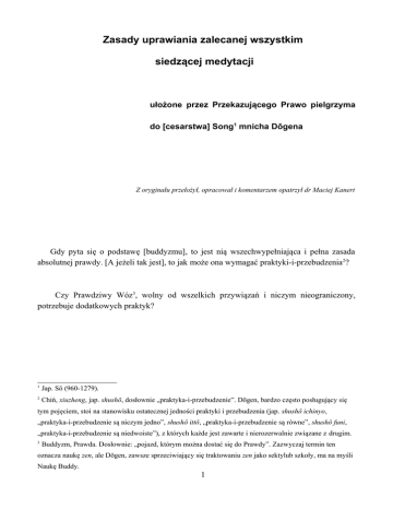 Zasady uprawiania zalecanej wszystkim siedzącej medytacji ułożone przez Przekazującego Prawo pielgrzyma do [cesarstwa] Song1 mnicha Dōgena Z oryginału przełożył, opracował i komentarzem opatrzył dr Maciej Kanert Gdy pyta się o podstawę [buddyzmu], to jest nią wszechwypełniająca i pełna zasada absolutnej prawdy. [A jeżeli tak jest], to jak może ona wymagać praktyki-i-przebudzenia 2? Czy Prawdziwy Wóz3, wolny od wszelkich przywiązań i niczym nieograniczony, potrzebuje dodatkowych praktyk? 1 Jap. Sō (960-1279). 2 Chiń, xiuzheng, jap. shushō, dosłownie „praktyka-i-przebudzenie”. Dōgen, bardzo często posługujący się tym pojęciem, stoi na stanowisku ostatecznej jedności praktyki i przebudzenia (jap. shushō ichinyo, „praktyka-i-przebudzenie są niczym jedno”, shushō ittō, „praktyka-i-przebudzenie są równe”, shushō funi, „praktyka-i-przebudzenie są niedwoiste”), z których każde jest zawarte i nierozerwalnie związane z drugim. 3 Buddyzm, Prawda. Dosłownie: „pojazd, którym można dostać się do Prawdy”. Zazwyczaj termin ten oznacza naukę zen, ale Dōgen, zawsze sprzeciwiający się traktowaniu zen jako sektylub szkoły, ma na myśli Naukę Buddy. 1 A czyż tym bardziej [nie należałoby powiedzieć], iż skoro doskonałe ciało 4 nie wydaje z siebie najmniejszego pyłu i brudu5, któż miałby zaufać jakiejkolwiek metodzie, która miałaby je oczyścić? Nic nie oddala się od swego prawdziwego miejsca 6, czyż znajdzie się zatem ktoś, kto posługiwać się będzie choćby najmniejszą cząstką 7 praktyki? A jednak jeżeli powstanie choć najdrobniejsza8 różnica [miedzy „ja” a Drogą Buddy], to stanie się ona [tak ogromna], jak przestrzeń oddzielająca niebo od ziemi 9. 4 Zwrot ten można rozumieć jako byt, będący ostatecznie Naturą Buddy (por. „A zatem wszelaki byt jest Naturą Buddy. Odczuwające istoty są całym wszechogarniającym bytem”, Dōgen, Oko i Skarbiec Prawdziwego Prawa [Shōbōgenzō], zwój „Natura Buddy”), lub jako ciało praktykującego Drogę Buddy, który poprzez wkroczenie na nią ostatecznie oddalił się od zbrukań wypełniających ten świat. 5 Namiętności i przywiązań pokrywających Naturę Buddy. 6 Prawdziwej i przyrodzonej Natury Buddy, Stanu Oświecenia. 7 W oryginale „krańcem stopy”. Skoro z natury wszystkie odczuwające istoty posiadają Naturę Buddy, to absolutnie żadna praktyka nie jest niezbędna. Takie stwierdzenie, charakterystyczne dla teorii inherentnego przebudzenia (jap. hongaku shisō), było przyczyną, dla której Dōgen, niezadowolony z odpowiedzi udzielanych przez starsze szkoły buddyjskie, trafił do klasztoru Kenninji w Kioto, w którym praktykowano m.in. zen. 8 W oryginale gōri, „tysięczna i setna część”. 9 Dyskursywne działanie intelektu rozróżniające i oddzielające Przebudzenie od kołowrotu narodzin-i- śmierci. 2 Jeżeli pojawi się choćby jedna myśl: „tego pragnę, to zaś jest mi obmierzłe” 10 - w zamęcie straconym będzie prawdziwy umysł. Choć dumni będziemy ze swego rozumienia i wypełnieni przebudzeniem, [choć] zyskamy wiedzę, której wystarczać będzie jedno spojrzenie [by dotrzeć do natury rzeczy], [choć] wkroczymy na Drogę [zyskamy przebudzenie] i pojmiemy [prawdziwy] umysł, [choć] wzbudzimy w sobie wolę sięgnięcia głową niebios a nasza głowa krążyć będzie wokół ścieżki prowadzącej ku górze 11, to pomimo [tego wszystkiego] brak w nas będzie drogi ratującej nasze ciała 12. 10 Dosłownie: „rzeczy, które sprawiają cierpienie i rzeczy, które sprawiają przyjemność”. 11 Ku wyrzeczeniu się świeckiego świata i Przebudzeniu. 12 Cały ten zwrot oznacza „wejście w Przebudzenie”, „wniknięcie w świat Oświecenia”. Dōgen podkreśla niebezpieczeństwo wyłącznie intelektualnego pojmowania buddyzmu. Wedlug Dōgena Prawo Buddy należy poznawać zarówno umysłem jak i ciałem. W „Zgłębianiu Drogi ciałem i umysłem”, 4 zwoju Oka i Skarbca Prawdziwego Prawa napisał: „Kiedy zaczyna się kroczyć Drogą Buddy, przed praktykującym stoją dwie możliwości. Albo zgłębia on [Drogę Buddy] poprzez umysł [świadomość], albo poprzez ciało. (…) Zgłębianie Drogi poprzez ciało oznacza kroczenie Drogą przy pomocy ciała. Jest to zgłębianie Drogi poprzez kości i krew. Ciało staje się [ciałem] poprzez zgłębianie Drogi [dopiero praktykowanie Drogi Buddy nadaje ciału wartość.]. Ciało i zgłębianie Drogi są jednym. Wszystkie światy w dziesięciu kierunkach są prawdziwym ludzkim ciałem. Narodziny i śmierć, odchodzenie i przychodzenie są prawdziwym ludzkim ciałem. Tym ciałem właśnie można porzucić dziesięć [rodzajów] zła, przestrzegać ośmiu wskazań, schronić się w Trzech Drogocennościach [Buddzie, Prawie i Wspólnocie mnichów], porzucić dom i wejść do domu 3 Czyż nie można dostrzec śladów sześcioletniego właściwego siedzenia 13 Przyrodzonego Mądrością14 z Jetavana Anāthapi ikārāma?15 Słychać wciąż kazanie Shaolina16, który przez dziewięć lat [siedział] zwrócony [twarzą] do ściany, [tego], który przekazał nam pieczęć Buddy17. Jeśli już starożytni święci postępowali w ten sposób, [Buddy] [porzucić stan świecki i zostać mnichem]; oto zgłębianie Drogi [praktyka]. Dlatego nazywa się je prawdziwym ludzkim ciałem”. 13 Siedzącej medytacji (chiń. zuochan, jap. zazen). 14 Tytuł Buddy Śākyamuniego (chiń. Shijiamouni, jap. Shakamuni). Posługując się tym słowem Dōgen podkreśla, że nawet osoba posiadająca tak doskonałą przyrodzoną mądrość jak Śākyamuni praktykowała siedzącą medytację. 15 Chiń. Qiyuan jingshe, jap. Gion lub Gion shōja – nazwa parku w stolicy indyjskiego królestwa Kośala, Śrāvastī, wykupionego od księcia Jety przez kupca Sudattę i podarowanego gminie buddyjskiej. W parku tym Budda Śākyamuni miał wygłosić wiele ze swoich kazań. Gion zajął trwałe m