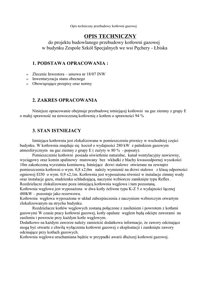 Opis techniczny przebudowy kotłowni gazowej OPIS TECHNICZNY do projektu budowlanego przebudowy kotłowni gazowej w budynku Zespole Szkół Specjalnych we wsi Pęchery - Łbiska 1. PODSTAWA OPRACOWANIA : • • • Zlecenie Inwestora – umowa nr 18/07 INW Inwentaryzacja stanu obecnego Obowiązujące przepisy oraz normy 2. ZAKRES OPRACOWANIA Niniejsze opracowanie obejmuje przebudowę istniejącej kotłowni na gaz ziemny z grupy E o małej sprawność na nowoczesną kotłownię z kotłem o sprawności 94 % 3. STAN ISTNIEJACY Istniejąca kotłownia jest zlokalizowana w pomieszczeniu piwnicy w wschodniej części budynku. W kotłownia znajduje się kocioł o wydajności 280 kW z palnikiem gazowym atmosferycznym na gaz ziemny z grupy E ( zuŜyty w 80 % - popsuty). Pomieszczenie kotłowni posiada oświetlenie naturalne, kanał wentylacyjny nawiewny, wyciągowy oraz komin spalinowy murowany bez wkładki z blachy kwasoodpornej wysokości 10m zakończoną wyrzutnia kominową. Istniejące drzwi stalowe otwierane na zewnątrz pomieszczenia kotłowni o wym. 0,8 x2,0m naleŜy wymienić na drzwi stalowe z klasą odporności ogniowej EI30 o wym. 0,9 x2,1m. Kotłownia jest wyposaŜona równieŜ w instalacje zimnej wody oraz instalacje gazu, studzienka schładzającą, naczynie wzbiorcze zamknięte typu Reflex . Rozdzielacze zlokalizowane poza istniejącą kotłownia węglowa i tam pozostaną. Kotłownia węglowa jest wyposaŜona w dwa kotły Ŝeliwne typu K-Z 5 o wydajności łącznej 480kW – pozostaje jako rezerwowa. Kotłownia węglowa wyposaŜona w układ zabezpieczenia z naczyniem wzbiorczym otwartym zlokalizowanym na strychu budynku. Rozdzielacze kotłów węglowych zostaną połączone z zasileniem i powrotem z kotłami gazowymi W czasie pracy kotłowni gazowej, kotły opalane węglem będą odcięte zaworami na zasileniu i powrocie przy kaŜdym kotle węglowym. Dodatkowo na kaŜdym zaworze naleŜy zamieścić dodatkowa informacje, Ŝe zawory odcinające mogą być otwarte z chwilą wyłączenia kotłowni gazowej z eksploatacji i zamknięte zawory odcinające przy kotłach gazowych. Kotłownia węglowa uruchamiana będzie w przypadki awarii dłuŜszej kotłowni gazowej. Opis techniczny przebudowy kotłowni gazowej 4. ZAŁOśENIA PROJEKTOWE Przebudowywane źródło ciepła opalana będzie gazem ziemnym grupy E doprowadzanym z miejskiej sieci gazowej. Przebudowa kotłowni nie wymaga budowy nowej instalacji gazowej, jedynie montaŜu nowych zaworów odcinających, dopasowanie do projektowanych nowych kotłów gazowych oraz montaŜ systemu wykrywania gazu typu gazex z zaworem sybkozamykającym. Projektuje się kotłownie zasilającą centralne ogrzewanie wodne niskotemperaturowe o parametrach obliczeniowych 80/60 ºC, z instalacją systemu pompowego, dwururowego, z rozdziałem dolnym, zabezpieczone przeponowym naczyniem wzbiorczym. Przewidziano grzejniki ogniwowe, wyposaŜone w zawory termoregulacyjne. Szczegółowe rozwiązania i informacje zawarto w opisie instalacji co. - całkowite zapotrzebowanie ciepła Qco Qco =380kW - całkowite zapotrzebowanie ciepła Qcwu Qco =80kW - całkowite moc kotlowni Qcwu + Qco Qcał =460kW Projektowana kotłownia zwiększy sterowność tj. na intensywną w godzinach 6-18, a w pozostałych godzinach praca wyciszona. 5. PRZYJĘTE ROZWIĄZANIA 5.1. Kocioł W celu uzyskania wymaganej mocy cieplnej dobrano dwa kotły firmy Viessman typ Vitorond 200 typ VD2 o mocy 230 kW wraz modulowanymi palnikami gazowymi typ RS35/M BLUD firmy Riello. Dodatkowe informacje w karcie katalogowej, zamieszczonej w projekcie. 5.2. Pompa Dla obiegów kotłowych dobrano 2 pompy kotłowe firmy Grunfos typu Magna 50-60F o parametrach: − wydajność 13,5 m3/h − wysokość podnoszenia 2,2 mH2O Dla obiegu c.o. części budynku: A lewej, F i G dobrano 1 pompę firmy Grunfos typu Magna 40-100 F o parametrach: − wydajność 6,5 m3/h − wysokość podnoszenia 3,8 mH2O Dla obiegu c.o. części budynku: B, C i D - lewa dobrano 1 pompę firmy Grunfos typu Magna 40-100 F o parametrach: − wydajność 4,00 m3/h − wysokość podnoszenia 3,1 mH2O Dla obiegu c.o. części budynku: H, J i K dobrano 1 pompę firmy Grunfos typu Magna 40-100 F o parametrach: − wydajność 4,4 m3/h − wysokość podnoszenia 3,7 mH2O Dla obiegu c.o. części budynku: A, B, C i D - prawe dobrano 1 pompę firmy Grunfos typu Magna 40-100 F o parametrach: Opis techniczny przebudowy kotłowni gazowej - wydajność 4,4 m3/h - wysokość podnoszenia 3,6 mH2O Dla obiegu ładowania baterii zasobników dobrano 1 pompę Magna 40-100 F o parametrach: − wydajność 8 m3/h − wysokość podnoszenia 3,2 mH2O Dla obiegu ładowania baterii zasobników dobrano 1 pompę APHA 25-60 B o parametrach: − wydajność 1,2 m3/h − wysokość podnoszenia 2,2 mH2O firmy Grunfos typu firmy Grunfos typu Dodatkowe informacje w karcie katalogowej, zamieszczonej w projekcie. 5.3. Opis technologii kotłowni Projektowana kotłownia gazowa będzie zasilać w ciepło instalację centralnego ogrzewania oraz instalację ciepłej wody uŜytkowej. W projekcie zastosowano rozwiązanie ze sprzęgłem hydraulicznym, pompami obiegu kotłowego, pompy obiegów co, pompą obiegu cwu, pompą cyrkulacyjną cwu oraz podgrzewaczem pojemnościowymi cwu. Z kotła czynnik grzewczy (woda kotłowa) przepływa przewodami zasilającymi do sprzęgła hydraulicznego, następnie wraca przewodami powrotnymi do kotłów. Ze sprzęgła hydraulicznego czynnik grzewczy (woda instalacyjna) jest podawany do kolektora zasilania, skąd zasila: − instalację ciepłej wody uŜytkowej − instalację centralnego ogrzewania Z wyŜej wymienionych instalacji czynnik powraca do kolektora powrotnego, a następnie do sprzęgła hydraulicznego. Pompa obiegowa cwu tłoczy czynnik grzewczy z kolektora zasilania do węŜownic pojemnościowych podgrzewaczy cwu, w których zimna woda z instalacji wodociągowej jest podgrzewana do temp. +60°C i jako ciepła woda uŜytkowa jest podawana do instala