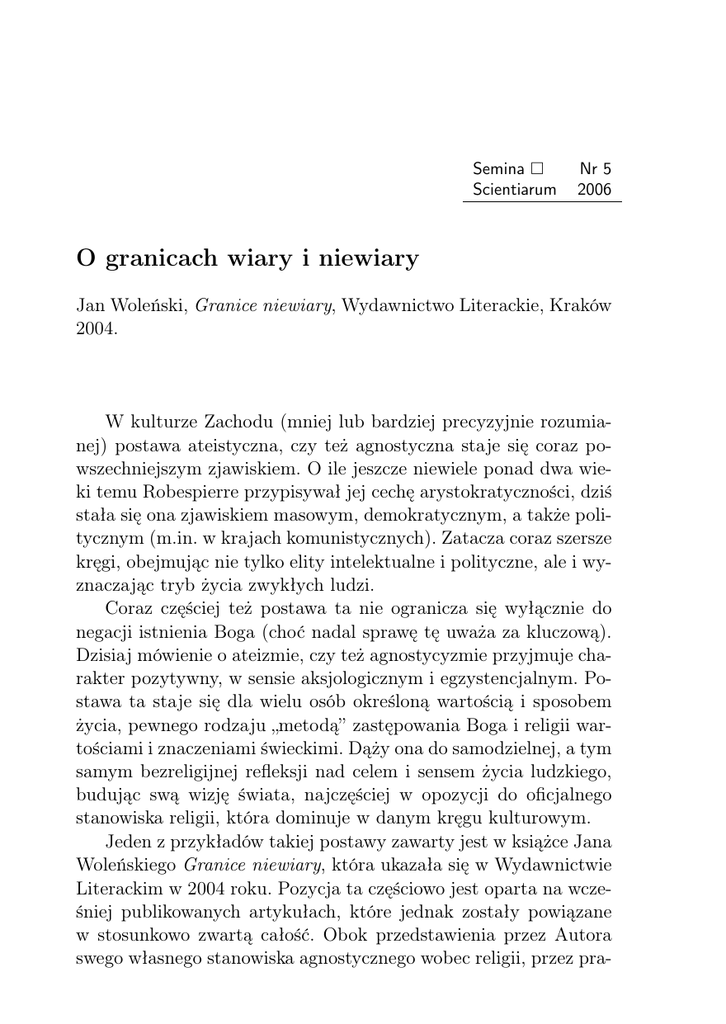 Semina Scientiarum Nr 5 2006 O granicach wiary i niewiary Jan Woleński, Granice niewiary, Wydawnictwo Literackie, Kraków 2004. W kulturze Zachodu (mniej lub bardziej precyzyjnie rozumianej) postawa ateistyczna, czy też agnostyczna staje się coraz powszechniejszym zjawiskiem. O ile jeszcze niewiele ponad dwa wieki temu Robespierre przypisywał jej cechę arystokratyczności, dziś stała się ona zjawiskiem masowym, demokratycznym, a także politycznym (m.in. w krajach komunistycznych). Zatacza coraz szersze kręgi, obejmując nie tylko elity intelektualne i polityczne, ale i wyznaczając tryb życia zwykłych ludzi. Coraz częściej też postawa ta nie ogranicza się wyłącznie do negacji istnienia Boga (choć nadal sprawę tę uważa za kluczową). Dzisiaj mówienie o ateizmie, czy też agnostycyzmie przyjmuje charakter pozytywny, w sensie aksjologicznym i egzystencjalnym. Postawa ta staje się dla wielu osób określoną wartością i sposobem życia, pewnego rodzaju „metodą” zastępowania Boga i religii wartościami i znaczeniami świeckimi. Dąży ona do samodzielnej, a tym samym bezreligijnej refleksji nad celem i sensem życia ludzkiego, budując swą wizję świata, najczęściej w opozycji do oficjalnego stanowiska religii, która dominuje w danym kręgu kulturowym. Jeden z przykładów takiej postawy zawarty jest w książce Jana Woleńskiego Granice niewiary, która ukazała się w Wydawnictwie Literackim w 2004 roku. Pozycja ta częściowo jest oparta na wcześniej publikowanych artykułach, które jednak zostały powiązane w stosunkowo zwartą całość. Obok przedstawienia przez Autora swego własnego stanowiska agnostycznego wobec religii, przez pra- 138 | Polemiki i recenzje wie wszystkie podjęte w książce tematy, przewija się jedna naczelna idea. Idea ta sprowadza się do twierdzenia, że „niewiara ma swoje granice” i że granice te w pewien sposób stanowi wiara (s. 7), jednak nie w tym znaczeniu, jakoby niewierzący w jakimś sensie wyznawali wiarę religijną, nawet jeśli temu zaprzeczają. Wszelako, choć „ludzie zawsze będą w coś wierzyć”, to jednak niekoniecznie będzie to wiara w Boga (s. 90). „Wiara religijna jest granicą agnostycyzmu (niewiary – A.D.)” (s. 8) tylko w stosunku do religii, w sytuacji, „gdy niewierzący staje się wierzącym. I odwrotnie, niewiara bywa granicą wiary, jeśli ktoś (. . . ) odchodzi od religii” (s. 8). Zdaniem Autora „ jest rzeczą niemożliwą, by niewiara miała charakter totalny” (s. 8). Stąd konkluzja: „trzeba w coś wierzyć, aczkolwiek nie w sensie religijnym” (s. 8). Wszystko to sprawia, że książka w dużej mierze ma charakter epistemologiczny, co pociąga za sobą odpowiedni dobór tematów, poruszanych przez Autora. Na książkę składa się, oprócz słowa wstępnego, dziewięć rozdziałów oraz indeks nazwisk, przy czym rozdział I stanowi „Prolog”, a rozdział IX, zamykający całą rzecz – „Epilog”, dotyczący kwestii podejmowanych w debatach o charakterze światopoglądowym. I tak w „Prologu: o religii” Woleński przedstawia swoje stanowisko wobec tych wszystkich zjawisk, które określa mianem „religia”. Oczywiście dominującą postacią religii jest tutaj katolicyzm, ale, jak twierdzi Autor, „równie dobrze można by obrać za materiał każdą inną religię, przynajmniej spośród tych, które związane są z jakąś w miarę rozwiniętą filozofią” (s. 9). Punktem wyjścia rozważań Woleńskiego jest postawa agnostyczna, która – jak twierdzi – „zakładać musi naturalistyczną koncepcję religii – koncepcję, wedle której religia wraz ze wszystkim, co do niej przynależy, jest od początku do końca z tego świata” (s. 15). Naturalista, nie uznając nadprzyrodzonego charakteru religii, „musi jej powstanie ująć jako fakt naturalny” (s. 18), podobnie jak genezę języka, prawa, państwa, moralności, sztuki. Oczywiście Autor zdaje sobie sprawę z tego, że naturalizm „niejedno ma imię”, dlatego w dalszej części charakteryzuje przyjęte przez siebie stanowisko naturalistyczne O granicach wiary i niewiary 139 poprzez: (a) uznanie, że „istnieje tylko to, co ma jakieś konotacje czasowe i przestrzenne oraz zmienia się wraz z biegiem czasu” (dawniej kryteria te spełniała natura w rozumieniu filozofów greckich przed Platonem, natomiast obecnie – to, co badają nauki szczegółowe, głównie przyrodnicze); (b) przyjęcie tezy, że „to, co naturalne (a więc wszystko, co istnieje), poznawalne jest za pomocą przyrodzonych ludzkich narzędzi poznawczych: zmysłów i rozumu”; i wreszcie (c) „zaufanie do owych narzędzi” (s. 15). W negatywnym znaczeniu, postawa naturalistyczna nie uznaje zarówno bytów istniejących w sposób nadprzyrodzony, jak też jakichkolwiek nadprzyrodzonych środków prowadzących do wiedzy. I choć tak rozumiany naturalizm nie jest wolny od trudności, to jednak – jak twierdzi Woleński – rozwiązania, które on niesie „są już choćby dlatego interesujące, że rozwiązania przeciwne budzą co najmniej tak samo poważne zastrzeżenia” (s. 16)1 . Co więcej, zdaniem Woleńskiego, „konsekwentny agnostyk – a za takiego uważa się Autor – nie ma innego wyboru niż opowiedzenie się za naturalizmem jako filozofią czy teorią religii” (s. 22). Przy tym nie musi to być od razu naturalizm globalny, odnoszący się zarówno do spraw ogólnych, jak i szczegółowych. Równie dobrze może to być naturalizm lokalny, dotyczący konkretnych spraw. Postawa taka ma swoje zalety, pozwala bowiem „wytyczyć pewien zakres problemów, na temat których agnostyk może prowadzić owocną (w jakim znaczeniu? – A.D.) debatę z człowiekiem religijnym” (s. 23). Rozdziały II („Przekonania i wiedza”) oraz III („Nauka i racjonalność”) mają charakter zdecydowanie techniczny. Autor skupia się na analizach (zarówno psychologicznych, jak i epistemologicznych, z przewagą t