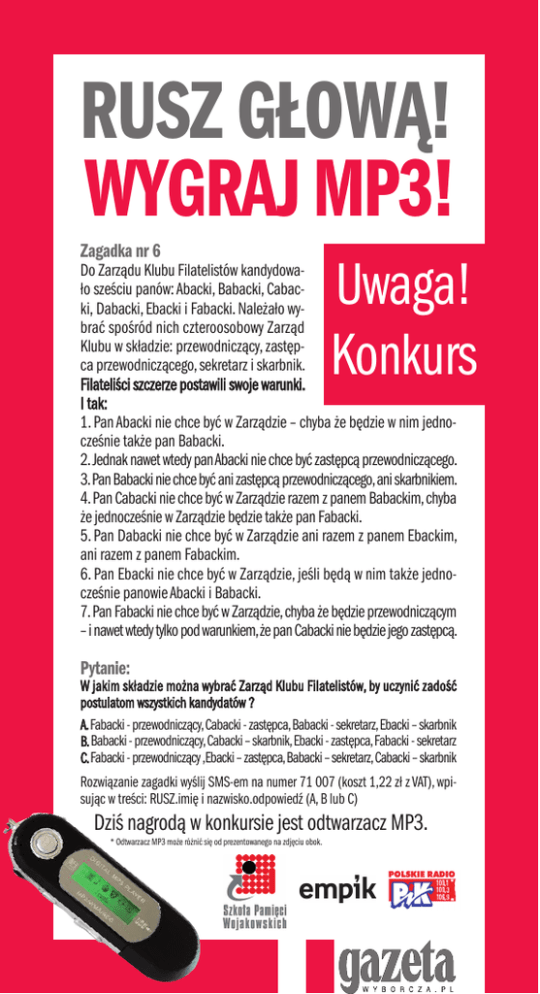RUSZ GŁOWĄ! WYGRAJ MP3! Zagadka nr 6 Uwaga! Konkurs Do Zarządu Klubu Filatelistów kandydowało sześciu panów: Abacki, Babacki, Cabacki, Dabacki, Ebacki i Fabacki. Należało wybrać spośród nich czteroosobowy Zarząd Klubu w składzie: przewodniczący, zastępca przewodniczącego, sekretarz i skarbnik. Filateliści szczerze postawili swoje warunki. I tak: 1. Pan Abacki nie chce być w Zarządzie – chyba że będzie w nim jednocześnie także pan Babacki. 2. Jednak nawet wtedy pan Abacki nie chce być zastępcą przewodniczącego. 3. Pan Babacki nie chce być ani zastępcą przewodniczącego, ani skarbnikiem. 4. Pan Cabacki nie chce być w Zarządzie razem z panem Babackim, chyba że jednocześnie w Zarządzie będzie także pan Fabacki. 5. Pan Dabacki nie chce być w Zarządzie ani razem z panem Ebackim, ani razem z panem Fabackim. 6. Pan Ebacki nie chce być w Zarządzie, jeśli będą w nim także jednocześnie panowie Abacki i Babacki. 7. Pan Fabacki nie chce być w Zarządzie, chyba że będzie przewodniczącym – i nawet wtedy tylko pod warunkiem, że pan Cabacki nie będzie jego zastępcą. Pytanie: W jakim składzie można wybrać Zarząd Klubu Filatelistów, by uczynić zadość postulatom wszystkich kandydatów ? A. Fabacki - przewodniczący, Cabacki - zastępca, Babacki - sekretarz, Ebacki – skarbnik B. Babacki - przewodniczący, Cabacki – skarbnik, Ebacki - zastępca, Fabacki - sekretarz C. Fabacki - przewodniczący ,Ebacki – zastępca, Babacki – sekretarz, Cabacki – skarbnik Rozwiązanie zagadki wyślij SMS-em na numer 71 007 (koszt 1,22 zł z VAT), wpisując w treści: RUSZ.imię i nazwisko.odpowiedź (A, B lub C) Dziś nagrodą w konkursie jest odtwarzacz MP3. * Odtwarzacz MP3 może różnić się od prezentowanego na zdjęciu obok.