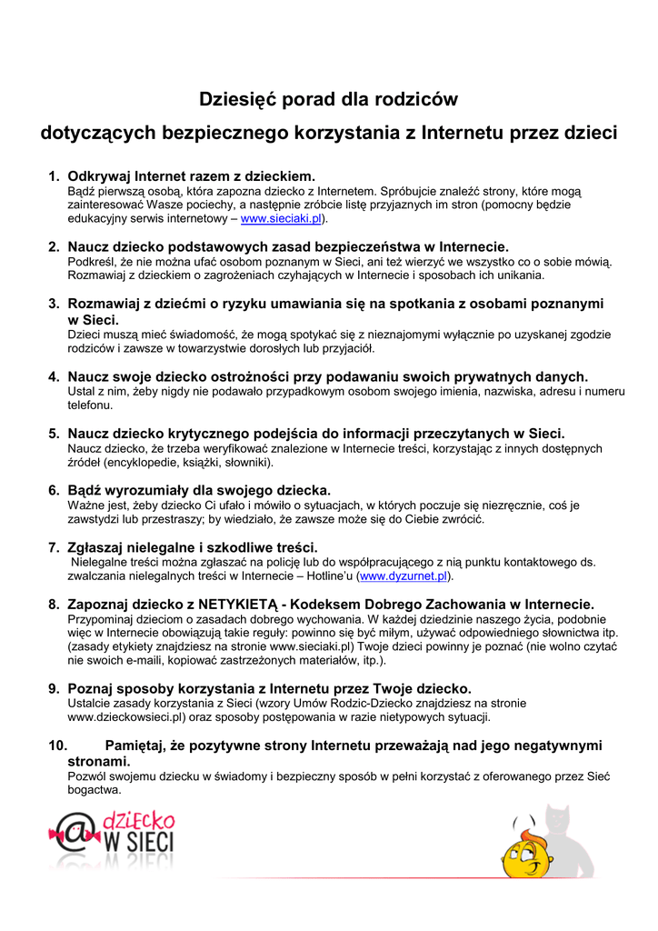 Dziesięć porad dla rodziców dotyczących bezpiecznego korzystania z Internetu przez dzieci 1. Odkrywaj Internet razem z dzieckiem. Bądź pierwszą osobą, która zapozna dziecko z Internetem. Spróbujcie znaleźć strony, które mogą zainteresować Wasze pociechy, a następnie zróbcie listę przyjaznych im stron (pomocny będzie edukacyjny serwis internetowy – www.sieciaki.pl). 2. Naucz dziecko podstawowych zasad bezpieczeństwa w Internecie. Podkreśl, Ŝe nie moŜna ufać osobom poznanym w Sieci, ani teŜ wierzyć we wszystko co o sobie mówią. Rozmawiaj z dzieckiem o zagroŜeniach czyhających w Internecie i sposobach ich unikania. 3. Rozmawiaj z dziećmi o ryzyku umawiania się na spotkania z osobami poznanymi w Sieci. Dzieci muszą mieć świadomość, Ŝe mogą spotykać się z nieznajomymi wyłącznie po uzyskanej zgodzie rodziców i zawsze w towarzystwie dorosłych lub przyjaciół. 4. Naucz swoje dziecko ostroŜności przy podawaniu swoich prywatnych danych. Ustal z nim, Ŝeby nigdy nie podawało przypadkowym osobom swojego imienia, nazwiska, adresu i numeru telefonu. 5. Naucz dziecko krytycznego podejścia do informacji przeczytanych w Sieci. Naucz dziecko, Ŝe trzeba weryfikować znalezione w Internecie treści, korzystając z innych dostępnych źródeł (encyklopedie, ksiąŜki, słowniki). 6. Bądź wyrozumiały dla swojego dziecka. WaŜne jest, Ŝeby dziecko Ci ufało i mówiło o sytuacjach, w których poczuje się niezręcznie, coś je zawstydzi lub przestraszy; by wiedziało, Ŝe zawsze moŜe się do Ciebie zwrócić. 7. Zgłaszaj nielegalne i szkodliwe treści. Nielegalne treści moŜna zgłaszać na policję lub do współpracującego z nią punktu kontaktowego ds. zwalczania nielegalnych treści w Internecie – Hotline’u (www.dyzurnet.pl). 8. Zapoznaj dziecko z NETYKIETĄ - Kodeksem Dobrego Zachowania w Internecie. Przypominaj dzieciom o zasadach dobrego wychowania. W kaŜdej dziedzinie naszego Ŝycia, podobnie więc w Internecie obowiązują takie reguły: powinno się być miłym, uŜywać odpowiedniego słownictwa itp. (zasady etykiety znajdziesz na stronie www.sieciaki.pl) Twoje dzieci powinny je poznać (nie wolno czytać nie swoich e-maili, kopiować zastrzeŜonych materiałów, itp.). 9. Poznaj sposoby korzystania z Internetu przez Twoje dziecko. Ustalcie zasady korzystania z Sieci (wzory Umów Rodzic-Dziecko znajdziesz na stronie www.dzieckowsieci.pl) oraz sposoby postępowania w razie nietypowych sytuacji. 10. Pamiętaj, Ŝe pozytywne strony Internetu przewaŜają nad jego negatywnymi stronami. Pozwól swojemu dziecku w świadomy i bezpieczny sposób w pełni korzystać z oferowanego przez Sieć bogactwa.