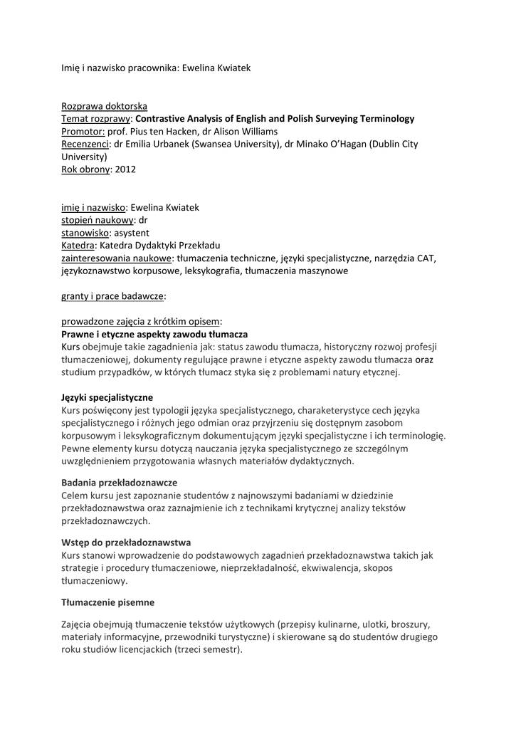 Imię i nazwisko pracownika: Ewelina Kwiatek Rozprawa doktorska Temat rozprawy: Contrastive Analysis of English and Polish Surveying Terminology Promotor: prof. Pius ten Hacken, dr Alison Williams Recenzenci: dr Emilia Urbanek (Swansea University), dr Minako O’Hagan (Dublin City University) Rok obrony: 2012 imię i nazwisko: Ewelina Kwiatek stopień naukowy: dr stanowisko: asystent Katedra: Katedra Dydaktyki Przekładu zainteresowania naukowe: tłumaczenia techniczne, języki specjalistyczne, narzędzia CAT, językoznawstwo korpusowe, leksykografia, tłumaczenia maszynowe granty i prace badawcze: prowadzone zajęcia z krótkim opisem: Prawne i etyczne aspekty zawodu tłumacza Kurs obejmuje takie zagadnienia jak: status zawodu tłumacza, historyczny rozwoj profesji tłumaczeniowej, dokumenty regulujące prawne i etyczne aspekty zawodu tłumacza oraz studium przypadków, w których tłumacz styka się z problemami natury etycznej. Języki specjalistyczne Kurs poświęcony jest typologii języka specjalistycznego, charaketerystyce cech języka specjalistycznego i różnych jego odmian oraz przyjrzeniu się dostępnym zasobom korpusowym i leksykograficznym dokumentującym języki specjalistyczne i ich terminologię. Pewne elementy kursu dotyczą nauczania języka specjalistycznego ze szczególnym uwzględnieniem przygotowania własnych materiałów dydaktycznych. Badania przekładoznawcze Celem kursu jest zapoznanie studentów z najnowszymi badaniami w dziedzinie przekładoznawstwa oraz zaznajmienie ich z technikami krytycznej analizy tekstów przekładoznawczych. Wstęp do przekładoznawstwa Kurs stanowi wprowadzenie do podstawowych zagadnień przekładoznawstwa takich jak strategie i procedury tłumaczeniowe, nieprzekładalność, ekwiwalencja, skopos tłumaczeniowy. Tłumaczenie pisemne Zajęcia obejmują tłumaczenie tekstów użytkowych (przepisy kulinarne, ulotki, broszury, materiały informacyjne, przewodniki turystyczne) i skierowane są do studentów drugiego roku studiów licencjackich (trzeci semestr). Seminarium przekładoznawcze Seminarium ma na celu zapoznanie studentów z zasadami pisania prac licencjackich lub magisterskich, t.j. tworzenie bibliografii, system cytowania i referencji, edycja tekstu – praca ze stylami, oraz wsparcie merytoryczne przy określaniu problemu badawczego, formułowaniu hipotezy oraz przy redagowaniu pracy. członkostwo w stowarzyszeniach i instytucjach naukowych: członek Krakowskiego Towarzystwa Popularyzowania Wiedzy o Komunikacji Językowej „Tertium” współpraca międzynarodowa: projekt EGPS (European Graduate Placement Scheme), Erasmus – Koszyce, Słowacja udział w konferencjach naukowych krajowych i zagranicznych: EST Congress, 29 sierpnia – 1 września 2013, Germersheim, Niemcy 1st International Conference on Teaching English for Specific Purposes, 17-19 maj 2013, Niš, Serbia International Scientific Conference Meaning in Translation: Illusion of Precision, 1215 września, 2012, Ryga, Łotwa British Association of Slavonic and Eastern European Languages (BASEES) conference, 2-4 kwietnia 2011, Cambridge, Wielka Brytania Copenhagen Symposium: Approaches to the Lexicon, 8-10 grudnia 2010, Kopenhaga, Dania International Terminology Summer School, 7-11 lipca 2008, Wiedeń, Austria nagrody i wyróżnienia: stypendium naukowe Swansea University na studia doktoranckie kontakt: tel: +48 12 662 6961, email: [email protected], www: http://www.kdp.up.krakow.pl/ewelina-kwiatek/, nr pokoju: 202 Publikacje : Monografie Kwiatek, E. 2013, Contrastive Analysis of English and Polish Surveying Terminology. Cambridge Scholars Publishing: Newcastle, UK Artykuły Kwiatek, E. (w druku). ‘When terms do not match: Translation strategies for dealing with conceptual mismatches in surveying terminology’. Proceedings of the conference „Meaning in Translation: Illusion of Precision”. 12-15 września 2011, Ryga, Łotwa Kwiatek, E. 2013. ‘English for Land Surveying’. Proceedings of the 1st International Conference on Teaching English for Specific Purposes. Faculty of Electronic Engineering, University of Niš, Serbia. (str. 588-596) Ten Hacken, P. & Kwiatek, E. 2013. ‘Nominal compounds as naming devices: a comparison of English and Polish land surveying terminology’ [w:} ten Hacken, P. & Thomas, C. (red.). The Semantics of Word Formation and Lexicalization. Edinburgh: Edinburgh University Press Kwiatek, E. & ten Hacken, P. 2011. ‘Efficiency of MultiTerm for extraction of terms from English and Polish specialized corpora’. {w} Goźdź-Roszkowski, S. (red.) Explorations across Languages and Corpora. Łódź Studies in Language. Frankfurt am Main: Peter Lang. str. 145162. Promotorstwo: 4 prace licencjackie (Uniwersytet Pedagogiczny w Krakowie), 5 prac magisterskich (Swansea University) Data aktualizacji: 27.11.2013