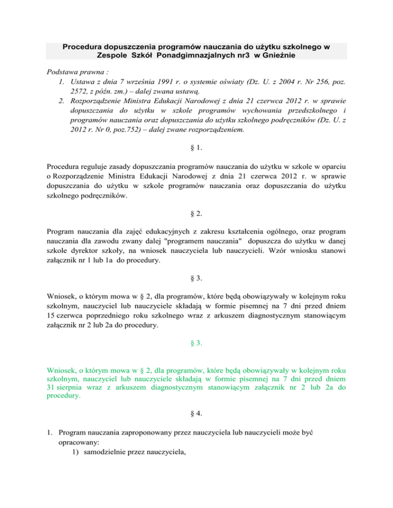Procedura dopuszczenia programów nauczania do użytku szkolnego w Zespole Szkół Ponadgimnazjalnych nr3 w Gnieźnie Podstawa prawna : 1. Ustawa z dnia 7 września 1991 r. o systemie oświaty (Dz. U. z 2004 r. Nr 256, poz. 2572, z późn. zm.) – dalej zwana ustawą. 2. Rozporządzenie Ministra Edukacji Narodowej z dnia 21 czerwca 2012 r. w sprawie dopuszczania do użytku w szkole programów wychowania przedszkolnego i programów nauczania oraz dopuszczania do użytku szkolnego podręczników (Dz. U. z 2012 r. Nr 0, poz.752) – dalej zwane rozporządzeniem. § 1. Procedura reguluje zasady dopuszczania programów nauczania do użytku w szkole w oparciu o Rozporządzenie Ministra Edukacji Narodowej z dnia 21 czerwca 2012 r. w sprawie dopuszczania do użytku w szkole programów nauczania oraz dopuszczania do użytku szkolnego podręczników. § 2. Program nauczania dla zajęć edukacyjnych z zakresu kształcenia ogólnego, oraz program nauczania dla zawodu zwany dalej "programem nauczania" dopuszcza do użytku w danej szkole dyrektor szkoły, na wniosek nauczyciela lub nauczycieli. Wzór wniosku stanowi załącznik nr 1 lub 1a do procedury. § 3. Wniosek, o którym mowa w § 2, dla programów, które będą obowiązywały w kolejnym roku szkolnym, nauczyciel lub nauczyciele składają w formie pisemnej na 7 dni przed dniem 15 czerwca poprzedniego roku szkolnego wraz z arkuszem diagnostycznym stanowiącym załącznik nr 2 lub 2a do procedury. § 3. Wniosek, o którym mowa w § 2, dla programów, które będą obowiązywały w kolejnym roku szkolnym, nauczyciel lub nauczyciele składają w formie pisemnej na 7 dni przed dniem 31 sierpnia wraz z arkuszem diagnostycznym stanowiącym załącznik nr 2 lub 2a do procedury. § 4. 1. Program nauczania zaproponowany przez nauczyciela lub nauczycieli może być opracowany: 1) samodzielnie przez nauczyciela, 2) we współpracy z innymi nauczycielami, 3) przez innego autora (autorów), 4) przez innego autora (autorów) wraz z dokonanymi zmianami. § 5. Zaproponowany przez nauczyciela lub nauczycieli program nauczania powinien być dostosowany do potrzeb i możliwości uczniów, dla których jest przeznaczony. § 6. 1. Program nauczania ogólnego obejmuje, co najmniej jeden etap edukacyjny i może być dopuszczony do użytku w danej szkole, jeżeli: 1) stanowi opis sposobu realizacji celów kształcenia i zadań edukacyjnych ustalonych w podstawie programowej kształcenia ogólnego, określonej w przepisach w sprawie podstawy programowej kształcenia ogólnego w poszczególnych typach szkół; 2) zawiera: a) szczegółowe cele kształcenia i wychowania, b) treści zgodne z treściami nauczania zawartymi w podstawie programowej kształcenia ogólnego, c) sposoby osiągania celów kształcenia i wychowania, z uwzględnieniem możliwości indywidualizacji pracy w zależności od potrzeb i możliwości uczniów oraz warunków, w jakich program będzie realizowany, d) opis założonych osiągnięć ucznia, a w przypadku programu nauczania ogólnego uwzględniającego dotychczasową podstawę programową kształcenia ogólnego - opis założonych osiągnięć ucznia z uwzględnieniem standardów wymagań będących podstawą przeprowadzania sprawdzianów i egzaminów, określonych w przepisach w sprawie standardów wymagań będących podstawą przeprowadzania sprawdzianów i egzaminów, e) propozycje kryteriów oceny i metod sprawdzania osiągnięć ucznia; 3) jest poprawny pod względem merytorycznym i dydaktycznym. §7 1. Program nauczania dla zawodu może być dopuszczony do użytku w szkole, jeżeli: 1) stanowi zbiór celów kształcenia i treści nauczania ustalonych w podstawie programowej kształcenia w zawodach, określonej w rozporządzeniu MEN w sprawie podstawy programowej kształcenia w zawodach, w formie efektów kształcenia właściwych dla zawodu, w którym kształci szkoła; 2) zawiera programy nauczania poszczególnych obowiązkowych zajęć edukacyjnych z zakresu kształcenia zawodowego, ustalonych przez dyrektora szkoły w szkolnym planie nauczania: przedmiotów, modułów lub innych układów treści, obejmujące: a) uszczegółowione efekty kształcenia, o których mowa w pkt. 1, które powinny być osiągnięte przez ucznia w procesie kształcenia, oraz propozycje kryteriów oceny i metod sprawdzania tych osiągnięć, b) opis sposobu osiągnięcia uszczegółowionych efektów kształcenia, o których mowa w pkt. 1, z uwzględnieniem indywidualizacji pracy w zależności od potrzeb i możliwości uczniów, c) opis warunków, w jakich program będzie realizowany, z uwzględnieniem warunków realizacji kształcenia w danym zawodzie, ustalonych w podstawie programowej kształcenia w zawodach, 3) uwzględnia wyodrębnienie kwalifikacji w zawodzie zgodnie z klasyfikacją zawodów szkolnictwa zawodowego; 4) jest poprawny pod względem merytorycznym i dydaktycznym. § 8. 1. Przed dopuszczeniem programu nauczania ogólnego do użytku w danej szkole - w przypadku wątpliwości, czy przedstawiony program spełnia wszystkie warunki opisane w § 6 - dyrektor szkoły może zasięgnąć opinii: 1) nauczyciela mianowanego lub dyplomowanego, posiadającego wykształcenie wyższe i kwalifikacje wymagane do prowadzenia zajęć edukacyjnych, dla których program jest przeznaczony, 2) konsultanta lub doradcy metodycznego, 3) zespołu nauczycielskiego, zespołu przedmiotowego lub innego zespołu problemowo – zadaniowego. § 9. 1. Przed dopuszczeniem programu nauczania dla zawodu do użytku w danej szkole- w przypadku wątpliwości, czy przedstawiony program spełnia wszystkie warunki opisane w § 7 - dyrektor szkoły może zasięgnąć opinii: 1) zespołu nauczycieli właściwych dla zawodu, 2) konsultanta lub doradcy metodycznego, 3) specjalistów z zakresu danego zawodu, w szczególności pracodawców, przedstawicieli stowarzyszeń zawodowych i pracowników naukowych. § 10. 1. Opinia, o której mowa w § 8 i § 9 , zawiera w szczególności ocenę z