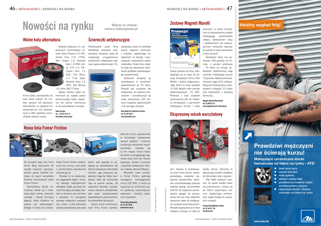 46 | AKTUALNOŚCI | NOWOŚCI NA RYNKU NOWOŚCI NA RYNKU | AKTUALNOŚCI | Nowości na rynku Wolne koła alternatora Firma Gates wprowadziła do swej oferty kolejne 33 modele wolnych kół pasowych alternatorów, co zwiększa ich asortyment do 125, stosowanych w 280 modelach samochodów różnych marek. Nowości dotyczą m.in. popularnych samochodów: Citroën Xsara Picasso 2.0 HDi, Honda Civic 2.2L i-CTDi, Mini Cooper 1.6, Hyundai Getz 1.5 CRDi, Vol vo V70 2.4 TDi, Toyota Yaris 1.4 D4d, Fiat Bravo 1.4 T-Jet, Opel/ Vauxhall Astra 1.3 CDTi, Alfa Romeo 1.8, Volvo S60 2 Turbo. Oprócz dostaw części zamiennych do napędu paska pomocniczego Gates zapewnia też pomoc techniczną w ich prawidłowym montażu. Zestawy Magneti Marelli Więcej na stronie: www.e-autonaprawa.pl Ściereczki antykorozyjne Produkowane przez firmę AkzoNobel ściereczki antykorozyjne Autoprep służą do wstępnego przygotowania powierzchni metalowych podczas napraw lakierniczych. Po- Gates Europe tel. +32 53 76 27 17 www.Gates.com/europe 47 Idealny wygląd felg! pracować w trybie manualnym (z odzyskiwaniem środka chłodzącego, opróżnianiem układu, dodawaniem oleju i napełnianiem) lub automatycznym (wszystkie operacje po wybraniu kodu samochodu z bazy danych). Kompresor stacji ma wydajność 300 gramów na minutę, a pompa próżniowa – 70 litrów na minutę; dokładność elektronicznej wagi czynnika chłodzącego wynosi 10 gramów. Maksymalne podciśnienie sięga 0,05 milibara. Stacja jest dostarczana z przewodami o długości 2,5 metra oraz opcjonalnie z drukarką termiczną. zostawiana przez nie powłoka tworzy wiązania chemiczne z metalem, zapewniając mu odporność na korozję i przyczepność nanoszonych potem materiałów. Dzięki temu zbędne staje się natryskowe stosowanie podkładu wytrawiającego (washprimera). Ściereczki Autoprep są sprzedawane w szczelnych opakowaniach po 25 sztuk. Produkt jest przyjazny dla środowiska: nie zawiera chromianów i charakteryzuje się niską zawartością LZO (lotnych związków organicznych) i nie wymaga utylizacji. Zakup zestawu tej firmy, składającego się ze stacji do obsługi klimatyzacji Clima Tech Mobile i testera diagnostycznego Smart to teraz wydatek 15 000 złotych netto zamiast dotychczasowych 19 500. Pierwsze z tych urządzeń przeznaczone jest do instalacji klimatyzacji z czynnikiem chłodzącym R134a i może Akzo Nobel Car Refinishes Polska tel. 22 321 06 21 www.akzonobel.com Ekspresowy wózek warsztatowy Magneti Marelli Aftermarket tel. 32 603 61 43 www.magnetimarelli-checkstar.pl Nowa linia Fomar Friction Autonaprawa | Lipiec/sierpień 2012 klocki. Jeśli zjawisko to występuje po zamontowaniu tak dobrze izolowanych elementów ciernych, jego przyczyną najpewniej mogą być błędy montażowe, takie jak nieusunięta rdza na jarzmie zacisku, złe ustawienie tłoczków, pozostawienie zatartych prowadników albo wręcz niezastosowanie przewidzianych przez konstruktora elementów tłumiących. Oprócz zmian konstrukcyjnych firma Fomar wprowa- Fomar Borg Automotive tel. 22 781 38 28 www.fomar.com.pl Małopylące ceramiczne klocki hamulcowe od lidera na rynku - ATE! Fot. Facom, Magneti Marelli towej Fomar Friction zastosowano tzw. shimsy, czyli płytki z cienkiej blachy, dwustronnie pokrytej gumą. Pozwala to na skuteczniejsze wygaszanie drgań i znaczną redukcję nieprzyjemnych dźwięków dzięki gumowej barierze tłumiącej pomiędzy klockiem a shimsem oraz shimsem a zaciskiem. To rozwiązanie pozwala ostatecznie rozprawić się z mitem, iż pisk hamulców zawsze powodowany jest przez Prawdziwi mężczyzni nie ścierają kurzu! Fot. Akzo Nobel, Fomar, Gates Od początku tego roku firma Fomar Borg Automotive SA zaczęła stosować specjalne, pokryte gumą nakładki tłumiące do swych kompletów klocków hamulcowych marki Fomar Friction. Standardowy klocek hamulcowy składa się z metalowej płytki nośnej, materiału ciernego i blaszki tłumiącej drgania, której działanie nie zawsze jest zadowalające. Dlatego w nowej linii produk- dziła też liczne usprawnienia w technologii wytwarzania samych okładzin i znacznie rozszerzyła asortyment swych produktów. Znalazły się w nim między innymi klocki do bardzo wymagającego segmentu klasy SUV (np. Nissan Quashqai, Citroën C-Crosser) i pojazdów dostawczych (Nissan Cabstar, Renault Maxity). Wszystkie nowe produkty Fomar Friction spełniają wymagania homologacyjne normy ECE R90, a można je rozpoznać po zmienionej szacie graficznej sztywniejszych opakowań i bardziej czytelnych etykietach. Jet+ Express to produkowany przez firmę Facom wózek, pozwalający zwiększyć wydajność pracowników warsztatu samochodowego podczas szybkiej obsługi samochodów (fast-fit). W urządzeniu zamontowano agregat do pompowania kół oraz dwa oddzielne elastyczne węże do podłączenia narzędzi pneumatycznych. Ponadto wyposażono je w dwa składane uchwyty na koła po n n n n n każdej stronie. Elementy te ograniczają wysiłek niezbędny do demontażu koła z pojazdu. Pięć kółek jezdnych sprawia, że wózek bardzo łatwo się przemieszcza i obraca się po lekkim popchnięciu palcem, zapewniając mechanikom szybki dostęp do wszystkich narzędzi. n Stanley Black&Decker Polska tel. 22 46 42 754 www.facom.pl Autonaprawa | Lipiec/sierpień 2012 www.ate.de brak bicia tarcz wysoki komfort małe pylenie idealna optyka felgi przedłużona trwałość dzięki zmniejszonemu zużyciu najwyższa jakość i bezpieczeństwo od lidera na rynku
