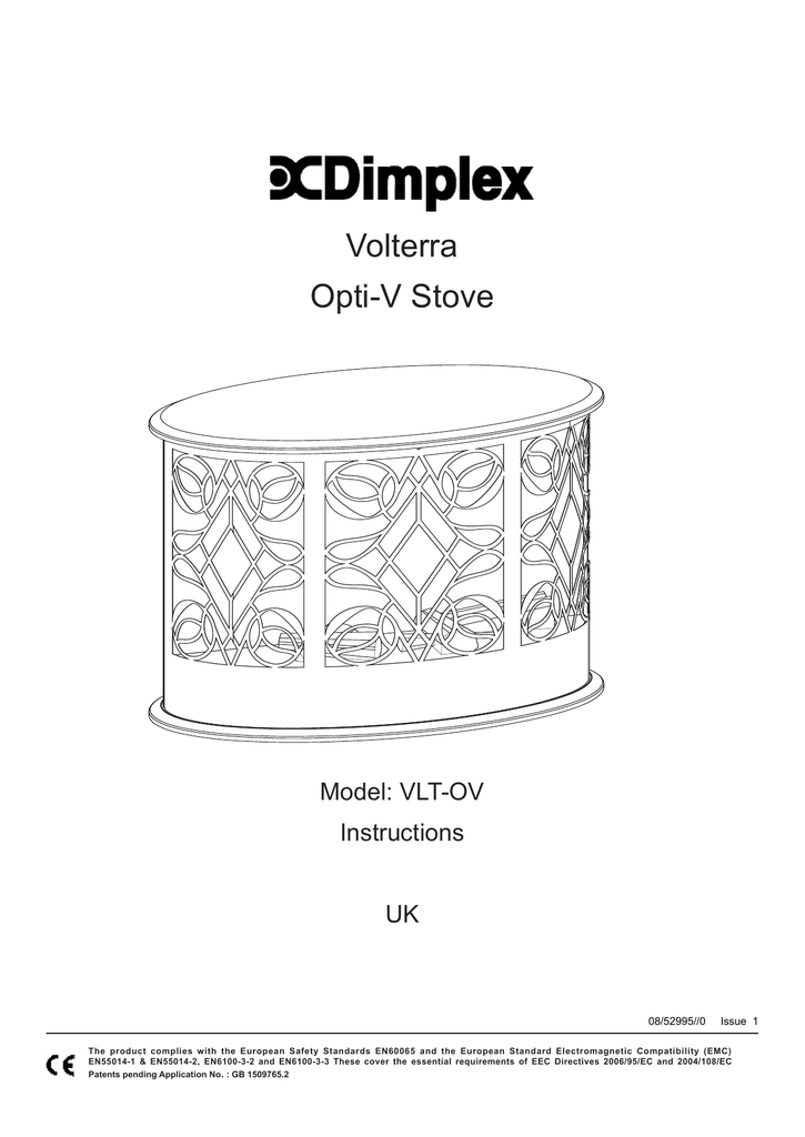 Volterra Opti-V Stove Model: VLT-OV Instructions UK 08/52995//0 Issue 1 The product complies with the European Safety Standards EN60065 and the European Standard Electromagnetic Compatibility (EMC) EN55014-1 & EN55014-2, EN6100-3-2 and EN6100-3-3 These cover the essential requirements of EEC Directives 2006/95/EC and 2004/108/EC Patents pending Application No. : GB 1509765.2 Opti-V Volterra : VLT-OV UK IMPORTANT: THESE INSTRUCTIONS SHOULD BE READ CAREFULLY AND RETAINED FOR FUTURE REFERENCE Introduction Thank you for chosing this Dimplex Opti-V stove. Please read information guide carefully to be able to safely install, use and maintain your product. Important Safety Advice When using electrical appliances, basic precautions should be followed to reduce the risk of fire, electric shock, and injury to persons, including the following: If the appliance is damaged, check immediately with the supplier before installation and operation. Do not use this appliance in the immediate surroundings of a bath, shower or swimming pool. Means for disconnection must be incorporated in the fixed wiring in accordance with the wiring regulations. Do not use outdoors. In the event of a fault disconnect the appliance from mains supply. Switch off the appliance when not required for long periods. If the supply cord is damaged, it must be replaced by a special cord or assembly available from the manufacturer or its service agent. Warning - No naked flame sources, such as candles, should be placed on this apparatus. Warning - The appliance shall not be exposed to dripping or splashing and that no objects filled with liquid, such as vases, shall be placed on the apparatus. Warning - this appliance is of Class I construction and must be connected to a mains outlet with protective earthing connection. Electrical WARNING – THIS APPLIANCE MUST BE EARTHED Do not switch the appliance on until properly installed. Please read all the safety warnings and operating instructions. General Unpack the appliance carefully and retain the packaging for possible further use, in the event of moving or returning the appliance to the supplier. Contents of Carton • • • Opti-V Stove Model VLT-OV Remote control Supply cord Product Features Volume Control Remote or Manual operation Red light indication of standby mode Installation Warning. Do not connect the appliance until the instruction leaflet is read fully. Connect the supply cord(kettle type connection) to the socket at the back of the appliance and plug opposite end to mains supply. Operation - remote control: The appliance by default is in standby mode, indicated by a red light at the front of the appliance. To activate the remote control, remove the battery clear, plastic strip, which is used to ensure the remote is fully charged before use - see Fig.2. To operate, aim the remote control to the front of the appliance. Press the standby button ( ) on the remote control (see Fig. 2). The fuelbed will light up and after approximately 7 seconds the flame will appear. Note: The user may notice a blank screen for approximately 3 seconds, every 30 minutes. This is normal and should not be a cause for concern. The audio volume may be adjusted up or down by pressing the volume control buttons ( + and -). To create the shadow effect on floor, press the shadow ‘light on’ button ( ). To turn the effect off, press the shadow ‘light off’ button( ). For battery replacment refer to the embossed diagram on the back of the remote control. NOTE - Use Lithium batteries only - CR2025 Attention should be drawn to the environmental aspects of battery disposal. Manual Control Operation: The manual controls are located at the back(top) of the appliance.(see Fig. 3). Maintenance WARNING – ALWAYS DISCONNECT FROM THE POWER SUPPLY BEFORE ATTEMPTING ANY MAINTENANCE. Techical Information: 100-240V ~ 50/60Hz Power consumption 28W Stand-by Power 1W Cleaning For general cleaning use a soft clean duster – never use abrasive cleaners. Recycling For electrical products sold within the European Community. At the end of the electrical products useful life it should not be disposed of with household waste. Please recycle where facilities exist. Check with your Local Authority or retailer for recycling advice in your country. After Sales Service Should you require after sales service or should you need to purchase any spares, please contact the retailer from whom the appliance was purchased. Please retain your receipt for proof of purchase. 1 420 360 520 625 2 3 The product complies with the European Safety Standards EN60065 and the European Standard Electromagnetic Compatibility (EMC) EN55014-1 & EN55014-2, EN6100-3-2 and EN6100-3-3 These cover the essential requirements of EEC Directives 2006/95/EC and 2004/108/EC Patents pending Application No. : GB 1509765.2 Dimplex TEL: 0844 879 3588 Millbrook House FAX: 0844 879 3583 Grange Drive WEBSITE: www.dimplex.co.uk Hedge End Southampton Republic of Ireland Tel. 01 8424833 Hampshire. SO30 2DF [c] GDC Group Ltd, All rights reserved. Material contained in this publication may not be reproduced in whole or in part, without prior permission in writing of Dimplex. A division of GDC Group Ltd,