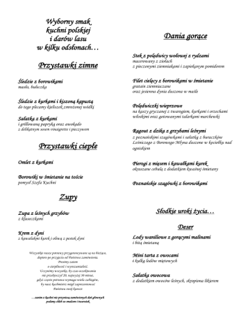 Wyborny smak kuchni polskiej i darów lasu w kilku odsłonach… Dania gorące Stek z polędwicy wołowej z rydzami Przystawki zimne Śledzie z borowikami masło, bułeczka Śledzie z kurkami i kiszoną kapustą do tego plecamy kieliszek zmrożonej wódki Sałatka z kurkami macerowany z ziołach z pieczonymi ziemniakami i zapiekanym pomidorem Filet cielęcy z borowikami w śmietanie gratain ziemniaczane oraz jesienna dynia duszona w maśle Polędwiczki wieprzowe na kaszy gryczanej z twarogiem, kurkami i orzechami włoskimi oraz gotowanymi talarkami marchewki i grillowaną papryką oraz awokado z delikatnym sosem vinaigrette i pieczywem Przystawki ciepłe Omlet z kurkami Ragout z dzika z grzybami leśnymi z poznańskimi szagówkami i sałatką z buraczków Leśniczego z Borowego Młyna duszone w kociołku nad ogniskiem Pierogi z mięsem i kawałkami kurek okraszane cebulą z dodatkiem kwaśnej śmietany Borowiki w śmietanie na toście pomysł Szefa Kuchni Poznańskie szagówki z borowikami Zupy Zupa z leśnych grzybów Słodkie uroki życia… z kluseczkami Krem z dyni z kawałakmi kurek i oliwą z pestek dyni Wszystkie nasze potrawy przygotowywane są na bieżąco, dopiero po przyjęciu od Państwa zamówienia. Prosimy zatem o cierpliwość i wyrozumiałość. Uczynimy wszystko, by czas oczekiwania nie przekroczył 20, najwyżej 30 minut, gdyż często potrawa wymaga wielu zabiegów, by nasz kuchmistrz mógł zaprezentować Państwu swój kunszt …zanim z kuchni nie przyniosą zamówionych dań głownych podamy chleb ze smalcem i twarożek Deser Lody waniliowe z gorącymi malinami i bitą śmietaną Mini tarta z owocami i kulką lodów miętowych Sałatka owocowa z dodatkiem owoców leśnych, skropiona likierem MENU Restauracja Monidło ul. Jana Matejki 68 60-772 Poznań tel. (61) 866 81 82 www.monidlo.com.pl e-mail: [email protected]