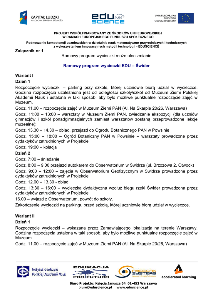 PROJEKT WSPÓŁFINANSOWANY ZE ŚRODKÓW UNII EUROPEJSKIEJ W RAMACH EUROPEJSKIEGO FUNDUSZU SPOŁECZNEGO Podnoszenie kompetencji uczniowskich w dziedzinie nauk matematyczno-przyrodniczych i technicznych z wykorzystaniem innowacyjnych metod i technologii - EDUSCIENCE Załącznik nr 1 Ramowy program wycieczki może ulec zmianie Ramowy program wycieczki EDU – Świder Wariant I Dzień 1 Rozpoczęcie wycieczki – parking przy szkole, której uczniowie biorą udział w wycieczce. Godzina rozpoczęcia uzależniona jest od odległości szkoły/szkół od Muzeum Ziemi Polskiej Akademii Nauk i ustalona w taki sposób, aby było możliwe punktualne rozpoczęcie zajęć w Muzeum. Godz. 11.00 – rozpoczęcie zajęć w Muzeum Ziemi PAN (Al. Na Skarpie 20/26, Warszawa) Godz. 11:00 – 13:00 – warsztaty w Muzeum Ziemi PAN, zwiedzanie ekspozycji (dla uczniów gimnazjów i szkół ponadgimnazjalnych zamiast warsztatów zostaną przeprowadzone lekcje muzealne); Godz. 13.30 – 14.30 – obiad, przejazd do Ogrodu Botanicznego PAN w Powsinie Godz. 15:00 – 18:00 – Ogród Botaniczny PAN w Powsinie – warsztaty prowadzone przez dydaktyków zatrudnionych w Projekcie Godz. 19:00 – kolacja Dzień 2 Godz. 7:00 – śniadanie Godz. 8:00 – 9.00 przejazd autokarem do Obserwatorium w Świdrze (ul. Brzozowa 2, Otwock) Godz. 9:00 – 12:00 – zajęcia w Obserwatorium Geofizycznym w Świdrze prowadzone przez dydaktyków zatrudnionych w Projekcie Godz. 12.00 – 13.30 - obiad Godz. 13:30 – 16:00 – wycieczka dydaktyczna wzdłuż biegu rzeki Świder prowadzona przez dydaktyków zatrudnionych w Projekcie 16.00 – wyjazd z Obserwatorium, powrót do szkoły. Zakończenie wycieczki na parkingu przed szkołą, której uczniowie biorą udział w wycieczce. Wariant II Dzień 1 Rozpoczęcie wycieczki – wskazana przez Zamawiającego lokalizacja na terenie Warszawy. Godzina rozpoczęcia ustalona w taki sposób, aby było możliwe punktualne rozpoczęcie zajęć w Muzeum. Godz. 11.00 – rozpoczęcie zajęć w Muzeum Ziemi PAN (Al. Na Skarpie 20/26, Warszawa) Biuro Projektu: Księcia Janusza 64, 01-452 Warszawa [email protected] www.eduscience.pl PROJEKT WSPÓŁFINANSOWANY ZE ŚRODKÓW UNII EUROPEJSKIEJ W RAMACH EUROPEJSKIEGO FUNDUSZU SPOŁECZNEGO Podnoszenie kompetencji uczniowskich w dziedzinie nauk matematyczno-przyrodniczych i technicznych z wykorzystaniem innowacyjnych metod i technologii - EDUSCIENCE Godz. 11:00 – 13:00 – warsztaty w Muzeum Ziemi PAN, zwiedzanie ekspozycji (dla uczniów gimnazjów i szkół ponadgimnazjalnych zamiast warsztatów zostaną przeprowadzone lekcje muzealne); Godz. 13.30 – 14.30 – obiad, przejazd do Ogrodu Botanicznego PAN w Powsinie Godz. 15:00 – 18:00 – Ogród Botaniczny PAN w Powsinie – warsztaty prowadzone przez dydaktyków zatrudnionych w Projekcie Godz. 19:00 – kolacja Dzień 2 Godz. 7:00 – śniadanie Godz. 8:00 – 9.00 przejazd autokarem do Obserwatorium w Świdrze (ul. Brzozowa 2, Otwock) Godz. 9:00 – 12:00 – zajęcia w Obserwatorium Geofizycznym w Świdrze prowadzone przez dydaktyków zatrudnionych w Projekcie Godz. 12.00 – 13.30 - obiad Godz. 13:30 – 16:00 – wycieczka dydaktyczna wzdłuż biegu rzeki Świder prowadzona przez dydaktyków zatrudnionych w Projekcie 16.00 – wyjazd z Obserwatorium, powrót do Warszawy. Zakończenie wycieczki we wskazanej przez Zamawiającego lokalizacji na terenie Warszawy. Wariant III Dzień 1 Godz. 10.45 – rozpoczęcie wycieczki przed Muzeum Ziemi Polskiej Akademii Nauk (Al. Na Skarpie 20/26, Warszawa). Godz. 11.00 – rozpoczęcie zajęć w Muzeum Ziemi PAN Godz. 11:00 – 13:00 – warsztaty w Muzeum Ziemi PAN, zwiedzanie ekspozycji (dla uczniów gimnazjów i szkół ponadgimnazjalnych zamiast warsztatów zostaną przeprowadzone lekcje muzealne); Godz. 13.30 – 14.30 – obiad, przejazd do Ogrodu Botanicznego PAN w Powsinie Godz. 15:00 – 18:00 – Ogród Botaniczny PAN w Powsinie – warsztaty prowadzone przez dydaktyków zatrudnionych w Projekcie Godz. 19:00 – kolacja Dzień 2 Godz. 7:00 – śniadanie Godz. 8:00 – 9.00 przejazd autokarem do Obserwatorium w Świdrze (ul. Brzozowa 2, Otwock) Godz. 9:00 – 12:00 – zajęcia w Obserwatorium Geofizycznym w Świdrze prowadzone przez dydaktyków zatrudnionych w Projekcie Godz. 12.00 – 13.30 - obiad Biuro Projektu: Księcia Janusza 64, 01-452 Warszawa [email protected] www.eduscience.pl PROJEKT WSPÓŁFINANSOWANY ZE ŚRODKÓW UNII EUROPEJSKIEJ W RAMACH EUROPEJSKIEGO FUNDUSZU SPOŁECZNEGO Podnoszenie kompetencji uczniowskich w dziedzinie nauk matematyczno-przyrodniczych i technicznych z wykorzystaniem innowacyjnych metod i technologii - EDUSCIENCE Godz. 13:30 – 16:00 – wycieczka dydaktyczna wzdłuż biegu rzeki Świder prowadzona przez dydaktyków zatrudnionych w Projekcie 16.00 – zakończenie wycieczki w Obserwatorium Biuro Projektu: Księcia Janusza 64, 01-452 Warszawa [email protected] www.eduscience.pl