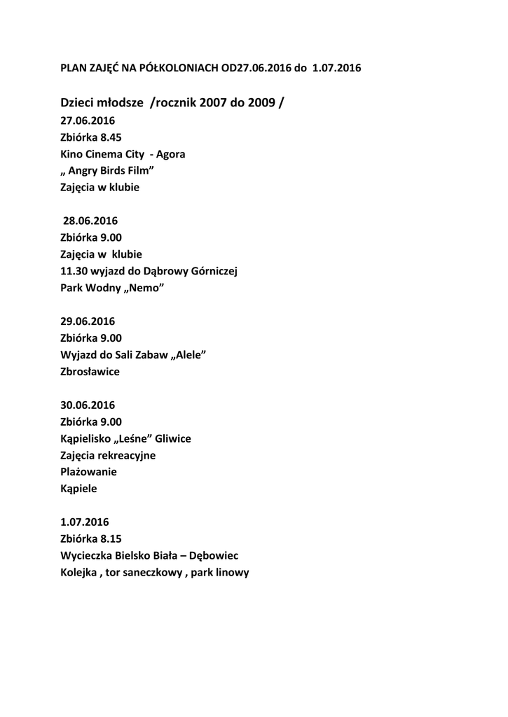 PLAN ZAJĘĆ NA PÓŁKOLONIACH OD27.06.2016 do 1.07.2016 Dzieci młodsze /rocznik 2007 do 2009 / 27.06.2016 Zbiórka 8.45 Kino Cinema City - Agora „ Angry Birds Film” Zajęcia w klubie 28.06.2016 Zbiórka 9.00 Zajęcia w klubie 11.30 wyjazd do Dąbrowy Górniczej Park Wodny „Nemo” 29.06.2016 Zbiórka 9.00 Wyjazd do Sali Zabaw „Alele” Zbrosławice 30.06.2016 Zbiórka 9.00 Kąpielisko „Leśne” Gliwice Zajęcia rekreacyjne Plażowanie Kąpiele 1.07.2016 Zbiórka 8.15 Wycieczka Bielsko Biała – Dębowiec Kolejka , tor saneczkowy , park linowy Dzieci starsze / rocznik od 2006 do 2002/ 27.06.2016 Zbiórka 9.00 Zajęcia w klubie Cinema City Agora „Warcroft:Początek” 28.06.2016 Zbiórka 8.30 Wyjazd do Parku Wodnego „Nemo” Dąbrowa Górnicza Zajęcia w Klubie 29.06.2016 Zbiórka 8.15 Wycieczka Bielsko – Biała / Dębowiec/ Kolejka , tor saneczkowy , park linowy 30.06.2016 Zbiórka 9.00 Kąpielisko „Leśne” w Gliwicach Plażowanie , kąpiele, zajęcia sportowe 1.07.2016 Zbiórka 9.00 Zajęcia w klubie Laser , Kręgle , Labirynt – Agora Bytom Zajęcia w Klubie