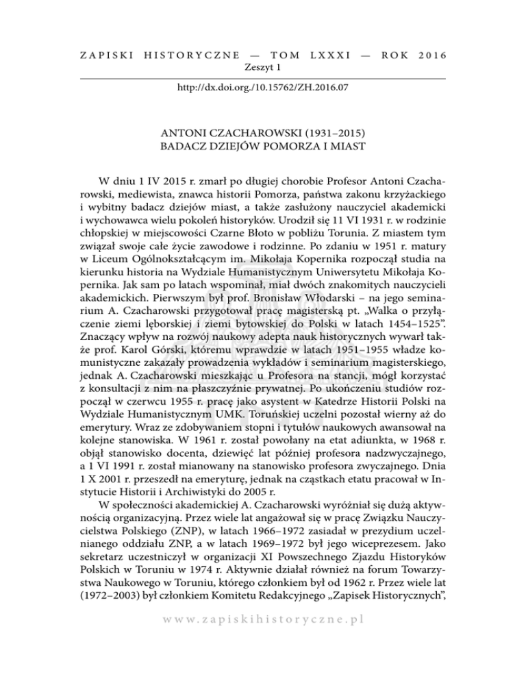 ZAPISKI HISTORYCZNE — TOM LXXXI — ROK 2016 Zeszyt 1 http://dx.doi.org./10.15762/ZH.2016.07 ANTONI CZACHAROWSKI (1931–2015) BADACZ DZIEJÓW POMORZA I MIAST W dniu 1 IV 2015 r. zmarł po długiej chorobie Profesor Antoni Czacharowski, mediewista, znawca historii Pomorza, państwa zakonu krzyżackiego i wybitny badacz dziejów miast, a także zasłużony nauczyciel akademicki i wychowawca wielu pokoleń historyków. Urodził się 11 VI 1931 r. w rodzinie chłopskiej w miejscowości Czarne Błoto w pobliżu Torunia. Z miastem tym związał swoje całe życie zawodowe i rodzinne. Po zdaniu w 1951 r. matury w Liceum Ogólnokształcącym im. Mikołaja Kopernika rozpoczął studia na kierunku historia na Wydziale Humanistycznym Uniwersytetu Mikołaja Kopernika. Jak sam po latach wspominał, miał dwóch znakomitych nauczycieli akademickich. Pierwszym był prof. Bronisław Włodarski – na jego seminarium A. Czacharowski przygotował pracę magisterską pt. „Walka o przyłączenie ziemi lęborskiej i ziemi bytowskiej do Polski w latach 1454–1525”. Znaczący wpływ na rozwój naukowy adepta nauk historycznych wywarł także prof. Karol Górski, któremu wprawdzie w latach 1951–1955 władze komunistyczne zakazały prowadzenia wykładów i seminarium magisterskiego, jednak A. Czacharowski mieszkając u Profesora na stancji, mógł korzystać z konsultacji z nim na płaszczyźnie prywatnej. Po ukończeniu studiów rozpoczął w czerwcu 1955 r. pracę jako asystent w Katedrze Historii Polski na Wydziale Humanistycznym UMK. Toruńskiej uczelni pozostał wierny aż do emerytury. Wraz ze zdobywaniem stopni i tytułów naukowych awansował na kolejne stanowiska. W 1961 r. został powołany na etat adiunkta, w 1968 r. objął stanowisko docenta, dziewięć lat później profesora nadzwyczajnego, a 1 VI 1991 r. został mianowany na stanowisko profesora zwyczajnego. Dnia 1 X 2001 r. przeszedł na emeryturę, jednak na cząstkach etatu pracował w Instytucie Historii i Archiwistyki do 2005 r. W społeczności akademickiej A. Czacharowski wyróżniał się dużą aktywnością organizacyjną. Przez wiele lat angażował się w pracę Związku Nauczycielstwa Polskiego (ZNP), w latach 1966–1972 zasiadał w prezydium uczelnianego oddziału ZNP, a w latach 1969–1972 był jego wiceprezesem. Jako sekretarz uczestniczył w organizacji XI Powszechnego Zjazdu Historyków Polskich w Toruniu w 1974 r. Aktywnie działał również na forum Towarzystwa Naukowego w Toruniu, którego członkiem był od 1962 r. Przez wiele lat (1972–2003) był członkiem Komitetu Redakcyjnego „Zapisek Historycznych”, w w w. z a p i s k i h i s t o r y c z n e . p l 168 Roman Czaja [168] a w latach 1975–1979 pełnił obowiązki zastępcy redaktora. Zasiadał także w redakcji „Acta Poloniae Historica” w latach 1973–1989. Ponadto powierzano mu odpowiedzialne funkcji w administracji uniwersyteckiej. W latach 1973–1975 był prodziekanem, a od 1978 do 1981 r. dziekanem Wydziału Humanistycznego. W latach 1982–1984 pełnił obowiązki prorektora UMK. Od 1980 r. do przejścia na emeryturę kierował Zakładem Historii Średniowiecza w Instytucie Historii i Archiwistyki. Zainteresowania naukowe A. Czacharowskiego koncentrowały się początkowo wokół historii Pomorza i państwa zakonu krzyżackiego w Prusach. Badanie tej problematyki ułatwiała mu znakomita znajomość języków źródeł, łaciny i niemieckiego. Jego debiutem naukowym był artykuł polemiczny do książki Wojciecha Kostusia o ziemi lęborskiej i bytowskiej. Wykorzystując wyniki badań prowadzonych w ramach pracy magisterskiej, wskazał na liczne błędne interpretacje oraz poważne braki dokumentacji źródłowej w recenzowanej pracy. Bardzo dobre przygotowanie warsztatowe umożliwiło A. Czacharowskiemu szybki awans naukowy. Doktorat obronił pięć lat po zakończeniu studiów. Dysertacja napisana pod kierunkiem prof. B. Włodarskiego pt. Uposażenie i organizacja klasztoru norbertanek w Żukowie od XIII do połowy XV wieku, wydana drukiem w 1963 r., wnosi znaczący wkład do poznania dziejów wielkiej własności feudalnej na Pomorzu Gdańskim. Tematykę klasztorną podjął A. Czacharowski raz jeszcze w latach siedemdziesiątych XX w., gdy wspólnie z zespołem archeologów kierowanym przez Jadwigę Chudziakową prowadził badania nad klasztorem benedyktynów w Mogilnie. Po doktoracie swoje zainteresowania naukowe skoncentrował na rozprawie habilitacyjnej poświęconej Nowej Marchii oraz na projekcie edytorskim Księga żołdu Związku Pruskiego z okresu wojny trzynastoletniej. Jak pisał, warsztat edytorski, który umożliwił przygotowanie mu tego dzieła, zawdzięczał przede wszystkim współpracy z prof. Karolem Górskim. Wybór tematu rozprawy habilitacyjnej wiązał się z poszerzeniem zakresu terytorialnego zainteresowań naukowych i wkroczeniem na pole badawcze, na którym historiografia polska nie była wcześniej obecna. Rozprawa A. Czacharowskiego stała się dziełem Ryszard Kozłowski, Historycy na Wydziale Humanistycznym i Wydziale Nauk Historycznych UMK w latach 1945–2005, [in:] Instytut Historii i Archiwistyki Uniwersytetu Mikołaja Kopernika (1945–2005). Wybrane problemy, red. Jan Sziling, Toruń 2006, s. 156; Krzysztof Kopiński, Profesor Antoni Czacharowski (1931–2015), historyk, wybitny dydaktyk, prorektor UMK, Rocznik Toruński, [t.] 42: 2015, s. 300 n. Antoni Czacharowski, Spór o ziemie lęborską i bytowską w latach 1455–1526 (na marginesie pracy W. Kostusia: Władztwo Polski nad Lęborkiem i Bytowem), Roczniki Historyczne, R. 21: 1956, s. 304–313. Księga żołdu Związku Pruskiego z okresu wojny trzynastoletniej, wyd. Antoni Czacharowski (Fontes TNT, 61), Toruń 1969, s. XIII. Antoni Czacharowski, Społeczne i polityczne siły w walce o Nową Marchię w latach w w w. z a p i s k i h i s t o r y c z n e . p l [169] Antoni Czacharowski (1931–2015) badacz dziejów Pomorza i miast 169 prekursorskim, ta