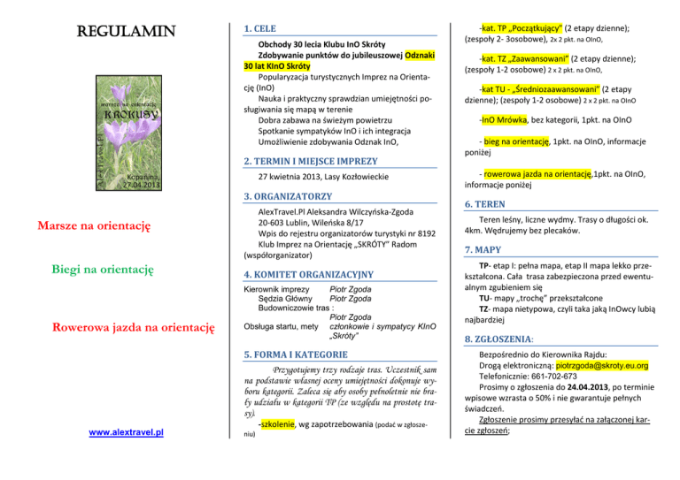 Regulamin 1. CELE Obchody 30 lecia Klubu InO Skróty Zdobywanie punktów do jubileuszowej Odznaki 30 lat KInO Skróty Popularyzacja turystycznych Imprez na Orientację (InO) Nauka i praktyczny sprawdzian umiejętności posługiwania się mapą w terenie Dobra zabawa na świeżym powietrzu Spotkanie sympatyków InO i ich integracja Umożliwienie zdobywania Odznak InO, 2. TERMIN I MIEJSCE IMPREZY 27 kwietnia 2013, Lasy Kozłowieckie 3. ORGANIZATORZY Marsze na orientację Biegi na orientację Rowerowa jazda na orientację AlexTravel.Pl Aleksandra Wilczyńska-Zgoda 20-603 Lublin, Wileńska 8/17 Wpis do rejestru organizatorów turystyki nr 8192 Klub Imprez na Orientację „SKRÓTY” Radom (współorganizator) 4. KOMITET ORGANIZACYJNY Kierownik imprezy Piotr Zgoda Sędzia Główny Piotr Zgoda Budowniczowie tras : Piotr Zgoda Obsługa startu, mety członkowie i sympatycy KInO „Skróty” 5. FORMA I KATEGORIE Przygotujemy trzy rodzaje tras. Uczestnik sam na podstawie własnej oceny umiejętności dokonuje wyboru kategorii. Zaleca się aby osoby pełnoletnie nie brały udziału w kategorii TP (ze względu na prostotę trasy). www.alextravel.pl -szkolenie, wg zapotrzebowania (podać w zgłoszeniu) -kat. TP „Początkujący” (2 etapy dzienne); (zespoły 2- 3osobowe), 2x 2 pkt. na OInO, -kat. TZ „Zaawansowani” (2 etapy dzienne); (zespoły 1-2 osobowe) 2 x 2 pkt. na OInO, -kat TU - „Średniozaawansowani” (2 etapy dzienne); (zespoły 1-2 osobowe) 2 x 2 pkt. na OInO -InO Mrówka, bez kategorii, 1pkt. na OInO - bieg na orientację, 1pkt. na OInO, informacje poniżej - rowerowa jazda na orientację,1pkt. na OInO, informacje poniżej 6. TEREN Teren leśny, liczne wydmy. Trasy o długości ok. 4km. Wędrujemy bez plecaków. 7. MAPY TP- etap I: pełna mapa, etap II mapa lekko przekształcona. Cała trasa zabezpieczona przed ewentualnym zgubieniem się TU- mapy „trochę” przekształcone TZ- mapa nietypowa, czyli taka jaką InOwcy lubią najbardziej 8. ZGŁOSZENIA: Bezpośrednio do Kierownika Rajdu: Drogą elektroniczną: [email protected] Telefonicznie: 661-702-673 Prosimy o zgłoszenia do 24.04.2013, po terminie wpisowe wzrasta o 50% i nie gwarantuje pełnych świadczeń. Zgłoszenie prosimy przesyłać na załączonej karcie zgłoszeń; 9. OPŁATA NA RZECZ REALIZACJI IMPREZY 10 zł od uczestnika. Oddzielna opłata za udział w marszach na orientację i rowerowej jeździe na orientację (pierwsza trasa, kolejne 5zł).. 5 zł od uczestnika za udział w jednej trasie biegu na orientację. Uczestnicy 2x2 zwolnieni z opłaty za start w jednej trasie bno. Po zgłoszeniu wpisowe należy wpłacić na wskazane konto. 10.ŚWIADCZENIA Dyplomy dla trzech najlepszych drużyn w każdej kategorii, wręczone na kolejnej InO. Okolicznościowa naklejka Komplet map dla każdego uczestnika Kiełbaska do ogniska Potwierdzenie punktów do OInO, OTP oraz KOT Weryfikacja OInO (do małej złotej włącznie, oraz 30 lat KInO Skróty) Protokół z zawodów dla zespołów (wersja PDF), należy podać adres e-mail. 11. POSTANOWIENIA KOŃCOWE Każdy zespół powinien posiadać: kompas oraz przybory do pisania i kreślenia Zgłaszający jest zobowiązany ubezpieczyć uczestników Impreza odbędzie się bez względu na pogodę; Za szkody wynikłe wobec uczestników jak i osób trzecich organizator nie odpowiada; Zgłoszenie po terminie nie gwarantuje pełnych świadczeń; Osoby zgłoszone, ale nieobecne na imprezie tracą prawo do świadczeń i zwrotu wpisowego; Na imprezie obowiązuje punktacja Komisji InO ZG PTTK; Osoby niepełnoletnie mogą uczestniczyć pod opieką dorosłego Opiekuna; Obowiązkiem uczestnika jest przestrzeganie zasad Karty Turysty, Kodeksu Drogowego oraz Fair Play. Ostateczna interpretacja niniejszego regulaminu należy do Organizatorów. Rajd odbędzie się przy zgłoszeniu minimum 35 osób. 12. PROGRAM IMPREZY Sobota 27 kwietnia 2013 09.30 szkolenie dla chętnych 10.30 rozpoczęcie imprezy 10.45 start etapu I wszystkich kategorii 12.45 start etapu II wszystkich kategorii 13.30 start rowerowej jazdy na orientację 14.30 start biegu na orientację 16.00 zakończenie zawodów 13. BAZA IMPREZY Baza to parking leśny ok. 1km na wschód od leśniczówki Kopanina Dojazd komunikacją publiczną jest bardzo dobry, najbliższy przystanek to Kopanina na trasie Lublin-Lubartów (ok. 1,5km od bazy) W pobliżu jest również stacja PKP Wandzin.. Położenie bazy pokazuje schematyczna mapka 15 BIEG NA ORIENTACJĘ W celu pokazania innej formy orientacji postanowiliśmy przygotować trasy biegu na orientację. W odróżnieniu od marszy, w bno o rezultacie uczestnika decyduje czas pokonania trasy. Spora różnica to mapa, posiada ona uniwersalny zespół symboli. Przygotujemy odpowiednią legendę. Zasady podobne do opisanych w 16 punkcie regulaminu. Forma: klasyczne, dzienne, indywidualne bno. Przygotujemy cztery trasy Trasa A- ok. 1km Trasa B- ok. 3 km Trasa C- ok. 6 km scorelauf Kategorie Poniższe kategorie wynikają z płci (K/M) oraz wieku uczestnika, 1. K/M 13- dla uczniów szkół podstawowych 2. K/M 18- dla osób, które nie ukończyły 18 roku życia 3. K/M 35- dla osób, które nie ukończyły 35 roku życia 4. Open dla pozostałych uczestników. Przy dużej ilości zgłoszeń wprowadzimy większą ilość kategorii wiekowych (należy podać w zgłoszeniu), zostaną one wykazane w komunikacie startowym Mapa: specjalna mapa do BnO (opracowanie kwiecień 2013). 16. ROWEROWA JAZDA NA ORIENTACJĘ Należy posiadać rower Zasady są proste. Chodzi o odnalezienie w wyznaczonej kolejności wszystkich punktów kontrolnych, zaznaczonych na mapie i ustawionych w terenie. Mapę otrzymuje się minutę przed startem. Wygrywa ten, kto ukończy zawody w najkrótszym czasie odnajdując wszystkie punkty kontrolne. O zwycięstwie w zawodach w RJnO decydują nie tylko silne nogi i znakomity balans na siodełku, ale również umiejętność precyzyjnej i szybkiej nawigacji. Największą przyjemnością i zaletą tej dyscyp