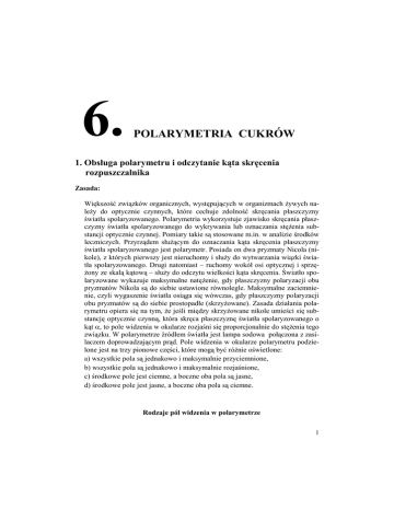 6. POLARYMETRIA CUKRÓW 1. Obsługa polarymetru i odczytanie kąta skręcenia rozpuszczalnika Zasada: Większość związków organicznych, występujących w organizmach Ŝywych naleŜy do optycznie czynnych, które cechuje zdolność skręcania płaszczyzny światła spolaryzowanego. Polarymetria wykorzystuje zjawisko skręcania płaszczyzny światła spolaryzowanego do wykrywania lub oznaczania stęŜenia substancji optycznie czynnej. Pomiary takie są stosowane m.in. w analizie środków leczniczych. Przyrządem słuŜącym do oznaczania kąta skręcenia płaszczyzny światła spolaryzowanego jest polarymetr. Posiada on dwa pryzmaty Nicola (nikole), z których pierwszy jest nieruchomy i słuŜy do wytwarzania wiązki światła spolaryzowanego. Drugi natomiast – ruchomy wokół osi optycznej i sprzęŜony ze skalą kątową – słuŜy do odczytu wielkości kąta skręcenia. Światło spolaryzowane wykazuje maksymalne natęŜenie, gdy płaszczyzny polaryzacji obu pryzmatów Nikola są do siebie ustawione równolegle. Maksymalne zaciemnienie, czyli wygaszenie światła osiąga się wówczas, gdy płaszczyzny polaryzacji obu pryzmatów są do siebie prostopadłe (skrzyŜowane). Zasada działania polarymetru opiera się na tym, Ŝe jeśli między skrzyŜowane nikole umieści się substancję optycznie czynną, która skręca płaszczyznę światła spolaryzowanego o kąt α, to pole widzenia w okularze rozjaśni się proporcjonalnie do stęŜenia tego związku. W polarymetrze źródłem światła jest lampa sodowa połączona z zasilaczem doprowadzającym prąd. Pole widzenia w okularze polarymetru podzielone jest na trzy pionowe części, które mogą być róŜnie oświetlone: a) wszystkie pola są jednakowo i maksymalnie przyciemnione, b) wszystkie pola są jednakowo i maksymalnie rozjaśnione, c) środkowe pole jest ciemne, a boczne oba pola są jasne, d) środkowe pole jest jasne, a boczne oba pola są ciemne. Rodzaje pól widzenia w polarymetrze 1 a lewoskrętna substancja b wygaszenie całkowite c prawoskrętna substancja Polarymetr jest standardowo tak wyregulowany, Ŝe jeśli w rurce polarymetrycznej nie ma substancji optycznie czynnej i jeśli zerowa kreska podziałki kątowej pokrywa się z zerową kreską podziałki noniusza, wówczas wszystkie części pola widzenia w okularze są jednolicie szaro oświetlone (wygaszone), tak jak w pozycji „b” na rysunku. Wykonanie: • Zasilacz włączyć na 15 min przed pomiarem. • Przygotowanie polarymetru do pomiaru polega na takim ustawieniu pola widzenia (obracając pokrętłem analizator), które będzie jednakowo i maksymalnie przyciemnione. W takim połoŜeniu tarcza z podziałką kątową wskazuje zero. • Przygotować rurkę polarymetryczną: wymyć, przepłukać wodą destylowaną i osuszyć. • Porcelanowa rurka polarymetryczna na obu końcach jest nagwintowana, a brzegi są gładko zeszlifowane, dzięki czemu moŜna je zamknąć płaskimi krąŜkami szklanymi, dociskając specjalnymi nakrętkami z otworem pośrodku. Uwaga! Między szklanym krąŜkiem a nakrętką umieszcza się miękką podkładkę, aby nie uszkodzić szklanego krąŜka przy dokręcaniu nakrętki. • Przed napełnieniem rurki zamknąć jeden jej koniec, sprawdzić szczelność wodą destylowaną i ustawić pionowo. • Rurkę polarymetru napełnić rozpuszczalnikiem, wodą, wlewając jej na tyle, aby nad otworem utworzył się wyraźnie wypukły menisk. Szklany krąŜek trzymany poziomo oprzeć samym brzegiem o brzeg rurki i szybkim ruchem nasunąć na otwór. • Sprawdzić, czy nie ma bańki powietrza, jeśli jest, naleŜy zdjąć szklany krąŜek i powtórzyć staranniej wszystkie czynności, wcześniej dolewając rozpuszczalnika do wyraźnego wypukłego menisku. • Jeśli pod krąŜkiem brak bańki powietrza, rurkę moŜna zamknąć; na krąŜek połoŜyć podkładkę, po czym docisnąć nakrętką. 2 • Osuszyć starannie bibułą zewnętrzne powierzchnie szklanych krąŜków w otworach nakrętek. • Napełnioną rurkę starannie osuszyć przed włoŜeniem do przygotowanego polarymetru ze skrzyŜowanymi nikolami. Sprawdzić, czy nastąpiła zmiana w obrazie widzianym w okularze. Jeśli rozpuszczalnik zmienił obraz w okularze, naleŜy pokrętłem obrócić analizator na tyle, aby przywrócić wyjściowe pole widzenie, czyli jednakowo i maksymalnie przyciemnione. • Kąt, o który naleŜało obrócić analizator, odczytać ze skali: górnej wskazującej całe stopnie i dolnej, czyli noniusza, z ułamkami stopni. • Kąt skręcenia α odczytać 5-krotnie. Obliczyć średni kąt skręcenia α. • W celu opróŜnienia rurki po pomiarze wystarczy odkręcić tylko jedną nakrętkę, wylać rozpuszczalnik i rurka jest gotowa do następnego ćwiczenia. 2. Wyznaczanie skręcalności właściwej; identyfikacja cukrów Zasada: Wartością charakteryzującą dany związek optycznie czynny jest skręcalność α 20 D = α c ( g / m l ) ⋅ l( d m ) właściwa: gdzie: [α]D20 – skręcalność właściwa rozpuszczonej substancji wyraŜona w stopniach, indeks górny 20 oznacza temperaturę pomiaru; indeks dolny D oznacza światło monochromatyczne, linia D lampy sodowej (589,3 nm); α – zmierzony kąt skręcenia płaszczyzny światła spolaryzowanego wyraŜony w stopniach; c – stęŜenie roztworu wyraŜone w g/ml; l – grubość warstwy roztworu, wyraŜona w dm, przez którą przechodzi światło spolaryzowane. Znając stęŜenie cukru w roztworze oraz wartość kąta skręcenia α płaszczyzny światła spolaryzowanego, moŜna obliczyć skręcalność właściwą, na podstawie której identyfikuje się nieznany cukier. Wykonanie: 3 • Postępując zgodnie z instrukcją zawartą w ćwiczeniu 1 – napełnić rurkę polarymetru badanym roztworem nieznanego cukru o stęŜeniu 10% (w/v). • Napełnioną rurkę umieścić w polarymetrze. • Odczytać 5-krotnie kąt skręcenia α analizowanego roztworu. • Obliczyć średni kąt skręcenia α. • Ob