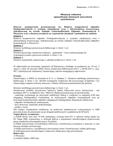 Radomsko, 11.03.2015 r. Wszyscy nabywcy specyfikacji istotnych warunków zamówienia Dotyczy: postępowania przetargowego na: Budowę kompostowni odpadów biodegradowalnych w systemie zamkniętym wraz z infrastrukturą towarzyszącą, zlokalizowaną na terenie Zakładu Unieszkodliwiania Odpadów Komunalnych w Ploszowie wraz z dostawą urządzeń na wyposażenie instalacji z podziałem na zadania: Zadanie 1 Budowa kompostowni odpadów biodegradowalnych w systemie zamkniętym wraz z infrastrukturą towarzyszącą, zlokalizowaną na terenie Zakładu Unieszkodliwiania Odpadów Komunalnych w Płoszowie. Zadanie 2 Dostawa mobilnego przesiewacza bębnowego w ilości 1 szt. Zadanie 3 Dostawa przyczepy ciężarowej rolniczej – pojemnika - wozu asenizacyjnego do wypompowywania i przewozu ścieków w ilości 1 szt. Zadanie 4 Dostawa samochodu ciężarowego z zabudową hakową w ilości 1 szt. W odpowiedzi na otrzymane zapytanie od Wykonawcy działając na podstawie art. 38 ust. 2 ustawy z dnia 29 stycznia 2004r. Prawo Zamówień Publicznych (Dz.U. z 09.08.2013 r., poz. 907 z późniejszymi zmianami), Zamawiający udziela następującej odpowiedzi: Pytanie: Zamawiający w SIWZ na stronach nr 8-11, w Zadaniu 2 - Dostawa mobilnego przesiewacza bębnowego w ilości 1 szt. określił wymagania techniczne dla powyższego urządzenia. Czy Zamawiający dopuści dostawę maszyny o bardzo zbliżonych parametrach jak poniżej: Dostawa mobilnego przesiewacza bębnowego w ilości 1 szt. Dostarczony mobilny przesiewacz bębnowy będzie fabrycznie nowy, nieużywany - rok produkcji 2015 o wydajności min. 100m3/h. Będzie przeznaczony do przesiewania: - materiału uzyskanego po procesach stabilizacji frakcji o wielkości co najmniej 0-80 mm ulegającej biodegradacji wydzielonej ze zmieszanych odpadów komunalnych oraz po procesach kompostowania odpadów ulegających biodegradacji zbieranych selektywnie, - odpadów komunalnych zmieszanych, - kory drzewnej, materiału strukturalnego, - piasku i żwiru. Sito będące urządzeniem mobilnym, na podwoziu tandemowym wyposażonym w ABS przystosowane do poruszania się po drogach publicznych z prędkością do 80 km/h. Napęd główny urządzenia: 1) Silnik diesel, moc min. 55 kW, spełniający wymogi norm EU w zakresie emisji spalin wg EU Stage IIIB, wyposażony w zbiornik paliwa o pojemności umożliwiającej nieprzerwaną pracę urządzenia przynajmniej przez 30 godzin. 2) Silnik umieszczony na konstrukcji obrotowej z możliwością wysunięcia z maszyny w celu łatwego dostępu serwisowego. 3) Pulpit sterowniczy z kompletnym sterowaniem sitem i kontrolą pracy silnika głównego. 4) Zabezpieczenie umożliwiające wyłączenie silnika przy jego przeciążeniu. Bęben sita: 1) Wymiary: a) średnica bębna 1800 mm, b) długość bębna 4700 mm, c) efektywna powierzchnia sita powyżej 22 m2. 2) Sito bębnowe ułożone na rolkach gumowych pokrytych powłoką trudnościeralną. 3) Czyszczenie powierzchni sita przy pomocy specjalnej szczotki walcowej o dużej średnicy 650 mm. 4) Szczotka oczyszczana przy pomocy zbieraka. 5) Szczotka czyszcząca bęben umieszczona po prawej stronie przesiewacza (będąc zwróconym w kierunku jazdy). 6) Prędkość obrotów bębna regulowana bezstopniowo. 7) Bęben sitowy o oczkach w kształcie kwadratu wielkości oczka 20 x 20 mm i grubości ścianki 8 mm. 8) Bęben wyposażony w lemiesze prowadzące umieszczone wewnątrz bębna zapewniające łatwe prowadzenie materiału. 9) Przy przeciążeniu bębna sita automatyczne wstrzymanie dalszego podawania i automatyczne uruchomienie podawania po wystąpieniu normalnego obciążenia. 10) Bęben w trakcie wymiany lub konserwacji wyjmowany przy pomocy np. ładowarki, bez potrzeby ściągania łańcucha czy jakiejkolwiek ręcznej ingerencji operatora w układ przeniesienia napędu. Napęd bębna przesiewającego: 1) Napęd przenoszony z silnika hydraulicznego poprzez zębatkę napędową bezpośrednio na bęben przesiewający, zapewniający faktycznie bezpoślizgową i cichą pracę bębna. Podwozie: 1) Przystosowane do holowania przy pomocy ciągnika lub samochodu po drogach publicznych ( posiadające dopuszczenie do ruchu ). 2) Wykonane jako przyczepa na osi tandemowej. 3) Wyposażone w układ hamulcowy z systemem ABS. 4) Wyposażone w specjalny uchwyt zakładany na sprzęg sita bębnowego, umieszczony na końcu dyszla pociągowego, dla jego przesuwania przy pomocy ładowarki na placu kompostowym. 5) Maszyna wyposażona w mechanicznie opuszczane podpory przednie i hydraulicznie opuszczaną podporę tylną (3 szt.). Zasobnik: 1) Pojemność zasobnika 5,0 m3. 2) Wysokość zasypowa 2 790 mm. 3) Na dnie zasobnika ułożony przenośnik odbierający. 4) Przenośnik ułożony w pojemniku załadowczym wyposażony w automatyczne, mechaniczne utrzymanie równoległego prowadzenia taśmy w jego wzdłużnej osi. Przenośnik odbierający frakcję podsitową: 1) Przenośnik z taśmą gumową, profilowaną, hydraulicznie składany i rozkładany. 2) Bezstopniowe, hydrauliczne ustawienie nachylenia przenośnika. 3) Długość całkowita 5 600 mm. 4) Szerokość 800 mm. 5) Taśma ze zbierakami. 6) Wysokość zrzutu regulowana bezstopniowo 3 355 mm. Przenośnik odbierający frakcję nadsitową: 1) Przenośnik z taśmą gumową, hydraulicznie składany i rozkładany. 2) Bezstopniowe, hydrauliczne ustawienie nachylenia przenośnika. 3) Długość całkowita 5 500 mm. 4) Szerokość 800. 5) Taśma ze zbierakami. 6) Wysokość zrzutu regulowana bezstopniowo 3 450 mm Dodatkowe wymagania: 1) Masa urządzenia gotowego do pracy max. 16 000 kg. 2) Taśmy wszystkich przenośników kwasoodporne. 3) Automatyczny system centralnego smarowania punktów smarnych. 4) Licznik motogodzin. 5) Urządzenie wyposażone w pokrywy i osłony boczne wykonane z blach tłoczonych. 6) Sterowanie maszyną za pomocą pulpitu sterowniczego z wyświetlaczem. Dokumenty i świadectwa (w języku polskim ) przekazywane wraz z urządzeniem: 1) świadec