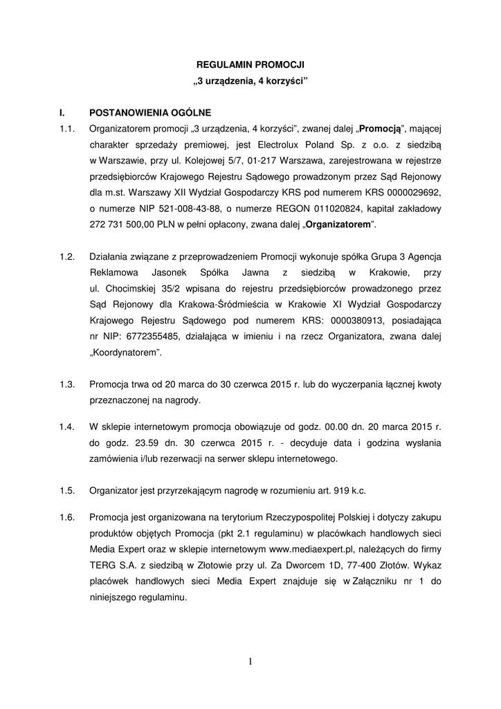 REGULAMIN PROMOCJI „3 urządzenia, 4 korzyści” I. POSTANOWIENIA OGÓLNE 1.1. Organizatorem promocji „3 urządzenia, 4 korzyści”, zwanej dalej „Promocją”, mającej charakter sprzedaży premiowej, jest Electrolux Poland Sp. z o.o. z siedzibą w Warszawie, przy ul. Kolejowej 5/7, 01-217 Warszawa, zarejestrowana w rejestrze przedsiębiorców Krajowego Rejestru Sądowego prowadzonym przez Sąd Rejonowy dla m.st. Warszawy XII Wydział Gospodarczy KRS pod numerem KRS 0000029692, o numerze NIP 521-008-43-88, o numerze REGON 011020824, kapitał zakładowy 272 731 500,00 PLN w pełni opłacony, zwana dalej „Organizatorem”. 1.2. Działania związane z przeprowadzeniem Promocji wykonuje spółka Grupa 3 Agencja Reklamowa Jasonek Spółka Jawna z siedzibą w Krakowie, przy ul. Chocimskiej 35/2 wpisana do rejestru przedsiębiorców prowadzonego przez Sąd Rejonowy dla Krakowa-Śródmieścia w Krakowie XI Wydział Gospodarczy Krajowego Rejestru Sądowego pod numerem KRS: 0000380913, posiadająca nr NIP: 6772355485, działająca w imieniu i na rzecz Organizatora, zwana dalej „Koordynatorem”. 1.3. Promocja trwa od 20 marca do 30 czerwca 2015 r. lub do wyczerpania łącznej kwoty przeznaczonej na nagrody. 1.4. W sklepie internetowym promocja obowiązuje od godz. 00.00 dn. 20 marca 2015 r. do godz. 23.59 dn. 30 czerwca 2015 r. - decyduje data i godzina wysłania zamówienia i/lub rezerwacji na serwer sklepu internetowego. 1.5. Organizator jest przyrzekającym nagrodę w rozumieniu art. 919 k.c. 1.6. Promocja jest organizowana na terytorium Rzeczypospolitej Polskiej i dotyczy zakupu produktów objętych Promocja (pkt 2.1 regulaminu) w placówkach handlowych sieci Media Expert oraz w sklepie internetowym www.mediaexpert.pl, należących do firmy TERG S.A. z siedzibą w Złotowie przy ul. Za Dworcem 1D, 77-400 Złotów. Wykaz placówek handlowych sieci Media Expert znajduje się w Załączniku nr 1 do niniejszego regulaminu. 1 1.7. Zgłoszenie udziału w Promocji formularza zgłoszeniowego następuje znajdującego on-line za na stronie się pośrednictwem internetowej www.electrolux.pl/promocje. 1.8. Celem Promocji jest promocja wskazanych w punkcie 2.1. niniejszego regulaminu produktów, których producentem lub dystrybutorem jest Organizator (zwanych dalej „Produktami”), służąca zwiększeniu ich sprzedaży. 1.9. Promocja nie łączy się z żadnymi innymi promocjami, dotyczącymi Produktów wskazanych w punkcie 2.1. niniejszego regulaminu, organizowanymi przez Electrolux Poland Sp. z o.o. w czasie jej trwania. II. WARUNKI UCZESTNICTWA W PROMOCJI I ZGŁOSZENIE UDZIAŁU W PROMOCJI 2.1. Promocją objęte są wszystkie poniższe rodzaje urządzeń marki Electrolux do zabudowy: 1) piekarniki do zabudowy; 2) płyty do zabudowy; 3) zmywarki do zabudowy. 2.2. Promocja jest przeznaczona wyłącznie dla osób fizycznych, które spełniają wszystkie poniższe warunki: a) ukończyły 18. rok życia; b) posiadają miejsce zamieszkania na terytorium Rzeczypospolitej Polskiej; c) posiadają pełną zdolność do czynności prawnych; d) kupują Produkty jako konsumenci w rozumieniu art. 221 kodeksu cywilnego (ustawa z dn. 16 kwietnia 1964 r. Kodeks cywilny, tekst jedn. Dz.U. z 2014 r. poz. 121 z późn. zm.). W Promocji mogą zatem uczestniczyć osoby fizyczne będące przedsiębiorcami, jeżeli zakup Produktów nie ma bezpośredniego związku z prowadzoną przez nich działalnością gospodarczą lub zawodową; e) w okresie od 20 marca do 14 lipca 2015 r. dokonają zgłoszenia do Promocji trzech różnego rodzaju Produktów zakupionych przez siebie w czasie trwania Promocji tj. od 20 marca do 30 czerwca 2015 r., na stronie internetowej www.electrolux.pl/promocje wypełniając dostępny na tej stronie formularz rejestracyjny i podając następujące dane: imię, nazwisko, adres zamieszkania lub adres do korespondencji (miejscowość, ulica, numer domu lub lokalu, kod 2 pocztowy), numer telefonu kontaktowego, adres e-mail, numery dowodów zakupu (paragonów lub faktur), jak również modele zakupionych urządzeń, ich ceny brutto oraz ich numery seryjne. W ramach rejestracji konieczne jest przesłanie skanów dowodów zakupu Produktów (paragonu fiskalnego lub faktury) oraz skanów kart gwarancyjnych zawierającego ich unikatowe numery i dane urządzeń. Do ukończenia rejestracji niezbędne jest podanie wszystkich powyższych danych, przesłanie skanów paragonów/faktur oraz skanów kart gwarancyjnych, dotyczących wszystkich trzech zgłaszanych Produktów. Z momentem zatwierdzenia formularza rejestracyjnego, osoba spełniająca wszystkie warunki, o których mowa w niniejszym punkcie 2.2., staje się uczestnikiem Promocji (dalej jako: „Uczestnik”). 2.3. Zgłoszeniem w ramach Promocji mogą zostać objęte tylko trzy Produkty rożnego rodzaju tj. należące do trzech różnych kategorii wymienionych w poszczególnych podpunktach w pkt. 2.1. powyżej, zgłoszenie nie może natomiast dotyczyć np. trzech Produktów z kategorii z ppkt. 3) pkt. 2.1. (tj. trzech zmywarek do zabudowy) lub dwóch Produktów z ppkt. 1) pkt. 2.1. i jednego z ppkt. 2 pkt. 2.1. (czyli np. dwóch piekarników do zabudowy i jednej płyty do zabudowy). 2.4. W Promocji dana osoba może wziąć udział tylko jeden raz. Zakup zgłaszanych w ramach Promocji Produktów nie musi być jednoczesny (nie muszą być objęte tym samym dowodem zakupu). 2.5. W Promocji nie mogą uczestniczyć właściciele (współwłaściciele), wspólnicy, lub osoby zatrudnione w jakiejkolwiek formie prawnej (na podstawie umowy o pracę, umowy zlecenia etc.) w punktach sprzedaży detalicznej lub hurtowej, prowadzących sprzedaż Produktów Organizatora oraz członkowie ich rodzin. 2.6. Przez członków rodziny, o których mowa w punkcie 2.3., rozumie się: wstępnych, zstępnych, rodzeństwo, małżonków, małżonków rodzeństwa, rodziców małżonków, kuzynów i osoby pozostające w stosunku przysposobienia. 2.7. Udział w Promocji i podanie 