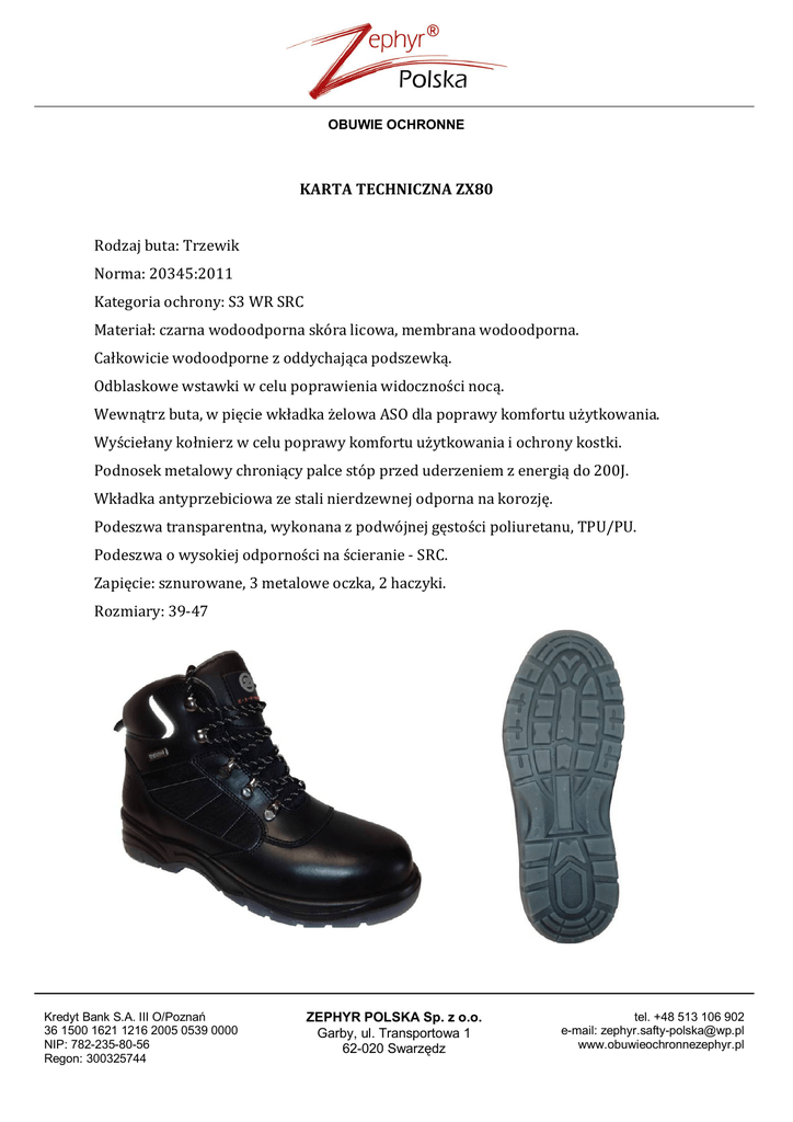 OBUWIE OCHRONNE KARTA TECHNICZNA ZX80 Rodzaj buta: Trzewik Norma: 20345:2011 Kategoria ochrony: S3 WR SRC Materiał: czarna wodoodporna skóra licowa, membrana wodoodporna. Całkowicie wodoodporne z oddychająca podszewką. Odblaskowe wstawki w celu poprawienia widoczności nocą. Wewnątrz buta, w pięcie wkładka żelowa ASO dla poprawy komfortu użytkowania. Wyściełany kołnierz w celu poprawy komfortu użytkowania i ochrony kostki. Podnosek metalowy chroniący palce stóp przed uderzeniem z energią do 200J. Wkładka antyprzebiciowa ze stali nierdzewnej odporna na korozję. Podeszwa transparentna, wykonana z podwójnej gęstości poliuretanu, TPU/PU. Podeszwa o wysokiej odporności na ścieranie - SRC. Zapięcie: sznurowane, 3 metalowe oczka, 2 haczyki. Rozmiary: 39-47 Kredyt Bank S.A. III O/Poznań 36 1500 1621 1216 2005 0539 0000 NIP: 782-235-80-56 Regon: 300325744 ZEPHYR POLSKA Sp. z o.o. Garby, ul. Transportowa 1 62-020 Swarzędz tel. +48 513 106 902 e-mail: [email protected] www.obuwieochronnezephyr.pl