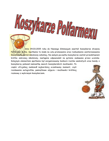 Dnia 04.03.2015 roku do Naszego Gimnazjum zawitali koszykarze drużyny Polfarmex Kutno. Spotkanie to miało na celu promowanie oraz rozbudzenie zainteresowania koszykówką wśród młodzieży szkolnej. Na samym początku koszykarze zostali przedstawieni krótko zebranej młodzieży, następnie odpowiadali na pytania zadawane przez uczniów. Kolejnym elementem spotkania był zorganizowany konkurs rzutów osobistych oraz każdy z koszykarzy pokazał namiastkę swoich koszykarskich możliwości. Po części oficjalnej nadszedł najbardziej oczekiwany moment, czyli rozdawanie autografów, pamiątkowe zdjęcia i możliwości krótkiej rozmowy z wybranym koszykarzem.
