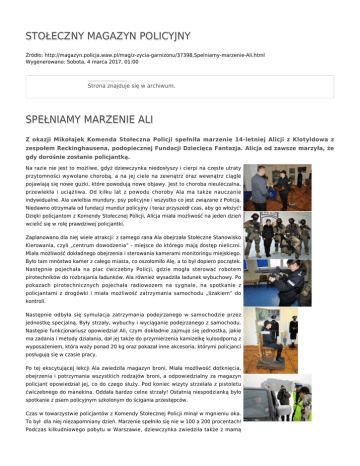 STOŁECZNY MAGAZYN POLICYJNY Źródło: http://magazyn.policja.waw.pl/mag/z-zycia-garnizonu/37398,Spelniamy-marzenie-Ali.html Wygenerowano: Sobota, 4 marca 2017, 01:00 Strona znajduje się w archiwum. SPEŁNIAMY MARZENIE ALI Z okazji Mikołajek Komenda Stołeczna Policji spełniła marzenie 14-letniej Alicji z Klotyldowa z zespołem Reckinghausena, podopiecznej Fundacji Dziecięca Fantazja. Alicja od zawsze marzyła, że gdy dorośnie zostanie policjantką. Na razie nie jest to możliwe, gdyż dziewczynka niedosłyszy i cierpi na częste utraty przytomności wywołane chorobą, a na jej ciele na zewnątrz oraz wewnątrz ciągle pojawiają się nowe guzki, które powodują nowe objawy. Jest to choroba nieuleczalna, przewlekła i uciążliwa. Od kilku lat z powodu choroby Ala ma także nauczanie indywidualne. Ala uwielbia mundury, psy policyjne i wszystko co jest związane z Policją. Niedawno otrzymała od fundacji mundur policyjny i teraz przyszedł czas, aby go włożyć! Dzięki policjantom z Komendy Stołecznej Policji, Alicja miała możliwość na jeden dzień wcielić się w rolę prawdziwej policjantki. Zaplanowano dla niej wiele atrakcji: z samego rana Ala obejrzała Stołeczne Stanowisko Kierowania, czyli „centrum dowodzenia” - miejsce do którego mają dostęp nieliczni. Miała możliwość dokładnego obejrzenia i sterowania kamerami monitoringu miejskiego. Było tam mnóstwo kamer z całego miasta, co oszołomiło Alę, a to był dopiero początek. Następnie pojechała na plac ćwiczebny Policji, gdzie mogła sterować robotem pirotechników do rozbrajania ładunków. Ala również wysadziła ładunek wybuchowy. Po pokazach pirotechnicznych pojechała radiowozem na sygnale, na spotkanie z policjantami z drogówki i miała możliwość zatrzymania samochodu „lizakiem” do kontroli. Następnie odbyła się symulacja zatrzymania podejrzanego w samochodzie przez jednostkę specjalną. Były strzały, wybuchy i wyciąganie podejrzanego z samochodu. Następie funkcjonariusz opowiedział Ali, czym dokładnie zajmuje się jednostka, jakie ma zadania i metody działania, dał jej także do przymierzenia kamizelkę kuloodporną z wyposażeniem, która waży ponad 20 kg oraz pokazał inne akcesoria, którymi policjanci posługują się w czasie pracy. Po tej ekscytującej lekcji Ala zwiedziła magazyn broni. Miała możliwość dotknięcia, obejrzenia i potrzymania wszystkich rodzajów broni, a odpowiedzialny za magazyn policjant opowiedział jej, co do czego służy. Pod koniec wizyty strzelała z pistoletu ćwiczebnego do manekina. Oddała bardzo celne strzały! Ostatnią niespodzianką było spotkanie z psem policyjnym szkolonym do ścigania przestępców. Czas w towarzystwie policjantów z Komendy Stołecznej Policji minął w mgnieniu oka. To był dla niej niezapomniany dzień. Marzenie spełniło się nie w 100 a 200 procentach! Podczas kilkudniowego pobytu w Warszawie, dziewczynka zwiedziła także z mamą warszawskie zoo oraz najważniejsze obiekty stolicy. Za spełnienie marzenia Ali składamy gorące podziękowania na ręce Komendanta Stołecznego Policji nadinsp. Mirosława Schosslera. Dziękujemy wszystkim, którzy ugościli Alę: 1. Naczelnikowi Stołecznego Stanowiska Kierowania mł. insp. Jarosławowi Konończukowi 2. Naczelnikowi Wydziału Ruchu Drogowego podinsp. Krzysztofowi Bujnowskiemu 3. Naczelnikowi Wydziału Wywiadowczo – Patrolowy mł. insp. Bogdanowi Krzyszczakowi 4. Naczelnikowi Wydziału Realizacyjnego podinsp. Jarosławowi Mikiciukowi 5. Naczelnikowi Wydziału Komunikacji Społecznej podinsp. Marcinowi Szyndlerowi. Kamila Rybicka Członek Zarządu Fundacja Dziecięca Fantazja foto asp. szt. Tomasz Oleszczuk, podkom. Ewa Szymańska-Sitkiewicz ZAŁĄCZNIKI DO STRONY Stołeczny Magazyn Policyjny - nr 01/2013 3.08 MB Ocena: 0/5 (0) Tweetnij