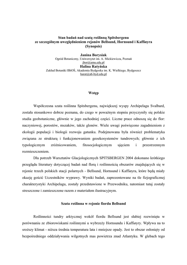 Stan badań nad szatą roślinną Spitsbergenu ze szczególnym uwzględnieniem rejonów Bellsund, Hornsund i Kaffiøyra (Synopsis) Janina Borysiak Ogród Botaniczny, Uniwersytet im. A. Mickiewicza, Poznań [email protected] Halina Ratyńska Zakład Botaniki IBiOŚ, Akademia Bydgoska im. K. Wielkiego, Bydgoszcz [email protected] Wstęp Współczesna szata roślinna Spitsbergenu, największej wyspy Archipelagu Svalbard, została stosunkowo dobrze poznana, do czego w poważnym stopniu przyczyniły się polskie studia geobotaniczne, głównie w jego zachodniej części. Liczne prace odnoszą się do flor: naczyniowej, porostów, mszaków, także glonów. Wiele uwagi poświęcono zagadnieniom z ekologii populacji i biologii rozwoju gatunku. Podejmowana była również problematyka związana ze strukturą i funkcjonowaniem geoekosystemów tundrowych; głównie z ich typologicznym zróżnicowaniem, fitosocjologicznym ujęciem i przestrzennym rozmieszczeniem. Dla potrzeb Warsztatów Glacjologicznych SPITSBERGEN 2004 dokonano krótkiego przeglądu literatury dotyczącej badań nad florą i roślinnością obszarów znajdujących się w rejonie trzech polskich stacji polarnych - Bellsund, Hornsund i Kaffiøyra, które będą miały okazję gościć Uczestników wyprawy. Wyniki badań, zaprezentowane na tle fizjograficznej charakterystyki Archipelagu, zostały przedstawione w Przewodniku, natomiast tutaj zostały streszczone i zamieszczone razem z materiałem ilustracyjnym. Szata roślinna w rejonie fiordu Bellsund Roślinności tundry arktycznej wokół fiordu Bellsund jest słabiej rozwinięta w porównaniu ze zbiorowiskami roślinnymi u wybrzeży Hornsundu i Kaffiøyry. Wpływa na to sroższy klimat - niższa średnia temperatura lata i mniejsze opady. Jest to obszar osłonięty od bezpośredniego oddziaływania wilgotnych mas powietrza znad Atlantyku. W glebach tego regionu, w porze bezdeszczowej wielokrotnie stwierdzano całkowity zanik podziemnego poziomu wodonośnego. Nad Fiordem Bellsund najlepiej geobotanicznie rozpoznanym terenem jest Calypsostranda, leżąca na przedpolu Lodowców Scotta i Renarda, będąca równiną złożoną z siedmiu podniesionych teras morskich. Roślinność arktyczna jest tam dobrze wykształcona tylko w części obszaru, a mianowicie na terasach III i IV, wyniesionych 25 - 40 m npm. Na równinie nadmorskiej i obszarach morenowych rejonu Bellsund wyróżniono 7 ekologiczno - florystycznych typów tundry, zróżnicowanych na 10 podtypów i 3 formy. Najczęściej jest tam spotykana tundra sucha porostowo - mszysta, zróżnicowana na inicjalną, deflacyjną, z dębikiem ośmiopłatkowym Dryas octopetala oraz szarą porostową z chrobotkiem Cetraria delisei. W zbadanych zbiorowiskach roślinnych łącznie zanotowano 109 taksonów mchów i 5 wątrobowców. Większość gatunków mchów wystąpiła w tundrze mszysto - trawiastej bagnistej. Gatunkami najszerzej rozpowszechnionymi były: Campylium polygamum, Calliergon turgescens var. turgescens, Ditrichum flexicaule, Drepanocladus revolvens i Oncophorus wahlenbergii. Stwierdzono kilka mchów kalcyfilnych (Bryum ovatum, Calliergon trifarium, C. turgescens, Drepanocladus revolvens, Meesia triquetra, Timmia austriaca) i nitrofilnych (Aplodon wormskjeldii, Splachnum vasculosum, Tetraplodon mnioides). Odnotowano częste występowanie licznych gatunków rzadkich na Archipelagu Svalbard, m. in.: Cnestrum schisti, Distichium hagenii, Drepanocladus badius, D. latifolius, Meesia longiseta, M. uliginosa i Rhizomnium andrewsianum. W bryoflorze ogólnej, liczącej 135 gatunków, wyróżniono 5 głównych grup geograficznych. Najliczniej był reprezentowany element arktyczno i subarktyczno-alpejski (44%), arktyczno-alpejski (33%) oraz subarktyczno-subalpejski (14%). Taksonów kosmopolitycznych było zaledwie 2%. Flora naczyniowa omawianego terenu liczy 55 gatunków (z pominięciem rodzaju Draba sp.). Do często występujących zaliczono: wierzbę polarną Salix polaris, rdest żyworodny Polygonum viviparum, rogownicę arktyczną Cerastium arcticum, lepnicę bezłodygową Silene acaulis, skalnicę naprzeciwlistną Saxifraga oppositifolia i skalnicę darniową S. caespitosa. Najbogatsza w gatunki jest tundra deflacyjna (32 taksony) i trawiasto - mszysta (28), podczas gdy najuboższa (11 gatunków) - tundra wyleżysk śnieżnych, w której fitocenozach notowano m. in.: skalnicę zwisłą Saxifraga cernua, skalnicę S. regelii, rzeżuchę Cardamine nymani, warzuchę Cochlearia officinalis i Phippsia algida. W sąsiedztwie ptasich lęgowisk były obserwowane mszyste płaty z nitrofilną skalnicą zwisłą Saxifraga cernua, 2 współwystępującą tam z mchami: Aulacomnium palustre, Brachythecium turgidum, Plagiomnium ellipticum, Polytrichum alpinum i Tomentypnum nitens. Wśród roślin naczyniowych Calypsostrandy uwagę zwraca żyworodność, jako przystosowanie do stosunkowo krótkiego sezonu wegetacyjnego. Florę taką reprezentują: wspomniany już rdest Polygonum viviparum, a także Poa alpigena var. vivipara, Poa alpina var. vivipara oraz Poa arctica var. vivipara. Szata roślinna u wybrzeży fiordu Hornsund Roślinność wokół fiordu Hornsund występuje na stosunkowo niewielkim areale, głównie w obrębie podniesionych teras morskich i na stokach masywów górskich. Tworzą ją ugrupowania powierzchniowo zdominowane przez porosty i mszaki. Duża część prac naukowych pochodzi z NW Sörkapplandu (Ziemi Południowego Przylądka), lepiej zbadanego pod względem geobotanicznym. Flora naczyniowa NW partii Sörkapp Land liczy 82 gatunki. Jest ona stosunkowo bogata, co wynika ze złożonej, jak na polarne warunki Spitsbergenu, struktury środowiska przyrodniczego. Rejon ten nie nosi śladów zlodowacenia holoceńskiego, na skutek ocieplającego oddziaływania fenów i oceanicznych wód otwartego Morza Grenlandzkiego. Z roślin rzadkich na Svalbardzie zanotowano tam: Arctagrostis latifolia, Campanula uniflora, Cerastium alpinum ssp. lan