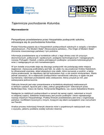 Tajemnicze pochodzenie Kolumba. Wprowadzenie Perspektywa przedstawiana przez hiszpańskie podręczniki szkolne, odnosząca się do pochodzenia Kolumba. Postać Kolumba pojawia się w hiszpańskich podręcznikach szkolnych w związku z tematem zatytułowanym „The Modern State" (Nowoczesne państwo), „The Origin of Modern State" (Korzenie nowoczesnego państwa) i tym podobne. Informacje przedstawiane są w kontekście odkryć z tego okresu oraz ich przyczyn ekonomicznych, politycznych i społecznych, postępów technologicznych i nawigacyjnych, rozwoju Portugalii i Kastylii, a także późniejszych podbojów i procesów kolonizacyjnych wraz z następującymi po nich konsekwencjami. W tym świetle zrozumiałe staje się dlaczego podręczniki nie poświęcają wiele miejsca żeglarzowi. Zazwyczaj podkreślany jest fakt, że udało mu się przekonać Królów Katolickich, by sfinansowali wyprawę, skład ekspedycji oraz statki, które wyruszyły w podróż, a także mylne przekonanie, że napotkany ląd był wybrzeżem Azji, a nie nowym kontynentem. Warto jednak zauważyć, że w większości podręczników narodowość odkrywcy w ogóle nie jest wymieniana, natomiast pochodzenie wielu zdobywców, którzy przyszli po nim, jest wskazywana jednoznacznie. Odkrycie Ameryki jest więc prezentowane w kontekście eksploracji realizowanych w tamtych czasach, łączone jest z ideą „odkryć geograficznych" dokonanych przez Bartłomieja Dias, Vasco da Gama, Ferdynanda Magellana, czy Juana Sabastiana Elcano. Następnie (w niektórych podręcznikach w ramach tej samej części, natomiast w innych w odrębnej części), dokładnie analizowany jest proces podbojów i okres największego rozwoju Imperium Hiszpańskiego. Podbój Ameryki przedstawiany jest wraz z organizacją państwa i konfliktami toczonymi z innymi, liczącymi się siłami europejskimi oraz rozruchami we Flandrii. Analiza procesu kolonizacji Ameryki otwarcie mówi o popełnionych nadużyciach oraz o wyzysku, jakiemu poddane zostały ludności rdzenne. With the support of the Lifelong Learning Programme (LLP) of the European Union.