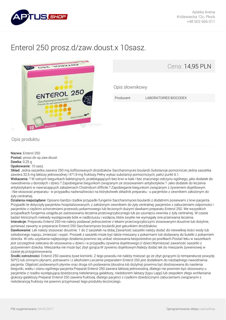Apteka Avena Królewiecka 12c, Płock +48 502 666 011 Enterol 250 prosz.d/zaw.doust.x 10sasz. Cena: 14,95 PLN Opis słownikowy Producent LABORATOIRES BIOCODEX Opis produktu Nazwa: Enterol 250 Postać: prosz.do sp.zaw.doust. Dawka: 0,25 g Opakowanie: 10 sasz. Skład: Jedna saszetka zawiera 250 mg liofilizowanych drożdżaków Saccharomyces boulardii.Substancje pomocnicze:Jedna saszetka zawiera 32,5 mg laktozy jednowodnej i 471,9 mg fruktozy.Pełny wykaz substancji pomocniczych, patrz punkt 6.1. Wskazania: ? W ostrych biegunkach bakteryjnych, przebiegających bez krwi w kale i bez znacznego odczynu ogólnego, jako dodatek do nawodnienia u dorosłych i dzieci.? Zapobieganie biegunkom związanym ze stosowaniem antybiotyków.? Jako dodatek do leczenia antybiotykami w nawracających zakażeniach Clostridium difficile.? Zapobieganie biegunkom związanym z żywieniem dojelitowym. : Nie stosować preparatu:- w przypadku nadwrażliwości na którykolwiek składnik preparatu.- u pacjentów z cewnikiem założonym do żyły centralnej. Działania niepożądane: Opisano bardzo rzadkie przypadki fungemii Saccharomyces boulardii z dodatnimi posiewami z krwi pacjenta. Przypadki te dotyczyły pacjentów hospitalizowanych, z założonym cewnikiem do żyły centralnej, pacjentów z zaburzeniami odporności i pacjentów z ciężkimi schorzeniami przewodu pokarmowego lub leczonych dużymi dawkami preparatu Enterol 250. We wszystkich przypadkach fungemia ustąpiła po zastosowaniu leczenia przeciwgrzybicznego lub po usunięciu cewnika z żyły centralnej. W czasie badań klinicznych niekiedy występowały bóle w nadbrzuszu i wzdęcia, które zwykle nie wymagały one przerwania leczenia. Interakcje: Preparatu Enterol 250 nie należy podawać jednocześnie z lekami przeciwgrzybiczymi stosowanymi doustnie lub dożylnie, ponieważ zawarty w preparacie Enterol 250 Saccharomyces boulardii jest gatunkiem drożdżaków. Dawkowanie: Lek należy stosować doustnie. 1 do 2 saszetek na dobę.Zawartość saszetki należy dodać do niewielkiej ilości wody lub osłodzonego napoju, zmieszać i wypić. Proszek z saszetki może być także mieszany z pokarmami lub dodawany do butelki z pokarmem dziecka. W celu uzyskania najlepszego działania powinno się unikać stosowania bezpośrednio po posiłkach.Postać leku w saszetkach jest szczególnie zalecana do stosowania u dzieci i w przypadku żywienia dojelitowego.U dzieci:Wymieszać zawartość saszetki z pożywieniem dziecka. Mieszanka nie może być zbyt gorąca.W żywieniu dojelitowym:Należy dodać lek do mieszanki żywieniowej w czasie jej przygotowywania. Środki ostrożności: Enterol 250 zawiera żywe komórki. Z tego powodu nie należy mieszać go ze zbyt gorącymi (o temperaturze powyżej 50ºC) lub zimnymi płynami, potrawami i z alkoholem.Leczenie preparatem Enterol 250 jest dodatkiem do niezbędnego nawodnienia pacjenta. Objętość podawanych płynów oraz droga ich podawania (doustna lub dożylna) powinna być dostosowana do nasilenia biegunki, wieku i stanu ogólnego pacjenta.Preparat Enterol 250 zawiera laktozę jednowodną, dlatego nie powinien być stosowany u pacjentów z rzadko występującą dziedziczną nietolerancją galaktozy, niedoborem laktazy (typu Lapp) lub zespołem złego wchłaniania glukozy-galaktozy.Preparat Enterol 250 zawiera fruktozę, dlatego pacjenci z rzadkimi dziedzicznymi zaburzeniami związanymi z nietolerancją fruktozy nie powinni przyjmować tego produktu leczniczego. Plik wygenerowano: 04-03-2017 Oprogramowanie sklepu: AptusShop Apteka Avena Królewiecka 12c, Płock +48 502 666 011 Prowadzenie pojazdów: Nie stwierdzono wpływu preparatu Enterol 250 na zdolność prowadzenia pojazdów mechanicznych, obsługiwania urządzeń mechanicznych i sprawność psychofizyczną. Przedawkowanie: Brak danych dotyczących przedawkowania preparatu Enterol 250. Ciąża: W badaniach na zwierzętach nie stwierdzono działania teratogennego. Nie ma klinicznych doniesień o wywoływaniu wad rozwojowych oraz działaniu uszkadzającym płód, jednak nie pozwala to na wykluczenie wszelkiego ryzyka. Dlatego ze względów bezpieczeństwa nie zaleca się stosowania preparatu w czasie ciąży.LaktacjaZe względu na brak danych nie zaleca się stosowania preparatu w okresie karmienia piersią. Plik wygenerowano: 04-03-2017 Powered by TCPDF (www.tcpdf.org) Oprogramowanie sklepu: AptusShop