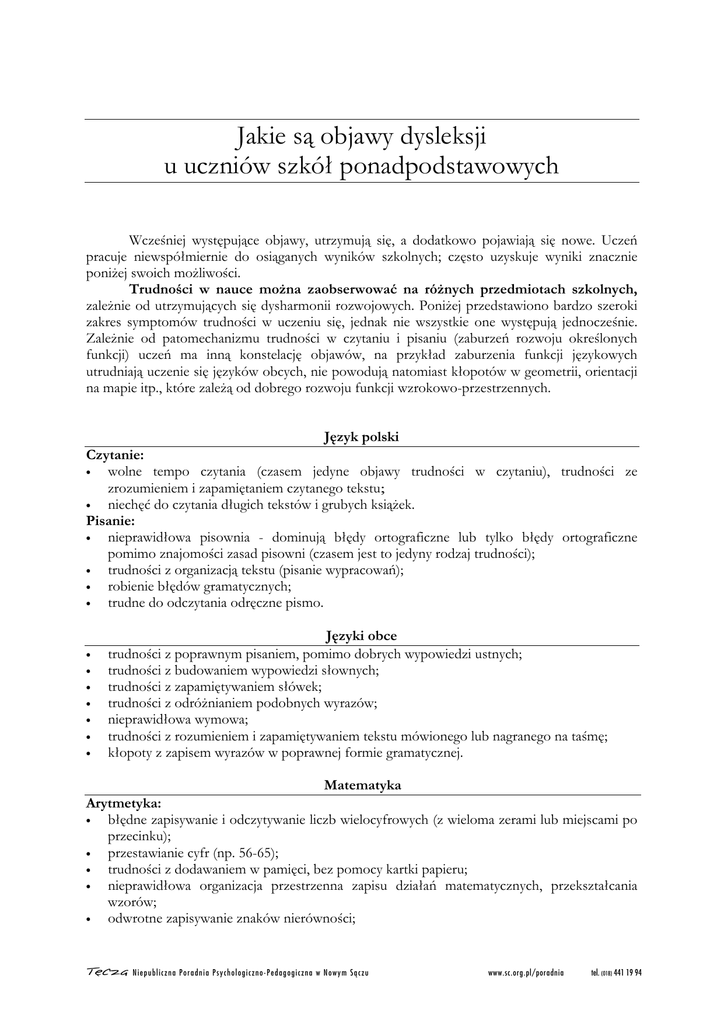 Jakie są objawy dysleksji u uczniów szkół ponadpodstawowych Wcześniej występujące objawy, utrzymują się, a dodatkowo pojawiają się nowe. Uczeń pracuje niewspółmiernie do osiąganych wyników szkolnych; często uzyskuje wyniki znacznie poniżej swoich możliwości. Trudności w nauce można zaobserwować na różnych przedmiotach szkolnych, zależnie od utrzymujących się dysharmonii rozwojowych. Poniżej przedstawiono bardzo szeroki zakres symptomów trudności w uczeniu się, jednak nie wszystkie one występują jednocześnie. Zależnie od patomechanizmu trudności w czytaniu i pisaniu (zaburzeń rozwoju określonych funkcji) uczeń ma inną konstelację objawów, na przykład zaburzenia funkcji językowych utrudniają uczenie się języków obcych, nie powodują natomiast kłopotów w geometrii, orientacji na mapie itp., które zależą od dobrego rozwoju funkcji wzrokowo-przestrzennych. Język polski Czytanie: • wolne tempo czytania (czasem jedyne objawy trudności w czytaniu), trudności ze zrozumieniem i zapamiętaniem czytanego tekstu; • niechęć do czytania długich tekstów i grubych książek. Pisanie: • nieprawidłowa pisownia - dominują błędy ortograficzne lub tylko błędy ortograficzne pomimo znajomości zasad pisowni (czasem jest to jedyny rodzaj trudności); • trudności z organizacją tekstu (pisanie wypracowań); • robienie błędów gramatycznych; • trudne do odczytania odręczne pismo. • • • • • • • Języki obce trudności z poprawnym pisaniem, pomimo dobrych wypowiedzi ustnych; trudności z budowaniem wypowiedzi słownych; trudności z zapamiętywaniem słówek; trudności z odróżnianiem podobnych wyrazów; nieprawidłowa wymowa; trudności z rozumieniem i zapamiętywaniem tekstu mówionego lub nagranego na taśmę; kłopoty z zapisem wyrazów w poprawnej formie gramatycznej. Matematyka Arytmetyka: błędne zapisywanie i odczytywanie liczb wielocyfrowych (z wieloma zerami lub miejscami po przecinku); • przestawianie cyfr (np. 56-65); • trudności z dodawaniem w pamięci, bez pomocy kartki papieru; • nieprawidłowa organizacja przestrzenna zapisu działań matematycznych, przekształcania wzorów; • odwrotne zapisywanie znaków nierówności; • Têcza Ni e p u b l i czn a P o r a d n i a P s y ch o l o g i czn o -P e d a g o g i czn a w No w y m Są czu www.sc.org.pl/poradnia tel. (018) 441 19 94 • • nieprawidłowe odczytywanie treści w zadaniach tekstowych; nieprawidłowe wykonywanie wykresów funkcji. Geometria • trudności z zadaniami angażującymi wyobraźnię przestrzenną; • niski poziom graficzny wykresów i rysunków. • • • • • • • • • • Biologia trudności z opanowaniem terminologii (dłuższe nazwy, nazwy łacińskie); problemy z organizacją przestrzenną schematów i rysunków; trudności z zapisem i zapamiętaniem łańcuchów reakcji biochemicznych, trudności z opanowaniem systematyki (hierarchiczny układ informacji). Chemia nieprawidłowe zapisywanie łańcuchów reakcji chemicznych; problemy z opanowaniem terminologii (np. nazwy i symbole pierwiastków i związków chemicznych); trudności z zapamiętywaniem danych zorganizowanych przestrzennie (np. tablica Mendelejewa). Geografia trudności z czytaniem i rysowaniem map; trudności z orientacją w czasie i przestrzeni (wskazywanie kierunków na mapie i w przestrzeni; obliczanie stref czasowych, położenia geograficznego, kąta padania słońca itp.); trudności z zapamiętywaniem nazw geograficznych. Historia i wiedza o społeczeństwie trudności z zapamiętywaniem nazw i nazwisk; zła orientacja w czasie (chronologia, daty); trudności z orientacją na mapach historycznych. Sztuka • • • • • • • trudności z czytaniem nut; trudności ze szczegółowym analizowaniem obrazów; trudności z rysowaniem (rysunek schematyczny, uproszczony) i organizacją przestrzenną prac plastycznych. Kultura fizyczna trudności z opanowaniem układów gimnastycznych (sekwencje ruchowe zorganizowane w czasie i przestrzeni); trudności w bieganiu, ćwiczeniach równoważnych; trudności w opanowaniu gier wymagających użycia piłki (tenis ziemny i stołowy, siatkówka, koszykówka itp.); niechęć do uprawiania sportów wymagających dobrego poczucia równowagi (deskorolka, windsurfing, snowboard itp.). Têcza Ni e p u b l i czn a P o r a d n i a P s y ch o l o g i czn o -P e d a g o g i czn a w No w y m Są czu www.sc.org.pl/poradnia tel. (018) 441 19 94 Specyficzne trudności pojawiające się również w pozaszkolnych obszarach aktywności: • • • • • • • • • • • • • • Uczenie się czynności użytecznych w życiu codziennym trudności z wypowiadaniem się i artykulacją złożonych wyrazów (spooneryzmy przejęzyczenia, przekręcenia nazwisk i nazw); trudności ze zautomatyzowaniem własnego podpisu; trudności z wypełnianiem formularzy; problemy z nauczeniem się prowadzenia samochodu; problemy z nauczeniem się układów tanecznych na kursie tańca. Zapamiętywanie nazw i danych stanowiących sekwencje trudności z zapamiętaniem i dokładnym przekazaniem informacji odebranych przez telefon; trudności z płynnym wymienieniem wszystkich nazw miesięcy w prawidłowej oraz odwróconej kolejności. Liczby mylenie numerów, na przykład autobusów, takich jak 95 i 59, 6 i 9; mylenie kolejności cyfr przy wykręcaniu numeru telefonicznego; mylenie dat i godzin (stąd wynikają nieporozumienia towarzyskie); trudności z zapamiętaniem numerów telefonów, danych liczbowych. Orientacja w czasie i przestrzeni kłopoty z planowaniem, organizacją i zarządzaniem czasem, materiałami oraz zadaniami; trudności z odróżnianiem strony prawej od lewej; kłopoty z czytaniem mapy lub z orientowaniem się w nieznanym terenie. Têcza Ni e p u b l i czn a P o r a d n i a P s y ch o l o g i czn o -P e d a g o g i czn a w No w y m Są czu www.sc.org.pl/poradnia tel. (018) 441 19 94