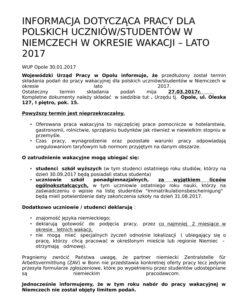 INFORMACJA DOTYCZĄCA PRACY DLA POLSKICH UCZNIÓW/STUDENTÓW W NIEMCZECH W OKRESIE WAKACJI – LATO 2017 WUP Opole 30.01.2017 Wojewódzki Urząd Pracy w Opolu informuje, że przedłużony został termin składania podań do pracy wakacyjnej dla polskich uczniów/studentów w Niemczech w okresie lato 2017. Ostateczny termin składania podań mija 27.03.2017r. Kompletne dokumenty należy składać w siedzibie tut . Urzędu tj. Opole, ul. Oleska 127, I piętro, pok. 15. Powyższy termin jest nieprzekraczalny. • Oferowana praca wakacyjna to najczęściej prace pomocnicze w hotelarstwie, gastronomii, rolnictwie, sprzątaniu budynków jak również w niewielkim stopniu w przemyśle. • Czas pracy, wynagrodzenie oraz pozostałe warunki pracy odpowiadają uregulowaniom taryfowym lub normom przyjętym na danym obszarze. O zatrudnienie wakacyjne mogą ubiegać się: • studenci szkół wyższych (w tym studenci ostatniego roku studiów, którzy na dzień 30.09.2017 będą posiadali status studenta) • uczniowie szkół ponadgimnazjalnych, za wyjątkiem liceów ogólnokształcących, w tym uczniowie ostatniego roku nauki, którzy na zaświadczeniu o wpisie na listę studentów "Immatrikulationsbescheinigung" będą mieli potwierdzenie daty zakończenia szkoły na dzień 31.08.2017. Dodatkowo uczniowie / studenci deklarują : • znajomość języka niemieckiego; • deklarują gotowość do podjęcia pracy, przez co najmniej 2 miesiące w okresie letnich wakacji, • nie mogą mieć specjalnych życzeń odnośnie lokalizacji ( ubiegający się o pracę, którzy chcą pracować w określonym mieście lub regionie Niemiec – otrzymają odmowę). Pragniemy zwrócić Państwa uwagę, że partner niemiecki Zentralstelle für Arbeitsvermittlung (ZAV) w Bonn nie przedstawia konkretnej oferty pracy lecz jedynie przesyła formularze zgłoszeniowe, które po wypełnieniu przez studentów udostępniane są niemieckim pracodawcom. Jednocześnie informujemy, że w tym roku nabór do pracy wakacyjnej w Niemczech nie został objęty limitem podań. Komplet wymaganych dokumentów stanowią: • 2 egzemplarze podania "Bewerbung 2017"; • 1 egzemplarz zaświadczenia o wpisie na listę studentów "Immatrikulationsbescheinigung" z pieczątką nagłówkową uczelni oraz imienną pieczątką osoby upoważnionej; drugi egzemplarz kandydat winien mieć dla pracodawcy niemieckiego; • 1 egzemplarz oświadczenia wyrażającego zgodę na przetwarzanie danych osobowych w związku z ubieganiem się o zatrudnienie za granicą; • 1 egzemplarz oświadczenia zawierającego informacje o pracy wakacyjnej w Niemczech wraz z oświadczeniem potwierdzającym otrzymanie, zapoznanie się i akceptację warunków zatrudnienia zawartych w informacji dla uczniów/studentów „Ferienbeschäftigung in Deutschland für ausländische Studenten, Stand: Juni 2016". • Uczniowie/studenci, którzy posiadają prawo dokumentów dołączyć kopię prawa jazdy. jazdy winni do kompletu Dokumenty do pobrania w siedzibie Wojewódzkiego Urzędu Pracy w Opolu, ul. Oleska 127, I piętro, pok. 15 lub na stronie internetowej: http://wupopole.praca.gov.pl/ Poprawnie wypełnione i kompletne dokumenty należy składać: • osobiście w Wojewódzkim Urzędzie Pracy w Opolu, Wydział Pośrednictwa Pracy i Koordynacji Systemów Zabezpieczenia Społecznego, ul. Oleska 127, I piętro, pok. 15 • lub przesłać pocztą na adres: Wojewódzki Urząd Pracy w Opolu ul. Głogowska 25c 45-315 Opole Dokumenty niekompletne lub wypełnione w sposób niepoprawny zostaną odesłane do nadawcy. Wykluczone z pośrednictwa pracy będą osoby, które: • Złożą podania równocześnie w dwóch miejscach: w miejscu swojego zamieszkania i nauki; • Mają życzenie co do lokalizacji miejsca pracy; • Złożyły podania do WUP i dodatkowo ubiegają się o pracę wakacyjną bezpośrednio przez pracodawcę niemieckiego, lub złożyły podanie bezpośrednio w ZAV Bonn. W przypadku wątpliwości informacji udziela się pod nr telefonu 77 44 16 712. Kontakt bezpośredni: Wojewódzki Urząd Pracy w Opolu Wydział Pośrednictwa Pracy i Koordynacji Systemów Zabezpieczenia Społecznego ul. Oleska 127 (wejście od strony placu manewrowego, I piętro, pok. 15) 45-231 Opole Tel. 77 44 16 712 Kontakt korespondencyjny: Wojewódzki Urząd Pracy w Opolu ul. Głogowska 25C 45-315 Opole