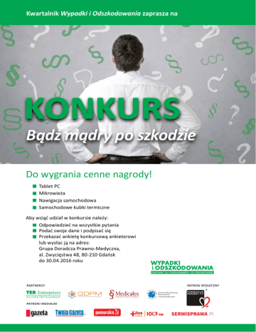 Kwartalnik Wypadki i Odszkodowania zaprasza na Bądź mądry po szkodzie Do wygrania cenne nagrody! Tablet PC Mikrowieża Nawigacja samochodowa Samochodowe kubki termiczne Aby wziąć udział w konkursie należy: Odpowiedzieć na wszystkie pytania Podać swoje dane i podpisać się Przekazać ankietę konkursową ankieterowi lub wysłac ją na adres: Grupa Doradcza Prawno-Medyczna, al. Zwycięstwa 48, 80-210 Gdańsk do 30.04.2016 roku partnerzy patron społeczny Centrum Niezależnego Orzecznictwa i Usług Medycznych patroni medialni PYTANIA KONKURSOWE 1. Który pasażer samochodu (gdy kierowca spowodował wypadek), ma prawo ubiegać się o odszkodowanie z OC tego pojazdu za szkodę osobową: tylko osoba z nim spokrewniona (np.: mąż, żona, dzieci itp.) każdy pasażer — niezależnie od stopnia pokrewieństwa i innych relacji między rannym pasażerem a kierowcą 2. Termin przedawnienia roszczeń odszkodowawczych z tytułu szkody osobowej, powstałej wskutek przestępstwa, to: 3 lata 20 lat 3. Dlaczego warto powierzyć sprawę o odszkodowanie Doradcy Odszkodowawczemu? (można zakreślić więcej niż jedną odpowiedź) bo specjalizuje się w zakresie dochodzenia odszkodowań bo posiada niezbędne doświadczenie bo współpracuje z lekarzami, rzeczoznawcami, adwokatami i radcami prawnymi bo nie pobiera opłat wstępnych — jego wynagrodzenie jest zależne od wyniku sprawy bo jest wysoce prawdopodobne, że otrzymam dzięki niemu większe świadczenie odszkodowawcze niż te, które sam bym pozyskał/a bo osoba poszkodowana nie ma czasu i zdrowia, by samemu skutecznie prowadzić sprawę bo................................................................................................................................................. Imię i nazwisko ........................................................................................................................................ Adres ....................................................................................................................................................... Telefon ............................................... e-mail .......................................................................................... Podpis ...................................................................................................................................................... Regulamin Konkursu „Bądź mądry po szkodzie” dostępny jest w siedzibie Organizatora oraz na stronach www.gdpm.pl i www.wypadkiiodszkodowania.pl. Niniejszym na warunkach określonych w ustawie z dnia 29.08.1997 roku o ochronie danych osobowych (Dz.U. nr 133 poz. 833 z późn. zmianami) oraz ustawie z dnia 18.07.2002 o świadczeniu usług drogą elektroniczną (Dz.U. 2002 nr 144 poz. 1204 z późn. zmianami), oświadczam, ze wyrażam zgodę na zbieranie i przechowywanie przez Grupę Doradczą Prawno-Medyczną, Tomasz Rosa moich danych osobowych zawartych w Ankiecie Konkursowej dla celów realizacji konkursu „Bądź mądry po szkodzie”, a także w przyszłości dla celów marketingowych dotyczących produktów i usług Grupy Doradczej Prawno-Medycznej, Tomasz Rosa oraz udostępnianie ich partnerom, podmiotom współdziałającym z Grupą Doradczą Prawno-Medyczną, Tomasz Rosa w organizowaniu akcji promocyjno-marketingowych. Wyrażam zgodę na otrzymanie informacji handlowych za pomocą środków komunikacji elektronicznej. Oświadczam, że zapoznałem się z Regulaminem Konkursu „Bądź mądry po szkodzie”, akceptuję jego treść, a podane przeze mnie informacje są prawdziwe. Grupa Doradcza Prawno-Medyczna wydawca kwartalnika Wypadki i Odszkodowania al. Zwycięstwa 48, 80-210 Gdańsk tel.: +48 58 303 46 38 faks: +48 58 320 75 49 e-mail: [email protected] www.gdpm.pl infolinia: 801 120 020