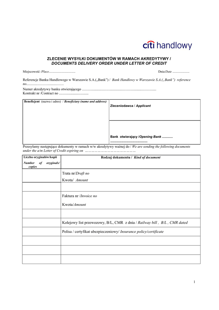 ZLECENIE WYSYŁKI DOKUMENTÓW W RAMACH AKREDYTYWY / DOCUMENTS DELIVERY ORDER UNDER LETTER OF CREDIT Miejscowość /Place................................. Dnia/Date ..................... Referencje Banku Handlowego w Warszawie S.A.(„Bank”) / Bank Handlowy w Warszawie S.A.(„Bank”) reference no.......................................... Numer akredytywy banku otwierającego ................................................................................... Kontrakt nr /Contract no ................................. Beneficjent (nazwa i adres) / Beneficiary (name and address) Zleceniodawca / Applicant Bank otwierający /Opening Bank ............ .................................. Przesyłamy następujące dokumenty w ramach w/w akredytywy ważnej do / We are sending the following documents under the a/m Letter of Credit expiring on ………………………………………… Liczba oryginałów/kopii Number of copies Rodzaj dokumentu / Kind of document oryginals/ Trata nr/Draft no Kwota/ Amount Faktura nr /Invoice no Kwota/Amount Kolejowy list przewozowy, B/L, CMR z dnia / Railway bill , B/L , CMR dated Polisa / certyfikat ubezpieczeniowy/ Insurance policy/certificate 1 Dyspozycje odnośnie dokumentów prezentowanych w ramach akredytywy niepotwierdzonej przez Bank Handlowy w Warszawie S.A. („Bank”) / Instructions re. the documents presented under Letter of Credit, unconfirmed by Bank Handlowy w Warszawie S.A (“Bank”) Prosimy o zbadanie załączonych dokumentów z warunkami ww. akredytywy/ We hereby ask for examination the attached documents against terms and conditions of a/m Letter of Credit TAK 1 / YES 1 NIE / NO 1 Niniejszym, przyjmujemy do wiadomości, że przyjęcie lub sprawdzenie i przesłanie dokumentów przez Bank, nie nakłada na Bank żadnego obowiązku honorowania prezentacji lub negocjowania, ani też nie stanowi honorowania lub negocjowania (podstawa – Art 12 UCP600). Niezależnie od opinii Banku odnośne zgodności prezentacji, przyjmujemy do wiadomości, iż bank otwierający lub bank potwierdzający akredytywę lub bank wyznaczony (inny niż Bank) może prezentować, w oparciu o własną praktykę w tym zakresie, inne stanowisko odnośnie faktu wystąpienia zgodnej prezentacji. / 1 We hereby acknowledge, that receipt or examination and forwarding of documents by the Bank, does not make the Bank liable to honour or negotiate, nor does it constitute honour or negotiation (acc. to Art 12 of UCP600). Irrespective of Bank’s opinion re. complying presentation, We hereby acknowledge, that issuing bank or confirming bank or nominated bank (other than Bank) may present, based on own practices, the different position on complying presentation. Dyspozycje odnośnie sposobu przesłania dokumentów do banku otwierającego/ Instructions re. the manner of sending the documents to the issuing bank O ile warunki akredytywy nie stanowią inaczej, polecamy Bankowi przesłanie otrzymanych w ramach ww. Akredytywy dokumentów („Dokumenty”) do Banku otwierającego Akredytywę/ Unless otherwise stipulated in the Credit, we instruct the Bank to send the documents presented under Letter of Credit (the Documents) to the issuing bank as follows: pocztą kurierską zorganizowaną przez Bank („Kurier”2), na koszt Beneficjenta/ by courier (“Courier”2) arranged by the Bank to the Beneficiary’s cost. pocztą poleconą zwykłą („Poczta”2) by registered post(„Post”2) lub/or pocztą poleconą priorytetową („Poczta”2) 2 priority registered post („Post” ), na koszt Beneficjenta/ to the Beneficiary’s cost Dokumenty zawierające pełny set Konosamentu / Polisy ubezpieczeniowej / Certyfikatu ubezpieczeniowego należy przesłać/ The documents including full set of Bill of Lading / Insurance Policy/ Insurance Certificate should be sent: w jednej przesyłce / in one lot w dwóch przesyłkach / in two lots 2 Niniejszym przyjmujemy do wiadomości, że Kurier/Poczta nie świadczy usług przewozu papierów wartościowych i w związku z tym dokumenty mogą być wysłane przez Bank Handlowy w Warszawie S.A. za pośrednictwem Kuriera/Poczty wyłącznie w charakterze zwyklej przesylki tj. bez wskazania wartości i w granicach odpowiedzialności Kuriera/Poczty (w przypadku niewykonania lub nieprawidłowego wykonania umowy przewozu) przewidzianej dla zwykłych przesyłek. Akceptujemy wszelkie ryzyka związane ze sposobem przesłania dokumentów i zwalniamy Bank Handlowy w Warszawie S.A. z odpowiedzialności z tytułu wyboru Kuriera, niewykonania lub nieprawidłowego wykonania umowy przewozu przez Kuriera/Pocztę/ 2 We hereby acknowledge that the courier/post does not provide securities transport services and therefore the documents presented under Letter of Credit can be sent by the Bank via the courier/post only as an ordinary courier mailing without indicating the value and to the extent of courier’s liability (for failure to perform or improper performance of the transport agreement) envisaged for ordinary courier/post; We accept all the risks related to the document sending method and release the Bank from liability for courier selection and for failure to perform or improper performance of the transport agreement by the courier/post 1 . Kwotą w walucie/ amount in FCY , lub/or Równowartością kwoty dokumentów w złotych / Documents amount converted into PLN 2 prosimy uznać nasz r-k nr / please credit to our a/c no. ...…………………………………………..…………. (prosimy podać nr r-ku i symbol waluty / please give your a/c no and currency) prowadzony w / held with ..………..........………………………………………………………………………………………………………..…………………… 1. Kwotą należnych prowizji i opłat prosimy obciążyć n/ r-k ( prosimy podać symbol waluty i numer r-ku) ........................................ / Charges & fees due please collect from our a/c no. (Please give 