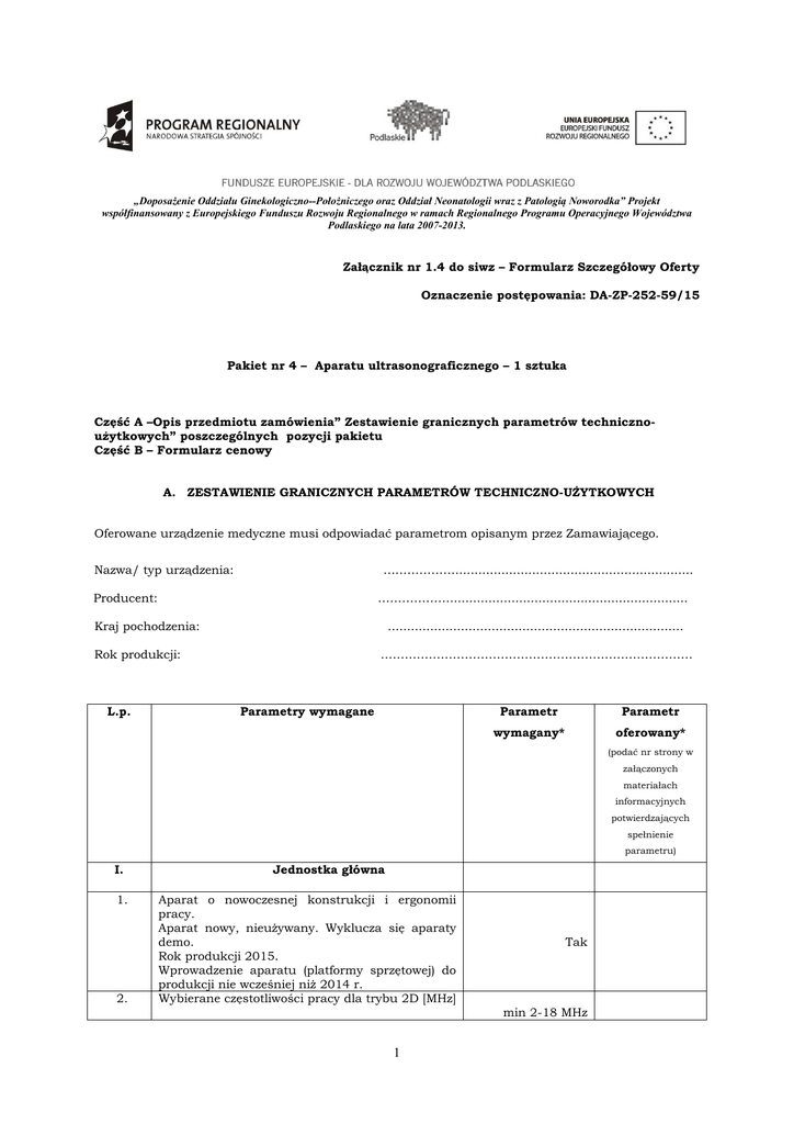 „Doposażenie Oddziału Ginekologiczno--Położniczego oraz Oddział Neonatologii wraz z Patologią Noworodka” Projekt współfinansowany z Europejskiego Funduszu Rozwoju Regionalnego w ramach Regionalnego Programu Operacyjnego Województwa Podlaskiego na lata 2007-2013. Załącznik nr 1.4 do siwz – Formularz Szczegółowy Oferty Oznaczenie postępowania: DA-ZP-252-59/15 Pakiet nr 4 – Aparatu ultrasonograficznego – 1 sztuka Część A –Opis przedmiotu zamówienia” Zestawienie granicznych parametrów technicznoużytkowych” poszczególnych pozycji pakietu Część B – Formularz cenowy A. ZESTAWIENIE GRANICZNYCH PARAMETRÓW TECHNICZNO-UŻYTKOWYCH Oferowane urządzenie medyczne musi odpowiadać parametrom opisanym przez Zamawiającego. Nazwa/ typ urządzenia: ……………….............................................................. Producent: ……………….............................................................. Kraj pochodzenia: ............................................................................. Rok produkcji: L.p. …………………………………………………………………… Parametry wymagane Parametr Parametr wymagany* oferowany* (podać nr strony w załączonych materiałach informacyjnych potwierdzających spełnienie parametru) I. 1. 2. Jednostka główna Aparat o nowoczesnej konstrukcji i ergonomii pracy. Aparat nowy, nieużywany. Wyklucza się aparaty demo. Rok produkcji 2015. Wprowadzenie aparatu (platformy sprzętowej) do produkcji nie wcześniej niż 2014 r. Wybierane częstotliwości pracy dla trybu 2D [MHz] Tak min 2-18 MHz 1 3. Dynamika systemu w dB 4. Technologia cyfrowa – min. ośmiokrotny system przetwarzania z cyfrową obróbką i cyfrowym przetwarzaniem wiązki. Ilość niezależnych kanałów Odbiorczych Ilość niezależnych, identycznych gniazd dla różnego typu głowic obrazowych 5. 6. > 260 dB 7. Monitor LCD, wielkość ekranu (przekątna) [cal]. 8. Rozdzielczość monitora LCD 9. Możliwość regulacji położenia monitora prawo/lewo, przód/tył, góra/dół. 10. 11. 12. Tak min 70 000 min 3 min 19” min 1280x1024 LCD: Tak Chowana pod pulpit klawiatura alfanumeryczna z przyciskami funkcyjnymi. Przyciski funkcyjne z możliwością programowania różnych funkcji pomiarowych i obrazowych w zależności od rodzaju badania Regulacja wysokości panelu sterowania min. 20 cm 13. Waga aparatu max. 80 kg 14. Możliwość nagrywania i odtwarzania dynamicznego obrazów (tzw. Cine loop) – min. 3000 obrazów. Tak Tak Tak Tak 15. 16. Zintegrowany z aparatem system archiwizacji obrazów. 17. System archiwizacji z możliwością zapisu formatach co najmniej JPEG, AVI, DICOM. Eksportowanie na nośniki przenośne DVD/CD 18. Eksportowanie na nośniki przenośne Pen-Drive 19. Eksportowanie na nośniki przenośne HDD 20. Napęd CD/DVD wbudowany w aparat 21. Wewnętrzny dysk twardy HDD 22. Ustawienia wstępne użytkownika (presety) dla aplikacji i głowic Tak Tak w Tak Tak Tak Tak Tak Tak Tak 23. Wideoprinter cyfrowy czarno-biały 24. Możliwość wydrukowania bezpośrednio z aparatu raportu z badań z opisem i zdjęciami Tak Porty USB 2.0 lub 3.0 wbudowane w aparat (do archiwizacji na pamięci typu Pen-Drive) – min. 2 porty USB Tak Tak 25. 26. Wbudowane w aparat wyjście cyfrowe DVI 27. Wbudowane w aparat wyjście S-VHS Tak Tak 2 28. II. 29. 30. 31. 32. 33. Wbudowane w aparat wyjście Ethernet 10/100 Mbps lub więcej Tak Tryb 2D (B-mode) Maksymalna głębokość penetracji od czoła głowicy [cm] – min. 34 cm Suwaki wzmocnienia strefowego – min. 8 suwaków Zakres bezstratnego powiększania obrazu zamrożonego, a także obrazu z pamięci CINE – podać wartość powiększenia min. 20 Porównywanie min. 8 ruchomych obrazów 2D tego samego pacjenta Dynamiczne ogniskowanie nadawania min. 4 stref Tak Tak Tak Tak Tak 34. 35. 36. 37. 38. Maksymalna szybkość odświeżania trybie B-Mode – min. 400 obr/sek obrazu w Tak Automatyczna optymalizacja parametrów obrazu 2D, PWD przy pomocy jednego przycisku (2D wzmocnienie, PWD skala, linia bazowa Oprogramowanie zwiększające dokładność, eliminujące szumy i cienie obrazu – wymienić Obrazowanie harmoniczne na wszystkich zaoferowanych głowicach Wykorzystanie „Inversia fazy” techniki inwersji fazy – Tak Tak Tak typ Tak 39. Obrazowanie trapezowe 40. Obrazowanie rombowe 41. Obrazowanie typu Compound Imaging lub równoważne Zastosowanie technologii obrazowania „nakładanego” przestrzennego, wielokierunkowego w trakcie nadawania i odbioru Tryb Duplex (2D + PWD) Tak Tak 42. 43. Tak Tak Tak 44. Technologia przetwarzania sygnału oparta na RAW DATA pozwalająca po zamrożeniu obrazu na zmianę min. wzmocnienia, dynamiki. 45. Tryb M 46. Tryb kolorowego tkankowego 47. Doppler ciągły min. 18 m/sek dla zerowego kąta III. 48. 49. 50. 51. 52. i spektralnego Dopplera Tryb spektralny Doppler Pulsacyjny (PWD) z HPRF min. 3częstotliwości dla każdej głowicy Zakres prędkości Doppler Pulsacyjny (PWD) min. 14 m/sek przy zerowym kącie Podać wielkość bramki Dopplerowskiej [mm] – min. 1-20 mm Regulacja uchylności wiązki dopplerowskiej – min. +/- 25 stopni Możliwość przesunięcia linii bazowej Dopplera spektralnego na zamrożonym obrazie Korekcja kąta bramki dopplerowskiej- podać w stopniach 3 Tak Tak Tak Tak Tak Tak Tak Tak Tak 53. 54. 55. IV. Technologia optymalizująca zapis spektrum w czasie rzeczywistym Tak Automatyczny obrys spektrum na obrazie rzeczywistym i zamrożonym dla trybu Dopplera Tak Zakres prędkości Doppler Pulsacyjny (PWD) w trybie TRIPLEX min. 12 m/sek przy zerowym kącie. Tryb Doppler Kolorowy (CD-CFM) Min. 3 częstotliwości dla każdej głowicy 56. Prędkość odświeżania dla CD min. 300 klatek/sek 57. Regulacja uchylności pola Dopplera Kolorowego – min. +/- 25 stopni Regulacja ilość map kolorów – podać ilość Tak Tak 58. Tak Tak 59. V. VI. 60. 61. Optymalizacja zapisów CD w zależności od badanego miejsca anatomicznego 