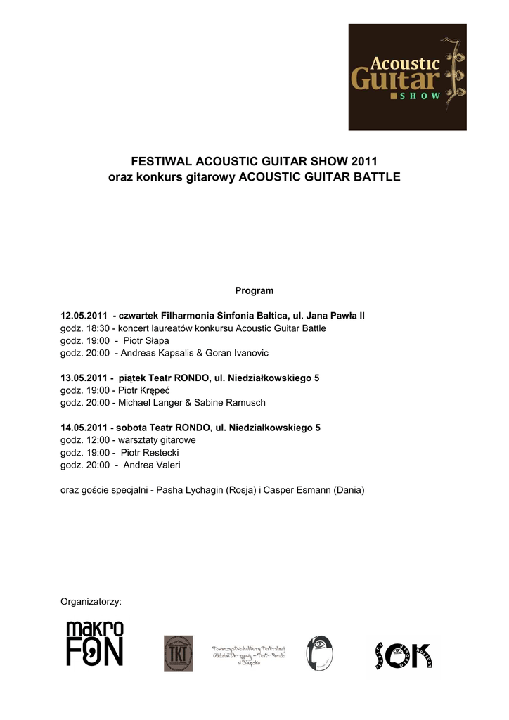 FESTIWAL ACOUSTIC GUITAR SHOW 2011 oraz konkurs gitarowy ACOUSTIC GUITAR BATTLE Program 12.05.2011 - czwartek Filharmonia Sinfonia Baltica, ul. Jana Pawła II godz. 18:30 - koncert laureatów konkursu Acoustic Guitar Battle godz. 19:00 - Piotr Słapa godz. 20:00 - Andreas Kapsalis & Goran Ivanovic 13.05.2011 - piątek Teatr RONDO, ul. Niedziałkowskiego 5 godz. 19:00 - Piotr Krępeć godz. 20:00 - Michael Langer & Sabine Ramusch 14.05.2011 - sobota Teatr RONDO, ul. Niedziałkowskiego 5 godz. 12:00 - warsztaty gitarowe godz. 19:00 - Piotr Restecki godz. 20:00 - Andrea Valeri oraz goście specjalni - Pasha Lychagin (Rosja) i Casper Esmann (Dania) Organizatorzy: