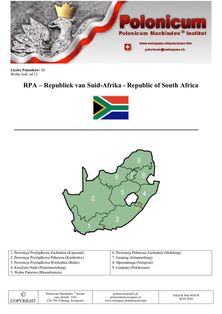Polskie znaki pamięci w RPA Liczba Poloników: 11 Wolny kod: od 12 RPA – Republiek van Suid-Afrika - Republic of South Africa 1. Prowincja Przylądkowa Zachodnia (Kapsztad) 2. Prowincja Przylądkowa Północna (Kimberley) 3. Prowincja Przylądkowa Wschodnia (Bisho) 4. KwaZulu-Natal (Pietermaritzburg) 5. Wolne Państwo (Bloemfontein) © COPYRIGHT Polonicum Machindex ® Institut case postale 1182 CH-1701 Fribourg, Szwajcaria 6. Prowincja Północno-Zachodnia (Mafeking) 7. Gauteng (Johannesburg) 8. Mpumalanga (Nelspruit) 9. Limpopo (Polokwane) [email protected] [email protected] www.swisspass.ch/polonicum.htm Edyta & Stan MACH 06.03.2010 Polskie znaki pamięci w RPA Polskie znaki pamięci w Prowincja Przylądkowa Zachodnia Machindex Miejscowość Forma Poświęcony ZA11 Kapsztad - Cape Town Opera Nico Malan Projekt arch. Polaka Polskie znaki pamięci w Gauteng Machindex Miejscowość Forma Poświęcony ZA01 Johannesburg Pomnik Ofiary Katynia ZA02 Johannesburg Polski Ogród pamięci ZA03 Johannesburg Groby ZA04 Johannesburg - w Witraż kosciele Regina Mundi w Soweto Johannesburg Kaplica Norwood - Ivy Rd. ZA05 żołnierze polscy 2 korpusu z II wojny światowej ZA06 Johannesburg Klasztor Sióstr Służebniczek w Lyndhurst ZA07 Johannesburg Muzeum Military History Museum - Saxonwold © COPYRIGHT Polonicum Machindex ® Institut case postale 1182 CH-1701 Fribourg, Szwajcaria [email protected] [email protected] www.swisspass.ch/polonicum.htm Edyta & Stan MACH 06.03.2010 Polskie znaki pamięci w RPA Polskie znaki pamięci w KwaZulu-Natal Machindex Miejscowość Forma Poświęcony ZA10 Durban Port i dworzec morski Machindex Miejscowość Forma Poświęcony ZA08 Oudtshoorn Muzeum W muzeum - wystawa pamiatek z obozu polskich sierot ZA09 Oudtshoorn Kaplica kaplica dziekczynna z kopia obrazu Czarnej Madonny Projekt arch. Polaka Zgłoszenie: Romanowicz Andrzej:ZA01- ZA11 Tous les droits d'auteur de cette publication sont réservés à Polonicum Machindex® Institut. Les textes sur support électronique sont soumis aux mêmes règles que les textes imprimés. Warunki współpracy: Osoba dokonująca zgłoszenia Polonika wyraża tym samym zgodę na nieodpłatne wykorzystanie podanych informacji, fotografii i innych dokumentów przez Polonicum MACHindex ® Institut w opracowaniach drukowanych, internetowych, CD-ROM jak i wszelkich innych formach dyfuzji dot. Poloników. © COPYRIGHT Polonicum Machindex ® Institut case postale 1182 CH-1701 Fribourg, Szwajcaria [email protected] [email protected] www.swisspass.ch/polonicum.htm Edyta & Stan MACH 06.03.2010