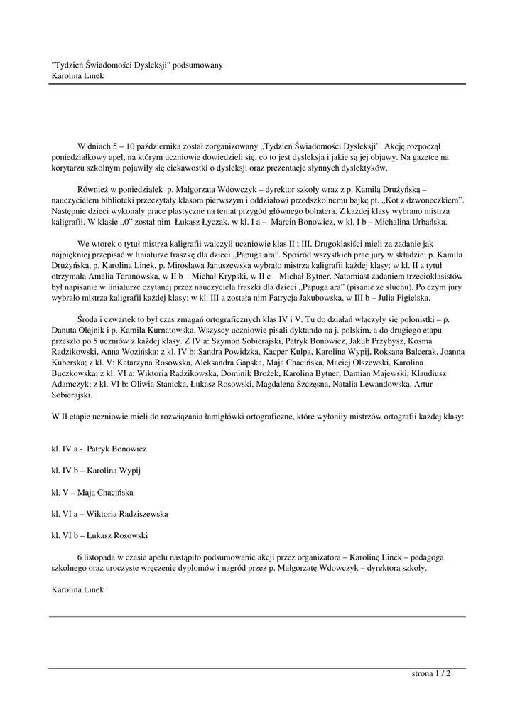 "Tydzień Świadomości Dysleksji" podsumowany Karolina Linek W dniach 5 – 10 października został zorganizowany „Tydzień Świadomości Dysleksji”. Akcję rozpoczął poniedziałkowy apel, na którym uczniowie dowiedzieli się, co to jest dysleksja i jakie są jej objawy. Na gazetce na korytarzu szkolnym pojawiły się ciekawostki o dysleksji oraz prezentacje słynnych dyslektyków. Również w poniedziałek p. Małgorzata Wdowczyk – dyrektor szkoły wraz z p. Kamilą Drużyńską – nauczycielem biblioteki przeczytały klasom pierwszym i oddziałowi przedszkolnemu bajkę pt. „Kot z dzwoneczkiem”. Następnie dzieci wykonały prace plastyczne na temat przygód głównego bohatera. Z każdej klasy wybrano mistrza kaligrafii. W klasie ,,0” został nim Łukasz Łyczak, w kl. I a – Marcin Bonowicz, w kl. I b – Michalina Urbańska. We wtorek o tytuł mistrza kaligrafii walczyli uczniowie klas II i III. Drugoklasiści mieli za zadanie jak najpiękniej przepisać w liniaturze fraszkę dla dzieci „Papuga ara”. Spośród wszystkich prac jury w składzie: p. Kamila Drużyńska, p. Karolina Linek, p. Mirosława Januszewska wybrało mistrza kaligrafii każdej klasy: w kl. II a tytuł otrzymała Amelia Taranowska, w II b – Michał Krypski, w II c – Michał Bytner. Natomiast zadaniem trzecioklasistów był napisanie w liniaturze czytanej przez nauczyciela fraszki dla dzieci „Papuga ara” (pisanie ze słuchu). Po czym jury wybrało mistrza kaligrafii każdej klasy: w kl. III a została nim Patrycja Jakubowska, w III b – Julia Figielska. Środa i czwartek to był czas zmagań ortograficznych klas IV i V. Tu do działań włączyły się polonistki – p. Danuta Olejnik i p. Kamila Kurnatowska. Wszyscy uczniowie pisali dyktando na j. polskim, a do drugiego etapu przeszło po 5 uczniów z każdej klasy. Z IV a: Szymon Sobierajski, Patryk Bonowicz, Jakub Przybysz, Kosma Radzikowski, Anna Wozińska; z kl. IV b: Sandra Powidzka, Kacper Kulpa, Karolina Wypij, Roksana Balcerak, Joanna Kuberska; z kl. V: Katarzyna Rosowska, Aleksandra Gapska, Maja Chacińska, Maciej Olszewski, Karolina Buczkowska; z kl. VI a: Wiktoria Radzikowska, Dominik Brożek, Karolina Bytner, Damian Majewski, Klaudiusz Adamczyk; z kl. VI b: Oliwia Stanicka, Łukasz Rosowski, Magdalena Szczęsna, Natalia Lewandowska, Artur Sobierajski. W II etapie uczniowie mieli do rozwiązania łamigłówki ortograficzne, które wyłoniły mistrzów ortografii każdej klasy: kl. IV a - Patryk Bonowicz kl. IV b – Karolina Wypij kl. V – Maja Chacińska kl. VI a – Wiktoria Radziszewska kl. VI b – Łukasz Rosowski 6 listopada w czasie apelu nastąpiło podsumowanie akcji przez organizatora – Karolinę Linek – pedagoga szkolnego oraz uroczyste wręczenie dyplomów i nagród przez p. Małgorzatę Wdowczyk – dyrektora szkoły. Karolina Linek strona 1 / 2 "Tydzień Świadomości Dysleksji" podsumowany Karolina Linek strona 2 / 2