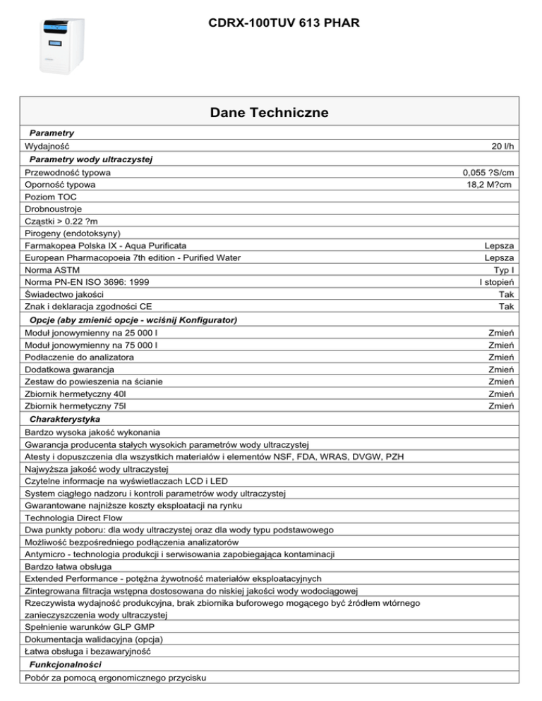 CDRX-100TUV 613 PHAR Dane Techniczne Parametry Wydajność 20 l/h Parametry wody ultraczystej Przewodność typowa Oporność typowa Poziom TOC Drobnoustroje Cząstki > 0.22 ?m Pirogeny (endotoksyny) Farmakopea Polska IX - Aqua Purificata European Pharmacopoeia 7th edition - Purified Water Norma ASTM Norma PN-EN ISO 3696: 1999 Świadectwo jakości Znak i deklaracja zgodności CE 0,055 ?S/cm 18,2 M?cm Lepsza Lepsza Typ I I stopień Tak Tak Opcje (aby zmienić opcje - wciśnij Konfigurator) Moduł jonowymienny na 25 000 l Moduł jonowymienny na 75 000 l Podłaczenie do analizatora Dodatkowa gwarancja Zestaw do powieszenia na ścianie Zbiornik hermetyczny 40l Zbiornik hermetyczny 75l Charakterystyka Bardzo wysoka jakość wykonania Gwarancja producenta stałych wysokich parametrów wody ultraczystej Atesty i dopuszczenia dla wszystkich materiałów i elementów NSF, FDA, WRAS, DVGW, PZH Najwyższa jakość wody ultraczystej Czytelne informacje na wyświetlaczach LCD i LED System ciągłego nadzoru i kontroli parametrów wody ultraczystej Gwarantowane najniższe koszty eksploatacji na rynku Technologia Direct Flow Dwa punkty poboru: dla wody ultraczystej oraz dla wody typu podstawowego Możliwość bezpośredniego podłączenia analizatorów Antymicro - technologia produkcji i serwisowania zapobiegająca kontaminacji Bardzo łatwa obsługa Extended Performance - potężna żywotność materiałów eksploatacyjnych Zintegrowana filtracja wstępna dostosowana do niskiej jakości wody wodociągowej Rzeczywista wydajność produkcyjna, brak zbiornika buforowego mogącego być źródłem wtórnego zanieczyszczenia wody ultraczystej Spełnienie warunków GLP GMP Dokumentacja walidacyjna (opcja) Łatwa obsługa i bezawaryjność Funkcjonalności Pobór za pomocą ergonomicznego przycisku Zmień Zmień Zmień Zmień Zmień Zmień Zmień Komunikaty na czytelnym ekranie LCD: satatusy, przewodność i temperatura wody, liczniki czasu pracy i poboru wody komunikaty o serwisach i terminach serwisów, przekroczonej przewodności i braku wody Sygnalizacja na panelu LED doskonale widoczna niezależnie od kąta i odległości patrzenia: włączony, prawidłowa przewodność, przekroczona przewodność, niskie ciśnienie Rejestracja i możliwość wydruku za pomocą dołączonego oprogramowania: ilości poborów, daty, godziny i czasów poborów, przewodności i temperatury wody Monitorowanie zużycia części wymiennych Kontrola czasu pracy lampy UV Układ pomiarowy Pełnofunkcjonalny konduktometr klasy laboratoryjnej Wiarygodny pomiar zgodny z normą PN-ISO 27888:1999 Wyznaczona stała K czujnika konduktometrycznego Czytelny, podświetlany wyświetlacz LCD Jedyny na rynku ma możliwość wzorcowania przez Urząd Miar Elektrody z metalu szlachetnego Przepływowa cela konduktometryczna Technologie Filtracja sedymentacyjna dokładna Filtracja adsorbcyjna Odwrócona osmoza Podwójna wymiana jonowa Mikrofiltracja Dezynfekcja UV Ultrafiltracja Typowe zastosowania Produkcja leków PCR Analizatory biochemiczne Sekwencjonowanie DNA Aplikacje analityczne Hodowle tkanek i komórek Badania DNA Przygotowywanie pożywek mikrobiologicznych Autoklawy Produkcja odczynników chemicznych i biochemicznych Mycie i przepłukiwanie szkła laboratoryjnego Chemia immuno-cytologiczna Analizy Woda zasilająca Woda wodociągowa Wymiary i waga Wymiary zbiornika Wysokość Szerokość Głębokość Waga www.labopol.com.pl 400mm wys. x 275mm śred. 425 mm 250 mm 445 mm 20 kg