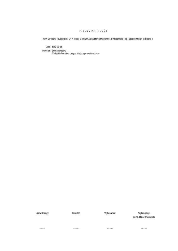 PRZEDMIAR ROBÓT MAN Wrocław - Budowa linii OTK relacji Centrum Zarządzania Miastem ul. Strzegomska 148 - Stadion Miejski al.Śląska 1 Data: 2012-02-26 Inwestor: Gmina Wrocław Wydział Informatyki Urzędu Miejskiego we Wrocławiu Sprawdzający: Inwestor: Wykonawca: Wykonujący: dr inż. Rafał Królikowski .......... .......... .......... .......... Zbiór: PT_1_2012_PR MAN Wrocław - Budowa linii OTK relacji Centrum Zarządzania Miastem ul. Strzegomska 148 - Stadion Zuzia (C) DataComp 1994-2002 26/02/12 Przedmiar Robót Podstawa nakładu, opis pozycji, wyliczenie ilości robót Ilość Krot. Jedn. 1 Budowa rurociągu kablowego i dróg kablowych 1.001 TPSA 39/202/1 Ręczne wciąganie rur kanalizacji wtórnej, otwór wolny, rury w zwojach, 1xFi·32·mm 12 m 1.002 TPSA 39/204/4 Montaż złączy rur polietylenowych w kanalizacji, rury HDPE Fi·40·mm, złączki skręcane redukcyjne ZRs40/32 4 szt 1.003 KNR 508/705/2 Montaż drabinek siatkowych (proste, narożne, rozgałęźne, redukcyjne), przykręcanie do gotowych otworów, szerokości 300·mm 9 m 1.004 KNR 508/701/2 Montaż na gotowym podłożu konstrukcji wsporczych przykręcanych, ciężar do 1·kg, na ścianie, ilość mocowań 2 (wsporniki) 4 szt 1.005 KNR 508/803/2 Mechaniczne wykonanie ślepych otworów i wnęk w betonie, głębokość do 8·cm i średnicy do 20·mm 12 szt 1.006 KNR 508/809/4 Osadzenie w podłożu kołków, kołki kotwiące M10, na ścianie 12 szt 1.007 KNR 508/705/1 Montaż koryt PCV 60x130mm 4 m 130 m 1.008 TPSA 39/205/4 (1) Układanie rur osłonowych trudnopalnych w budynkach, wąż trudnopalny na drabinkach, nakłady liczone na 1·m 1.009 KNR 508/803/5 Mechaniczne wykonanie ślepych otworów i wnęk w betonie, objętość do 0.50·dm3 1 szt 1.010 KNR 202/333/1 Uszczelnianie ręczne kitem trwale plastycznym przepustów ścian zewnętrznych i wewnętrznych, styki poziome lub pionowe 8 m 2 Montaż kabla światłowodowego 2.001 TPSA 39/504/1 Wciąganie kabli światłowodowych do kanalizacji wtórnej z rur HDPE Fi·40·mm metodą pneumatyczną tłoczkową, rury z warstwą poślizgową, kabel w odcinkach 2·km 2,691 km 2.002 TPSA 39/503/1 Wciąganie kabli światłowodowych do kanalizacji wtórnej z rur HDPE Fi·32·mm metodą pneumatyczną tłoczkową, rury z warstwą poślizgową, kabel w odcinkach 2·km 3,169 km 2.003 TPSA 39/501/1 Wciąganie kabala światłowodowego ro rur trudnopalnych HFXP25 0,130 km 2.004 TPSA 39/205/3 (1) Układanie kabla światłowodowego w korycie PCV 8 m 2.005 TPSA 39/613/1 Montaż stelaży zapasów kabli światłowodowych, montaż w studni 11 szt 2.006 TPSA 39/613/2 Montaż stelaży zapasów kabli światłowodowych, montaż w komorze kablowej 1 szt 2.007 TPSA 39/613/4 Montaż skrzynek zapasów kabli światłowodowych, montaż w komorze kablowej 1 szt 2.008 TPSA 39/701/5 Montaż przełącznic światłowodowych, przełącznica stojakowa szeroka, jeden łącznik centrujący i jeden patchcord 2 szt 2.009 TPSA 39/701/6 Montaż przełącznic światłowodowych, przełącznica stojakowa szeroka, dodatek za każdy następny jeden łącznik centrujący i jeden patchcord 70 szt 2.010 TPSA 39/701/1 Montaż szuflady zapasu tub kabla liniowego 19'' 1U 2 szt 2.011 TPSA 39/701/1 Montaż szuflady zapasu patchcordów 19'' 1U 2 szt 2.012 TPSA 39/601/3 Montaż złączy przelotowych na kablach światłowodowych ułożonych w kanalizacji kablowej, kabel tubowy, mufa zapinana, jeden spajany światłowód 3 złącze 2.013 TPSA 39/601/4 Montaż złączy przelotowych na kablach światłowodowych ułożonych w kanalizacji kablowej, kabel tubowy, mufa zapinana, dodatek za każdy następny spajany światłowód 105 złącze 2.014 TPSA 39/207/7 Uszczelnianie otworów rurociągu 40 mm, uszczelki Jackmoon, otwór z 1 kablem 14 otwór 2.015 TPSA 39/207/7 Uszczelnianie otworów rurociągu 32 mm, uszczelki Jackmoon, otwór z 1 kablem 12 otwór 2.016 TPSA 39/607/3 Montaż złączy końcowych kabli światłowodowych, kabel tubowy, przełącznica stojakowa, jeden spajany światłowód 2 złącze 2.017 TPSA 39/607/4 Montaż złączy końcowych kabli światłowodowych, kabel tubowy, przełącznica stojakowa, dodatek za każdy następny spajany światłowód 70 złącze 1 odcinek 35 odcinek 2.018 TPSA 39/901/7 Pomiary reflektometryczne linii światłowodowych, pomiary końcowe odcinka regeneratorowego z przełącznicy, mierzony 1 światłowód 2.019 TPSA 39/901/8 Pomiary reflektometryczne linii światłowodowych, pomiary końcowe odcinka regeneratorowego z przełącznicy, dodatek za każdy następny zmierzony światłowód strona nr 2 Zbiór: PT_1_2012_PR MAN Wrocław - Budowa linii OTK relacji Centrum Zarządzania Miastem ul. Strzegomska 148 - Stadion Podstawa nakładu, opis pozycji, wyliczenie ilości robót Zuzia (C) DataComp 1994-2002 26/02/12 Ilość Krot. Jedn. 2.020 TPSA 39/902/3 Pomiary tłumienności optycznej linii światłowodowych metodą transmisyjną, pomiar przeprowadzany razem z innymi pomiarami, mierzony 1 światłowód 1 odcinek 2.021 TPSA 39/902/4 Pomiary tłumienności optycznej linii światłowodowych metodą transmisyjną, pomiar przeprowadzany razem z innymi pomiarami, dodatek za każdy następny zmierzony światłowód 35 odcinek 2.022 TPSA 39/903/3 Pomiary tłumienności odbicia wstecznego (reflektancji) złączek światłowodowych, pomiar przeprowadzany razem z innymi pomiarami, mierzony 1 światłowód 2 zakończ 2.023 TPSA 39/903/4 Pomiary tłumienności odbicia wstecznego (reflektancji) złączek światłowodowych, pomiar przeprowadzany razem z innymi pomiarami, dodatek za każdy następny zmierzony światłowód 70 zakończ 3 Koszt kabla światłowodowego 3.001 Kabel światłowodowy ZW-NOTKtsd72J 6 740 m 4 Montaż szafy 19'' do GDPN (Stadion) i zasilania 4.001 KNR 507/201/2 Montaż szafy 19'' 45U 1000x800mm R= 0,955 M= 1,000 S= 1,000 1 szt 4.002 TPSA 39/205/4 (1) Układanie rur osłonowych trudnopalnych w budynkach, wąż trudnopalny na drabinkach, nakłady liczone na 1·m 42 m 4.003 KNR 508/204/5