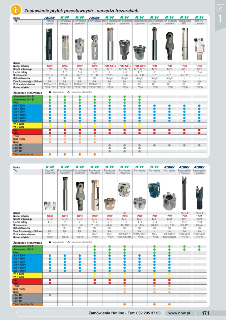 Zestawienie płytek przestawnych - narzędzi frezarskich Marka Typ 0 Frezy do rowków ß ß ß ß ß ß ß ß 0 Frezy kątowe Frezy kątowe Frezy kątowe Frezy do kopiowania Frezy do kopiowania Frezy do kopiowania Frezy do kopiowania Frezy do kopiowania Frezy trzpieniowe z chwytem z gwintem z chwytem z gwintem z otworem z chwytem z gwintem HPC Nazwa Igel Numer artykułu 17501 17505 17507 17510 17613-17614 Strona w katalogu 17.16 17.17 17.17 17.17 17.25 Liczba ostrzy 1 1-5 2-4 1-2 2 Średnica mm 20 - 32 20 - 40 16 - 25 20 - 40 12 - 20 Kąt nastawienia 90 90 90 90 okrągłe Kanał doprowadzający chłodziwo tak tak tak tak tak Płytka wieloostrzowa APKT/APHX APKT/APHX APKT/APHX APKT/APHX RD.. Numer artykułu 17809-17811 17809-17811 17809-17811 17809-17811 17824 Zalecenia stosowania W Aluminium < 10% Si Aluminium > 10% Si Miedź Stal < 520N Stal < 750N Stal < 900N Stal < 1100N Stal < 1200N Stal < 1400N VA < 900N VA > 900N GG GGG Tytan Stop tytanu Nikiel < 55HRC < 60HRC < 67HRC Tworzywa sztuczne W W W W W W W W W W W W W W W W Marka Typ = odpowiednie W ß Frezy HPC z otworem Nazwa Numer artykułu Strona w katalogu Liczba ostrzy Średnica mm Kąt nastawienia Kanał doprowadzający chłodziwo Płytka wieloostrzowa Numer artykułu 17660 17.29 4-5 – – tak ZD… 17660 Zalecenia stosowania W Aluminium <10% Si Aluminium >10% Si Miedź Stal < 520N Stal < 750N Stal < 900N Stal < 1100N Stal < 1200N Stal < 1400N VA < 900N VA > 900N GG GGG Tytan Stop tytanu Nikiel < 55HRC < 60HRC < 67HRC Tworzywa sztuczne W W W W W W W W X W W W W W W W W W W W W W W W W W W W W W W W W W W W W W W W W W W W ß ß ß Frezy toroidalne Frezy toroidalne Frezy kątowe z chwytem z gwintem z chwytem = odpowiednie W W W W W W X 17614-17616 17.25-17.26 4-7 42 - 100 okrągłe tak RD.. 17824 W W W W W W W W W W W W W W W W W W W W W W W W W W W W W W W W W W W W W W W W W W W W W W W W Frezy HPC z gwintem 17618 17.27 2 8 - 25 okrągłe tak RC… 17618 17618 17.27 2 8 - 20 okrągłe tak RC… 17618 17660 17.29 2 25- 32 – tak ZD… 17660 17660 17.29 2-4 – – tak ZD… 17660 W W W W W W W W W W W W W W W W W W W W W W W W W W W W W W W W W W W W 0 Frezy kątowe = warunkowo odpowiednie W W W W W W W W W W W W W W W W 17619 17.28 2 8 -20 90 tak LC… 17619 17613-17615 17.25-17.26 2-6 15 - 42 okrągłe tak RD.. 17824 ß 17619 17.28 2 8 - 20 90 tak LC… 17619 17662 17.32 2-4 20 - 32 90 tak SOMT 17662 ß ß ß ß Frezy kątowe z otworem Frezy kątowe z otworem Frezy kątowe Frezy kątowe 17662 17.32 5-7 40 - 63 90 tak SOMT 17662 Igel 17753 17742 17.33 17.32 3-6 4-9 40 - 100 40 - 125 90 90 – tak APKT/APHX SDMT/SDHT 17809-17811 17833 17745 17.33 3-4 40 - 63 90 – TPKN 17858 0 0 Frezy wgłębne Frezy wgłębne z chwytem z gwintem Alu-Cut 17755 17560 17.34 17.20 6 - 12 2-3 40 - 160 20- 42 90 90 tak tak APKT/APHX VCGT/VPGT 17809-17811 17563 Alu-Cut 17561 17.21 2-3 20 - 42 90 tak VCGT/VPGT 17563 = warunkowo odpowiednie W W W W W W W W W W W W W W W W W W W W W W W W W W W W W W W W W W W W W W W W W W W W W W W W W W W W W W W W W W W W W W W W W W W W W W W W W W W W W W W W W W W W W W W W W W W W W W Zamówienia Hotline - Fax: 032 205 37 63 www.hhw.pl 17.1 1 1 Zestawienie płytek przestawnych - narzędzi frezarskich 0 ß Frezy wgłębne Frezy do z otworem płaszczyzn Marka Typ 0 0 0 Frezy do Frezy do Frezy do płaszczyzn płaszczyzn płaszczyzn Nazwa Alu-Cut Numery artykułu 17562 17700 17707 Strona z katalogu 17.21 17.29 17.30 Liczba ostrzy 2-3 4-6 4-8 Średnica mm 42- 125 50 - 100 52 - 125 Kąt nastawienia 90 45 – Kanał doprowadzający chłodziwo tak – – OCKX/CRKX/XCKC Płytka wieloostrzowa VCGT/VPGT SPE… Numery artykułu 17563 17850/17852 17817 W Zalecenia stosowania Aluminium < 10% Si Aluminium > 10% Si Miedź Stal < 520N Stal < 750N Stal < 900N Stal < 1100N Stal < 1200N Stal < 1400N VA < 900N VA > 900N GG GGG Tytan Stop tytanu Nikiel < 55HRC < 60HRC < 67HRC Tworzywa sztuczne W W W W W W W W W W W W 0 Frezy do fazowania Marka Typ Nazwa Numer artykułu 17527 Strona z katalogu 17.19 Liczba ostrzy 1-2 Średnica mm 15 - 35 Kąt nastawienia 30-45-60 Kanał doprowadzający chłodziwo – Płytka wieloostrzowa TCMT Numer artykułu 17856 17.2 0 Frezy do Frezy do 17529 17.19 1-3 10 - 42,3 45 – SCMT 18578 W Zalecenia stosowania Aluminium <10% Si Aluminium >10% Si Miedź Stal < 520N Stal < 750N Stal < 900N Stal < 1100N Stal < 1200N Stal < 1400N VA < 900N VA > 900N GG GGG Tytan Stop tytanu Nikiel < 55HRC < 60HRC < 67HRC Tworzywa sztuczne = odpowiednie W W W W W W W W W W www.hhw.pl W W W W W W W W W W X 17720 17.31 3-8 40 - 160 45 – SEHT 17838 17728 17.31 4 - 13 50 - 250 45 – SEKN 17840 ß ß ß ß Frezy do płaszczyzn Frezy do płaszczyzn Frezy do płaszczyzn Frezy do fazowania 0 Frezy do fazowania ß frezy zużywalne frezy zużywalne regulowane regulowane 17722 17515 17750 17760 17525 17526 17.30 17.18 17.33 17.34 17.18 17.18 4 - 12 2-4 3-9 6-9 1 1 50 - 160 25 - 40 50 - 200 33 - 90 16 - 25 5 - 31 15-30-45-60-75 uniwersalne uniwersalne 45 75 75 tak – – – – – SNEX/SNMX APKT/APHX APKT/APHX APKT/APHX TCMT TCMT/SCMT 17847 17809-17811 17809-17811 17809-17811 17856 17856/18578 W W W W W W W W W W W W W W W W W W W W W W W W W W W W W ß Pogłębiacze wsteczne 0 Wytaczaki W W W W W W W W W W W W W 0 Wytaczaki 0 Wytaczaki W W W W W W W W W W W W W W W W W W W W W W W W W W W W W W W W W W W W W W W W W W W W W W W W W W W W W W W W W W W W W W W W W W W W W W W W W W W W W W W W W W W W W ß Frezyobwiedniowe 0 Frezytarczowe 0 Frezytarczowe 0 Frezytarczowe Naddatek na obróbkę z kołnierzem A-CUT 17570 17575 17576 17577 17880 17780 17782 17793/17794 17.22 17.23 17.24 17.24 17.35 17.37 17.38 17.39 1 1 1 2 3 4 - 12 6 - 16 6 - 12 18 - 33 9,8 - 31,8 10 - 33 16 - 42 7,9 - 23 63 - 250 63 - 160 100 - 160 90 – – – – 90 – – – tak tak tak tak – – – AIMC/AIMJ/AIPV CC… CC… CC… CC… – SNHX SNHX 18850-18851 18850/18851 18850/18851 18850/18851 17905-17911 17785/17786 17785/17786 18687 -18696 X 17534 17.2